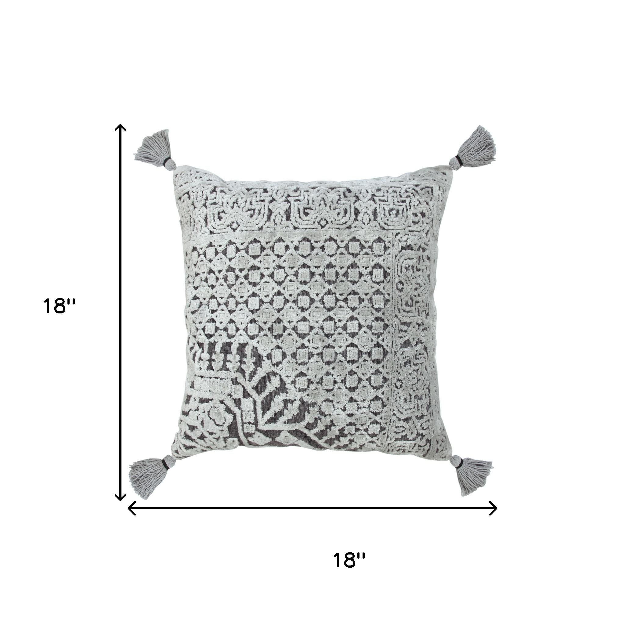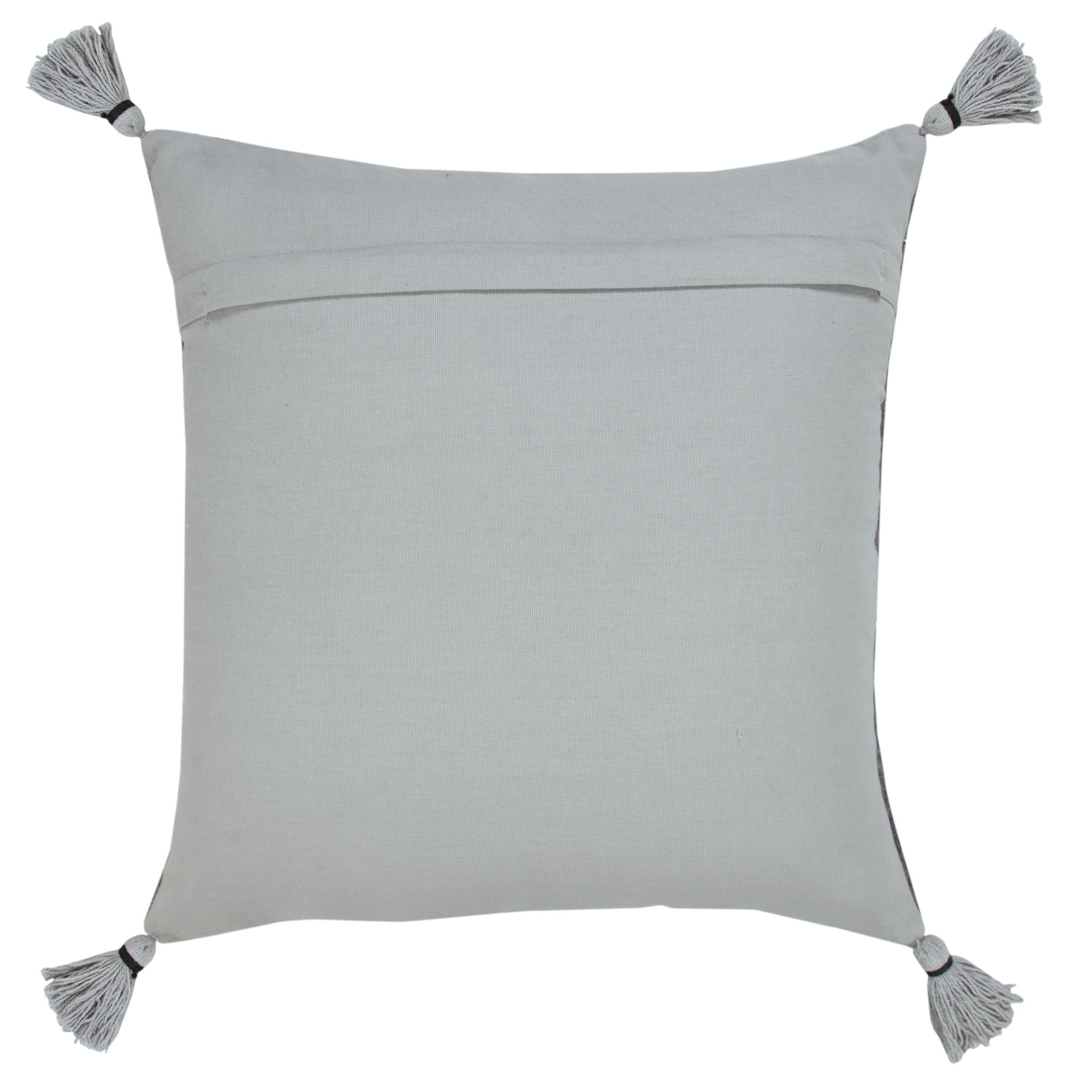 Add an air of fashion to your room and rejuvenate the space with this cute and fashionable 18-inch gray and silver geometric viscose throw pillow cover with tassels. Durable gray and silver viscose has been used to give this pillow cover a beautiful look that will stand the test of time. Fun and decorative tassels add some high end and hand-crafted textural designer touches. Pillow covers are a good idea for anyone that loves to decorate or accent their space with color and texture. Combine with your own fill or insert to add decoration and dimension to your favorite chair, accent your sofa, or to use as part of your bed ensemble. 18.00-inch h x 18.00-inch w x 0.25-inch d.