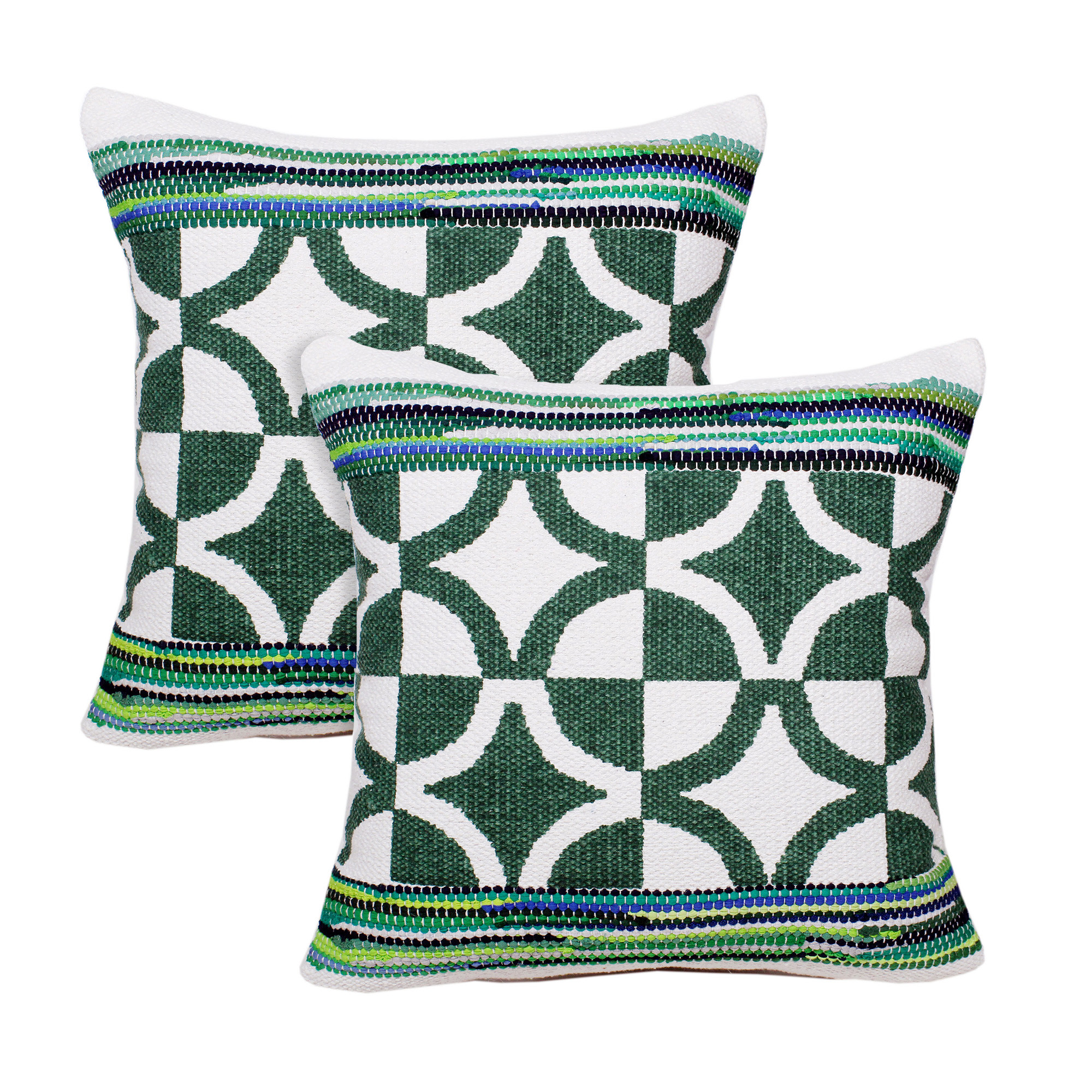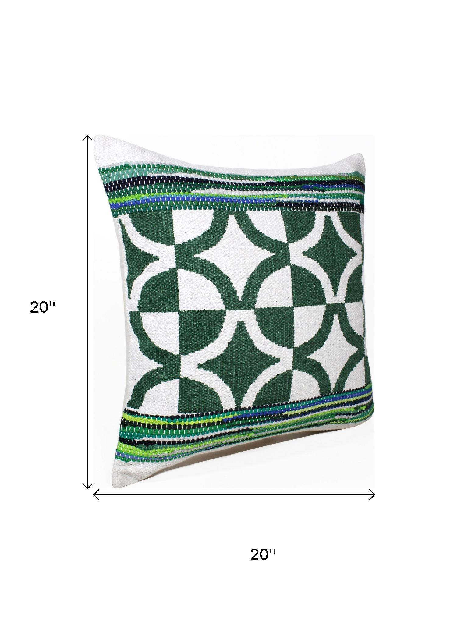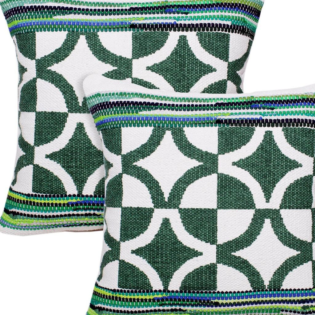 Unique and decorative, this comfortable set of two 20-inch green and ivory geometric cotton blend throw pillows will leave a lasting impression. These great looking soft decorative pillows are expertly made of durable and long lasting cotton blend in a green and ivory coloration. Super soft and built to hold its shape, this polyfill-filled pillow is a great option. For anyone that loves to decorate or accent their space with color and texture. Decorative throw pillows not only add color and dimension to your space but can be comfy and supportive when you are lounging and cuddling as well. 20.00-inch h x 20.00-inch w x 0.50-inch d.
