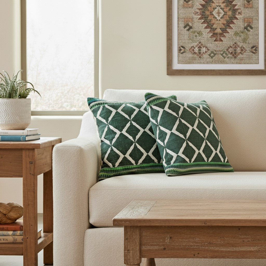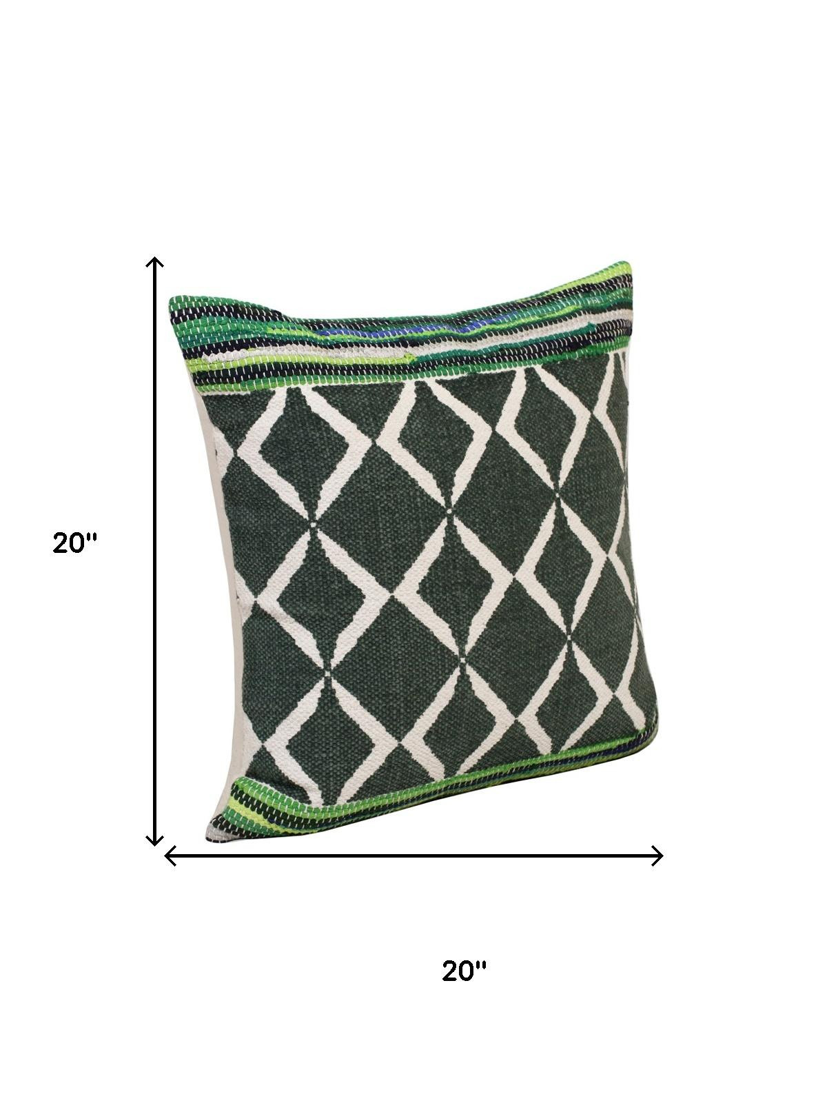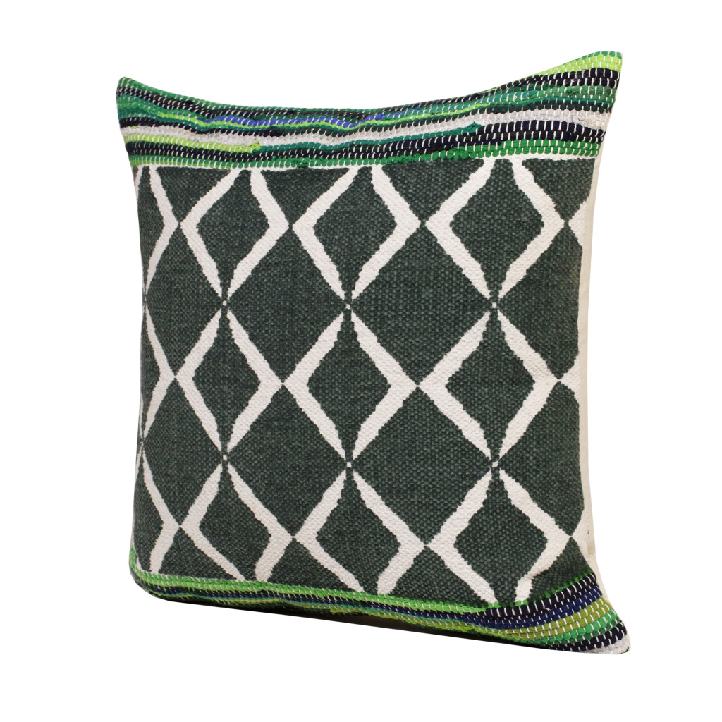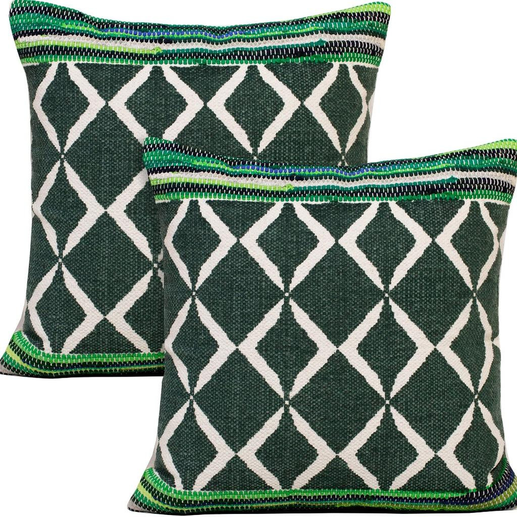 This set of two 20-inch green and ivory geometric cotton blend throw pillows will add a beautiful decorative accent to your decor. The green and ivory coloring of the extremely durable and long lasting cotton blend pillows will add dimension and texture to your space. This soft polyfill filled pillow not only is decorative but made to be comfy and cozy all day long. Decorative pillows are a great way to change up the look and feel of your space easily and quickly. Decorative throw pillows not only add color and dimension to your space but can be comfy and supportive when you are lounging and cuddling as well. 20.00-inch h x 20.00-inch w x 0.50-inch d.
