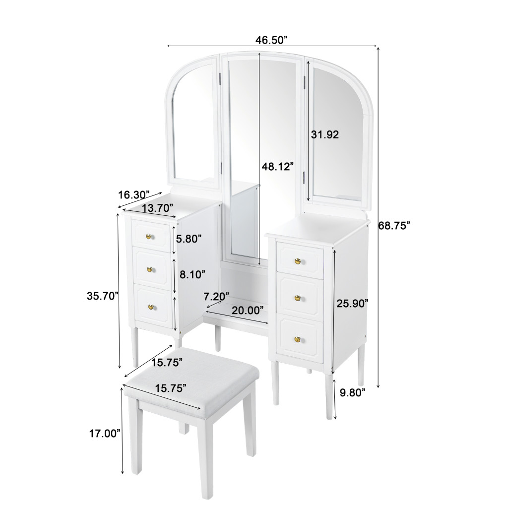Say goodbye to cluttered counters and hello to a streamlined beauty routine with our 47-inch white wood mirrored vanity table. This table features mirrored glass which will help add some reflective and sparkling beauty to your daily routine. Made with the highest quality construction from mix of durable and genuine solid wood and manufactured woods. Upgrade your beauty routine with our high-quality vanity table. Start enjoying a more efficient and stylish beauty routine with this fabulous vanity!. 68.75-inch h x 46.50-inch w x 16.30-inch d.