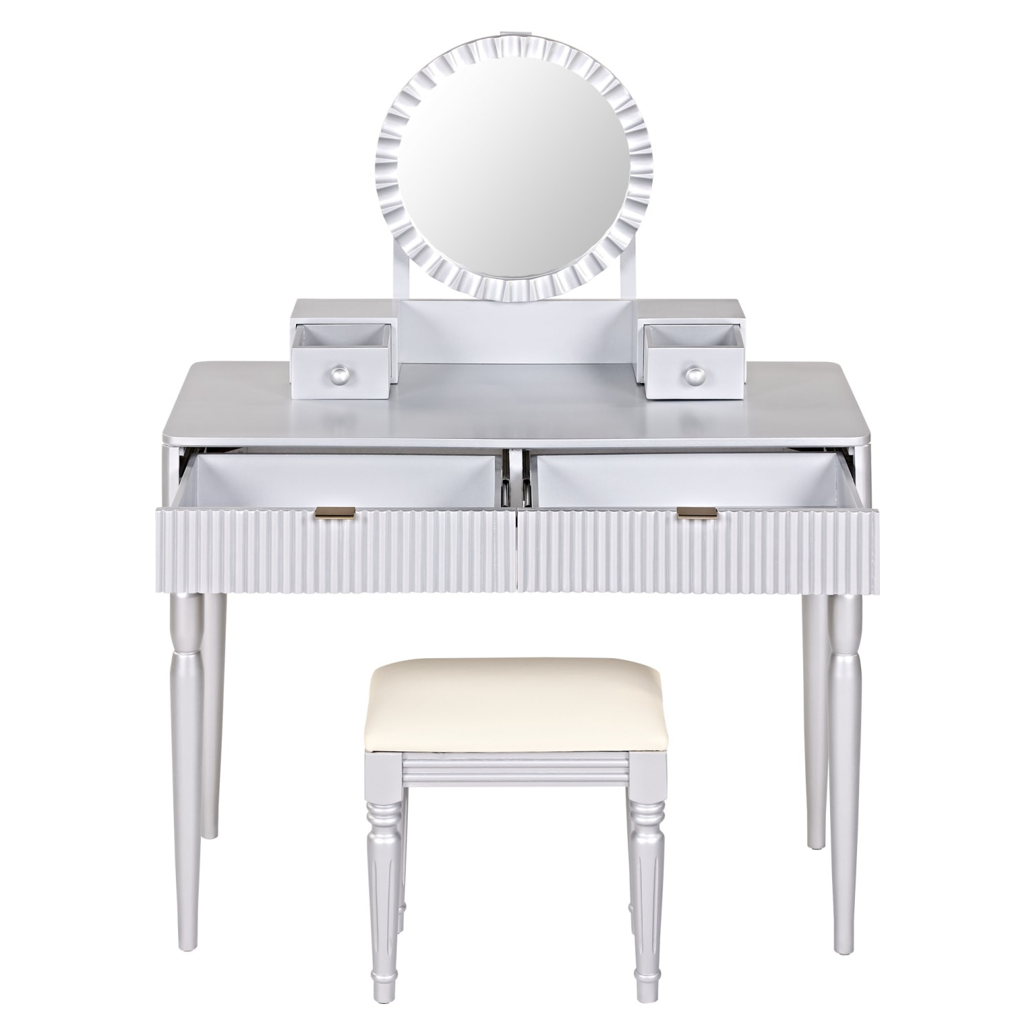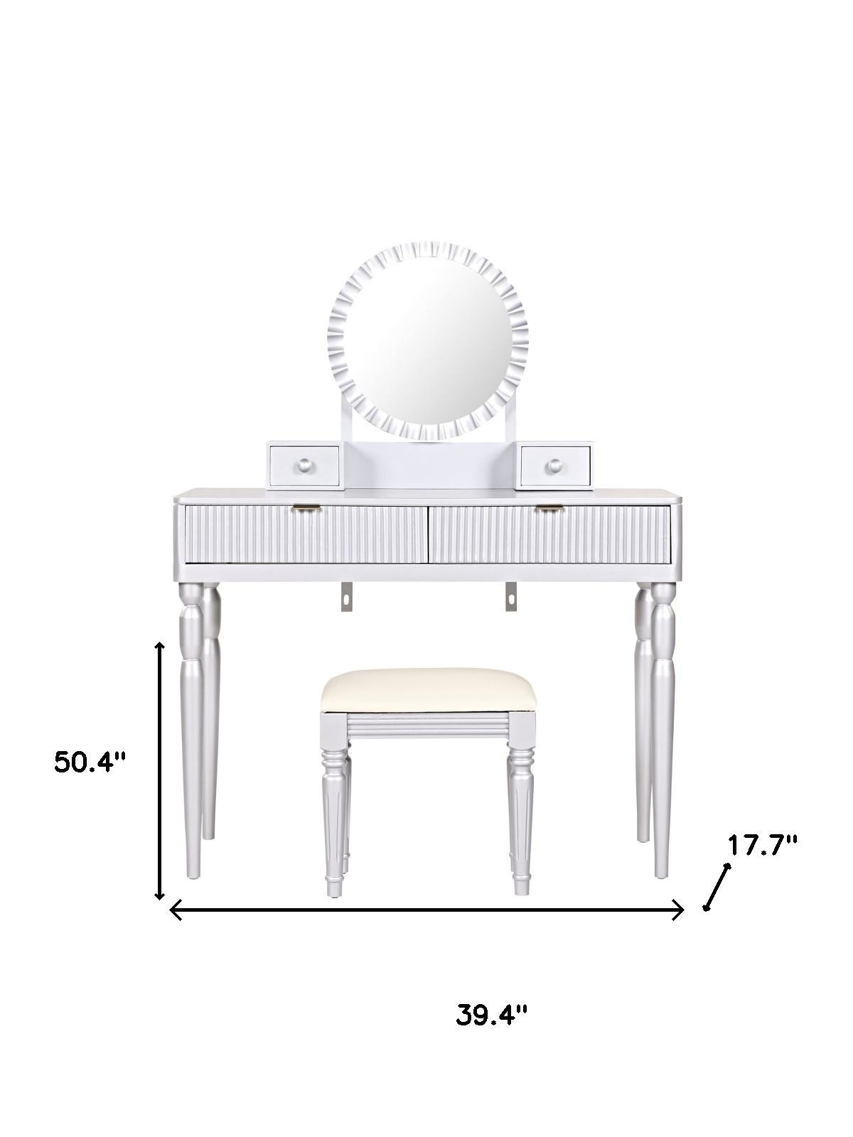 Transform your morning routine with our stylish and functional 39-inch silver wood mirrored vanity table. Not only does it add reflection and lustrous beauty to you bedroom or bathroom, as a bonus, this vanity table is also easy to clean. This table features a beautiful blend of solid wood and manufactured woods. Say goodbye to cluttered bathroom counters and hello to our stunning vanity table. Get ready in style with our beautifully designed vanity table!. 50.40-inch h x 39.40-inch w x 17.70-inch d.