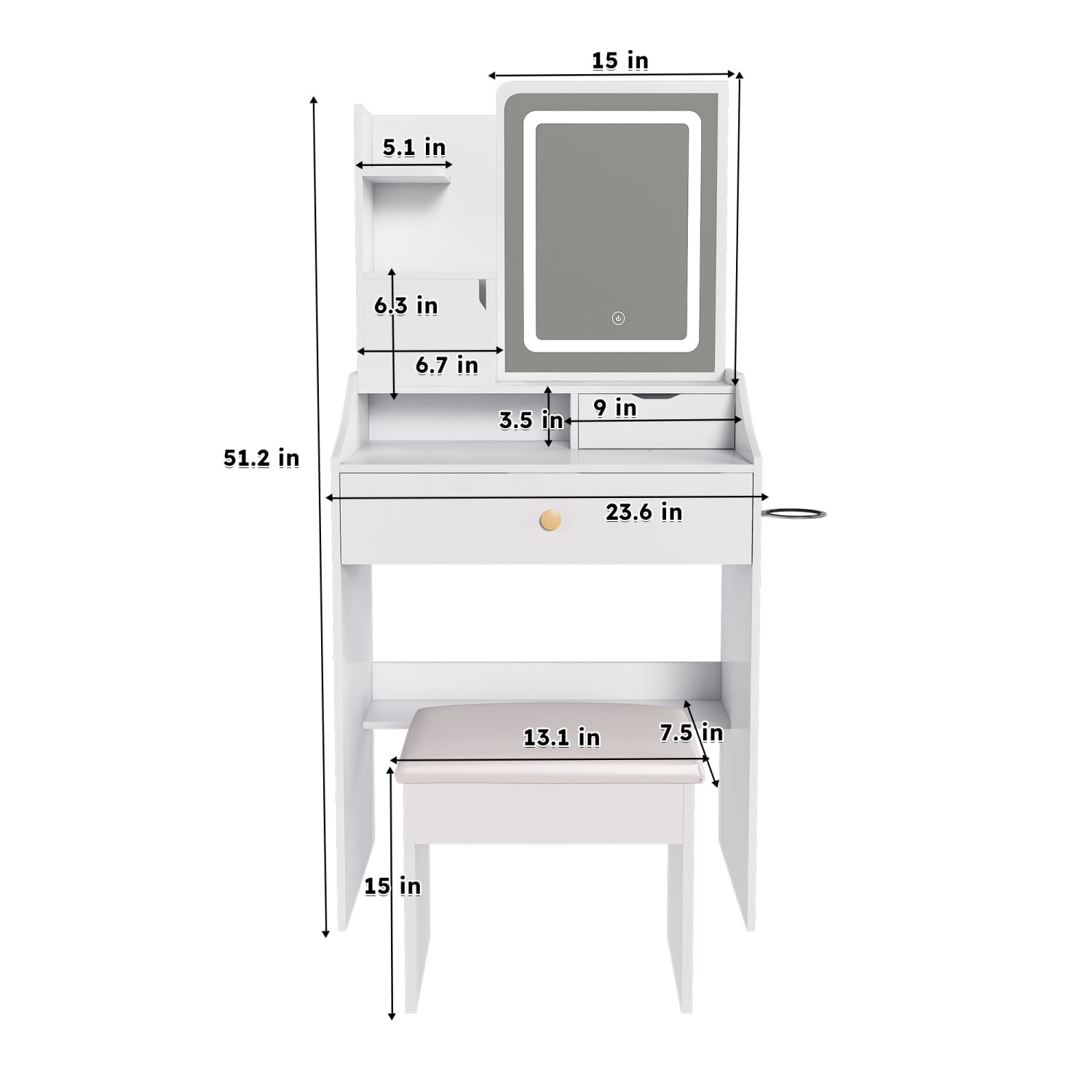 Get ready in style with our luxury 43-inch white wood mirrored vanity table. Add a touch of modern style to your bedroom or bathroom with this fabulous sparkling mirrored vanity table. Made with the highest quality construction from mix of durable and genuine solid wood and manufactured woods. Experience a new level of luxury and convenience. Start enjoying a more efficient and stylish beauty routine with this fabulous vanity!. 53.10-inch h x 43.30-inch w x 17.70-inch d.