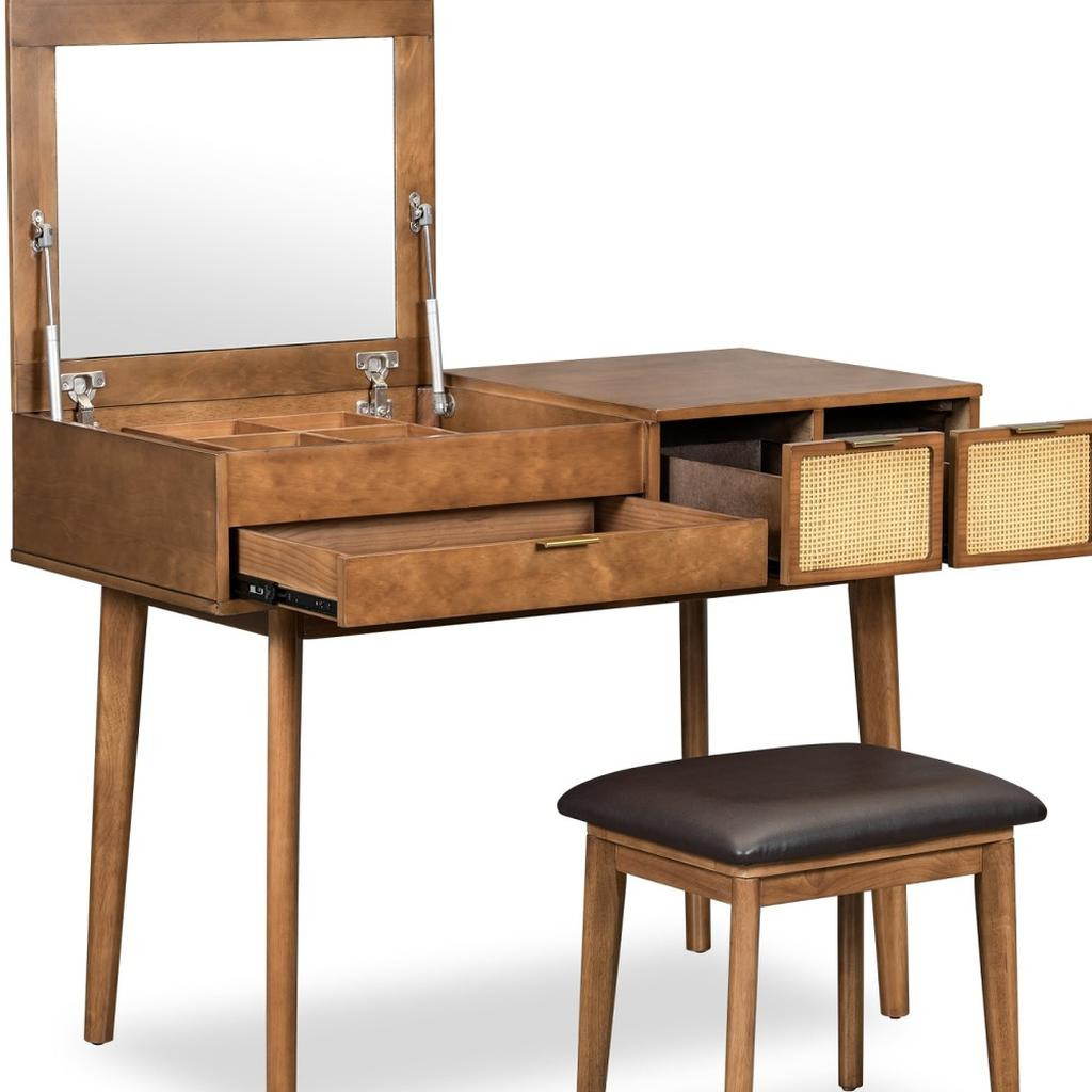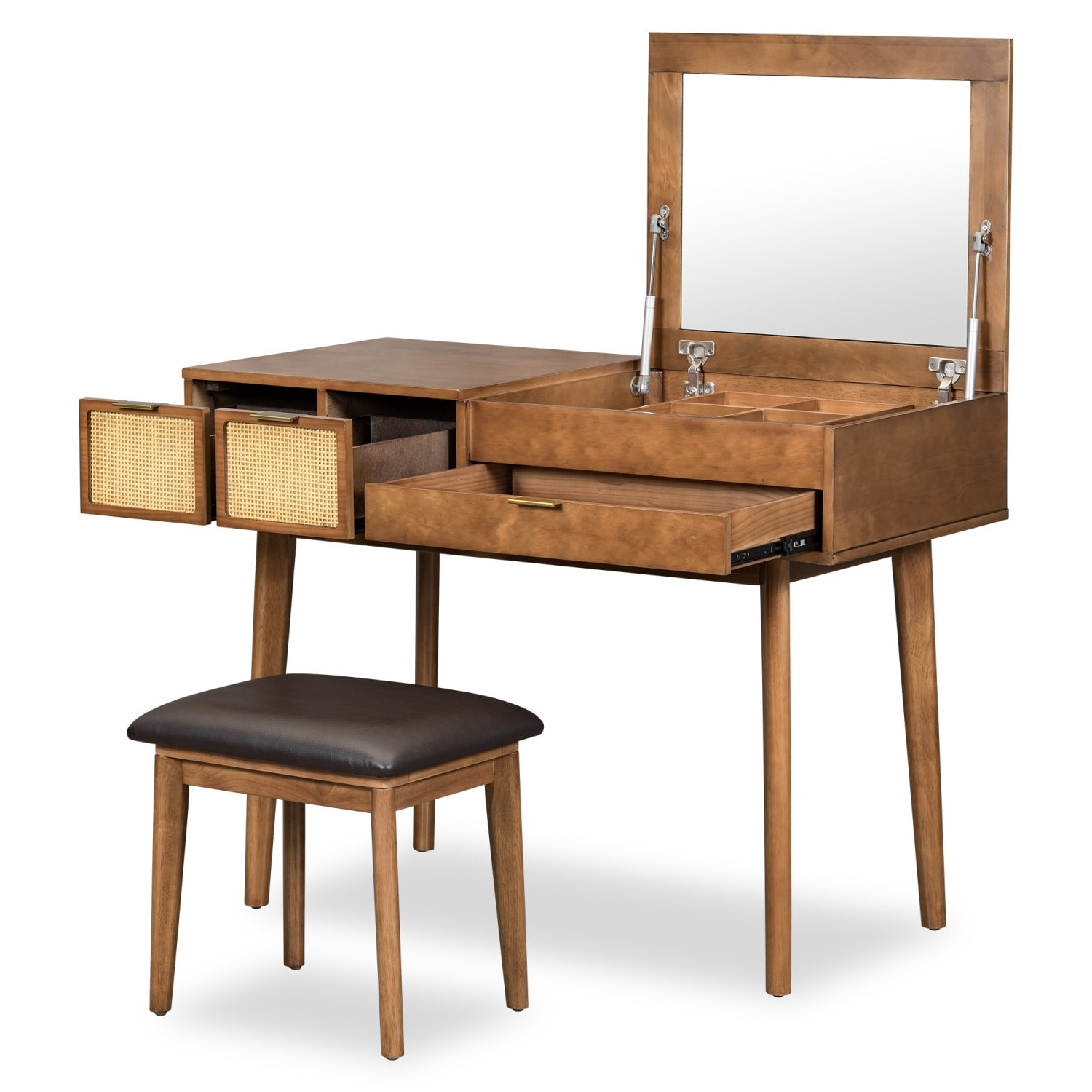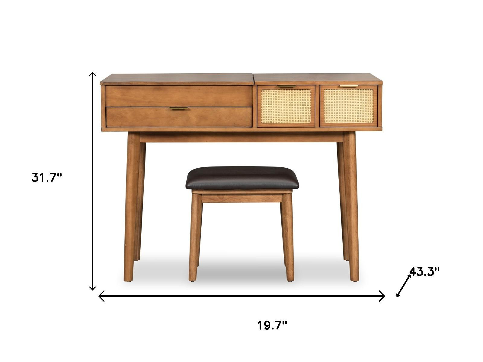 Get ready in style with our luxury 43-inch brown wood mirrored vanity table. This table features mirrored glass which will help add some reflective and sparkling beauty to your daily routine. Made with the highest quality construction from mix of durable and genuine solid wood and manufactured woods. Experience a new level of luxury and convenience. Our versatile vanity will cater to your grooming needs, whether it's keeping organized, applying makeup, styling your hair, or achieving your best look every day. 31.70-inch h x 43.30-inch w x 19.70-inch d.