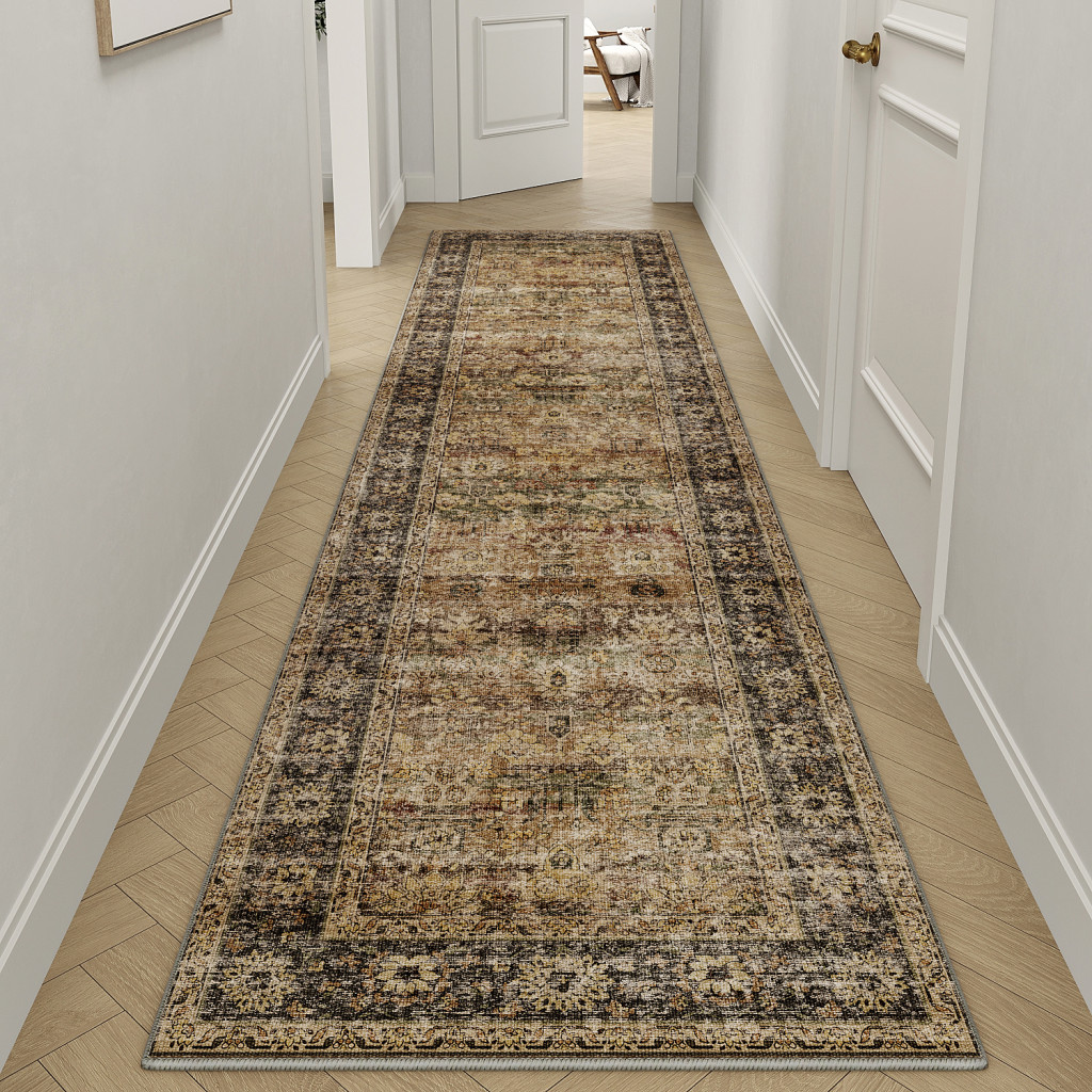 Vintage brown floral design washable area rug, Washable area rug, Vintage washable area rug |