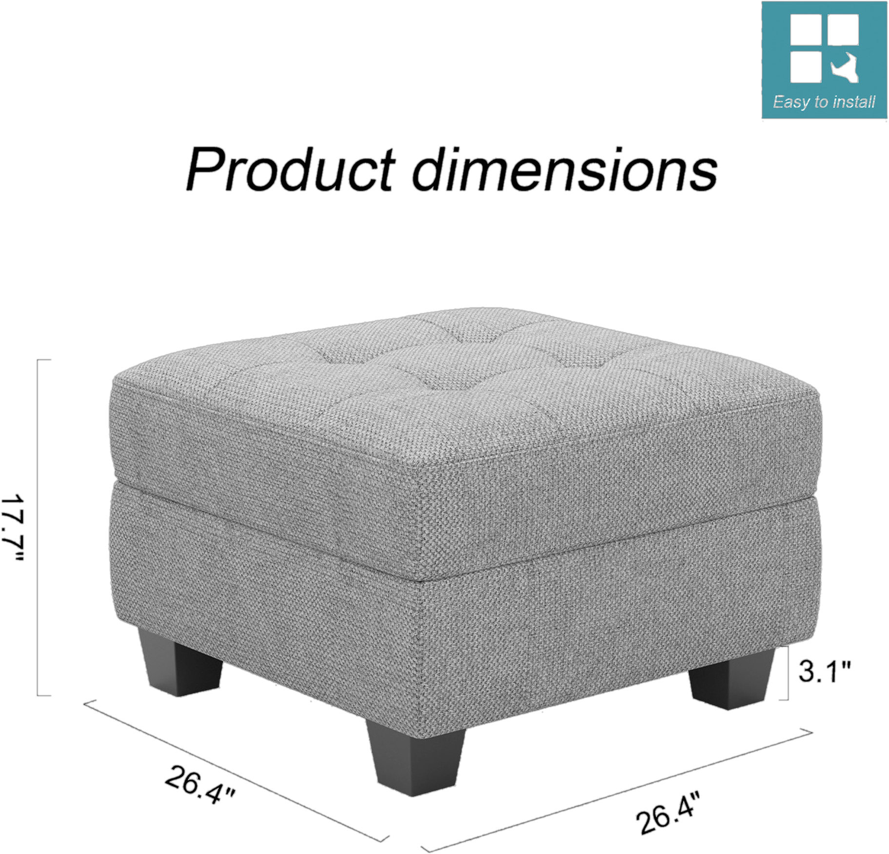 Optimize your space and add some charm to your room with the 26-inch light gray and black linen tufted storage ottoman. Designed to discretely add hidden storage to your room without sacrificing seating or foot rest space. Expertly upholstered with padding and button tufted stitching, this ottoman is as comfortable as it is good looking. Easy to blend into most any room, a ottoman is a way to add a good looking accent to your space that can also be practical and useful. 17.70-inch h x 26.40-inch w x 26.40-inch d.