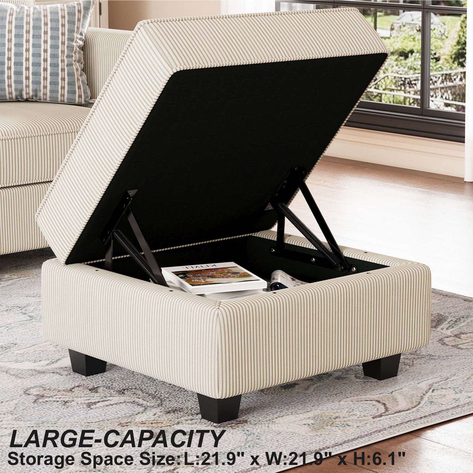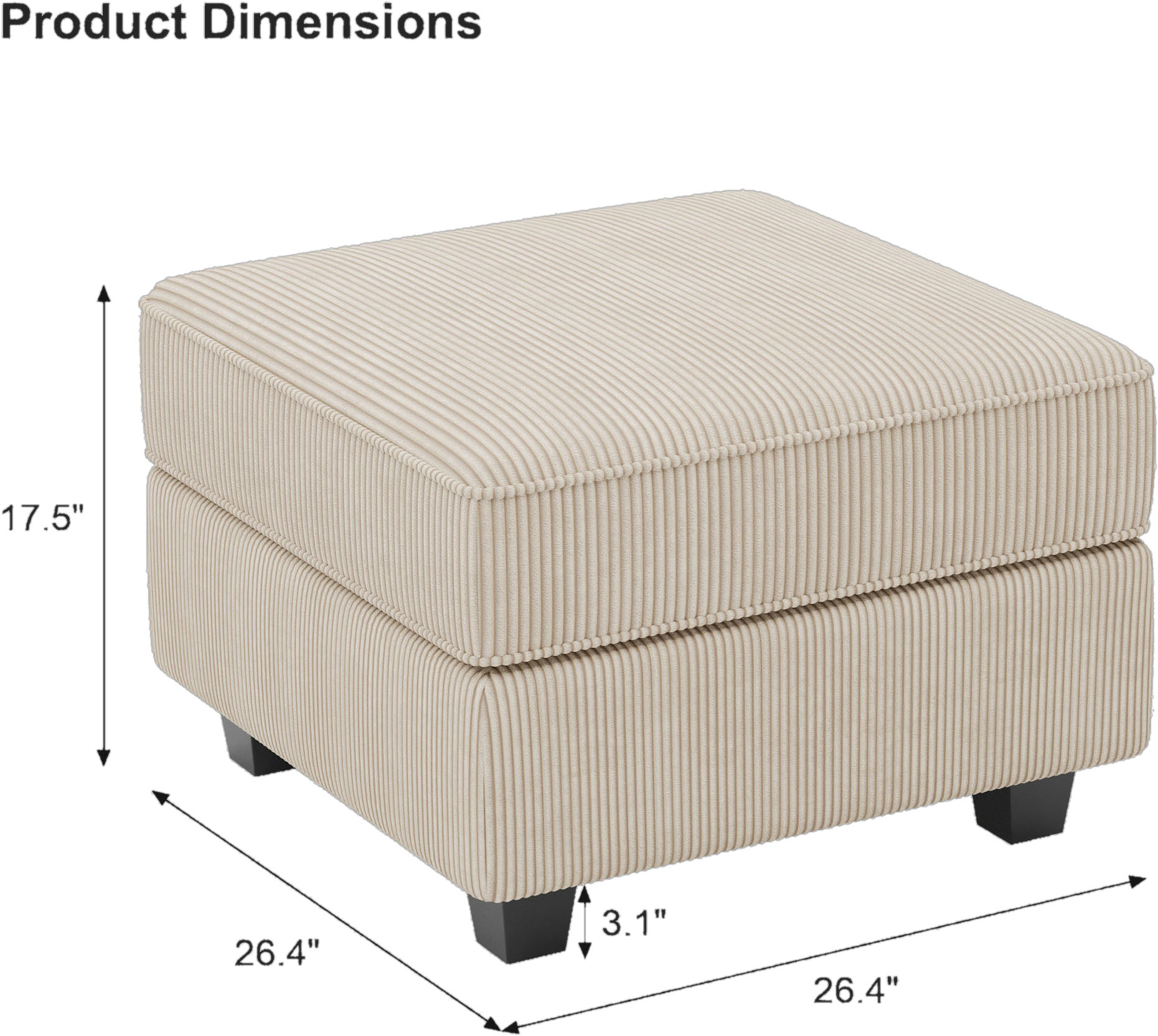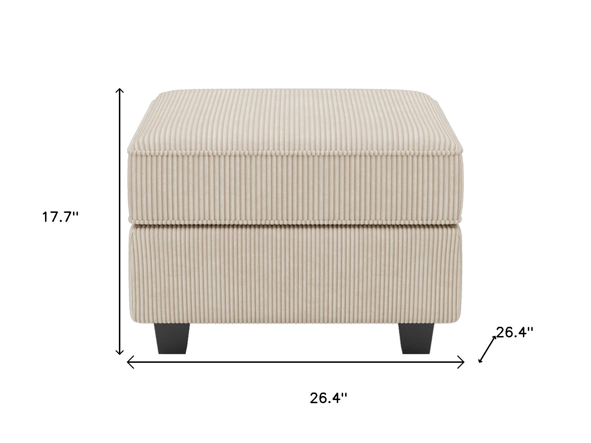 Practicality and fashion mix together with this handy 26-inch beige and black corduroy storage ottoman. Designed to discretely add hidden storage to your room without sacrificing seating or foot rest space. Expertly upholstered with padding in a soft and textural solid color corduroy, this ottoman is as comfortable as it is good looking. Easy to blend into most any room, a ottoman is a way to add a good looking accent to your space that can also be practical and useful. 17.70-inch h x 26.40-inch w x 26.40-inch d.