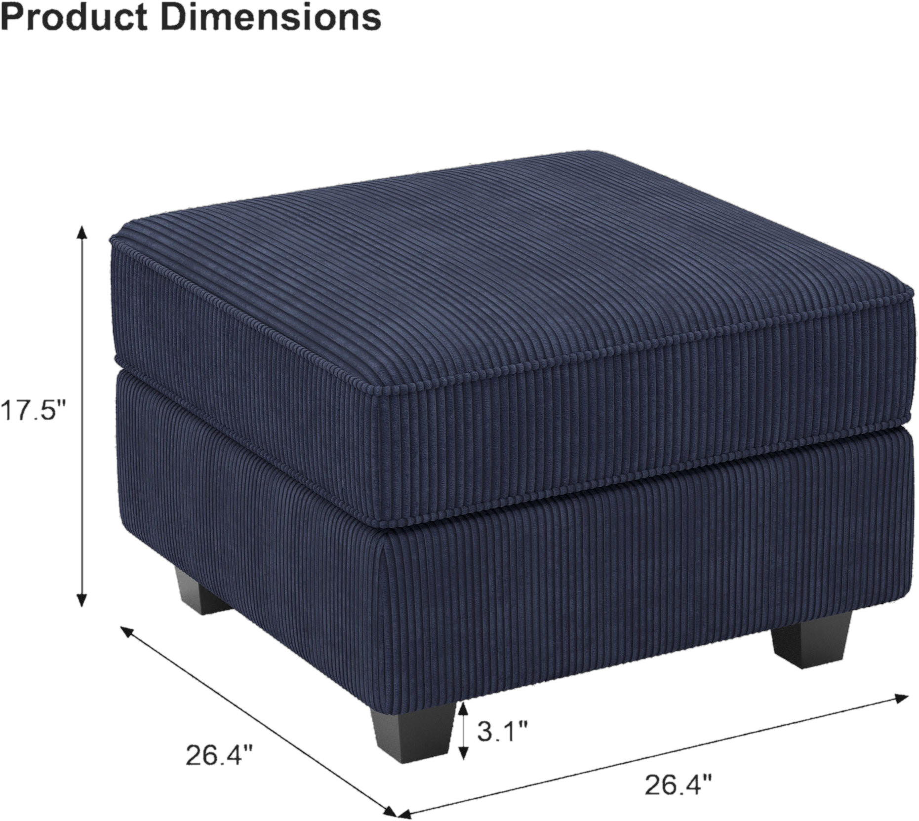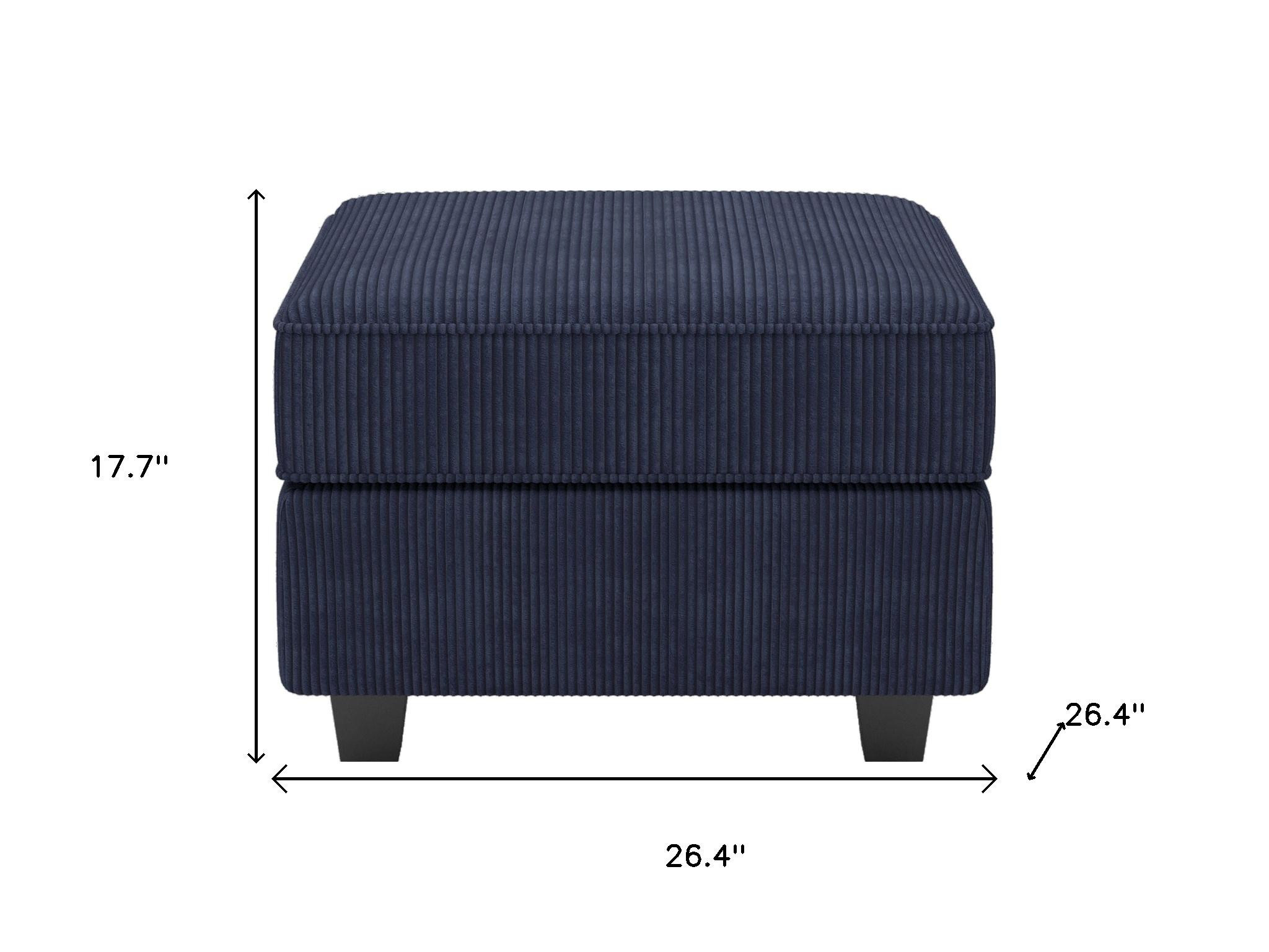 Optimize your space and add some charm to your room with the 26-inch navy blue and black corduroy storage ottoman. Designed to discretely add hidden storage to your room without sacrificing seating or foot rest space. Expertly upholstered with padding in a soft and textural solid color corduroy, this ottoman is as comfortable as it is good looking. Easy to blend into most any room, a ottoman is a way to add a good looking accent to your space that can also be practical and useful. 17.70-inch h x 26.40-inch w x 26.40-inch d.