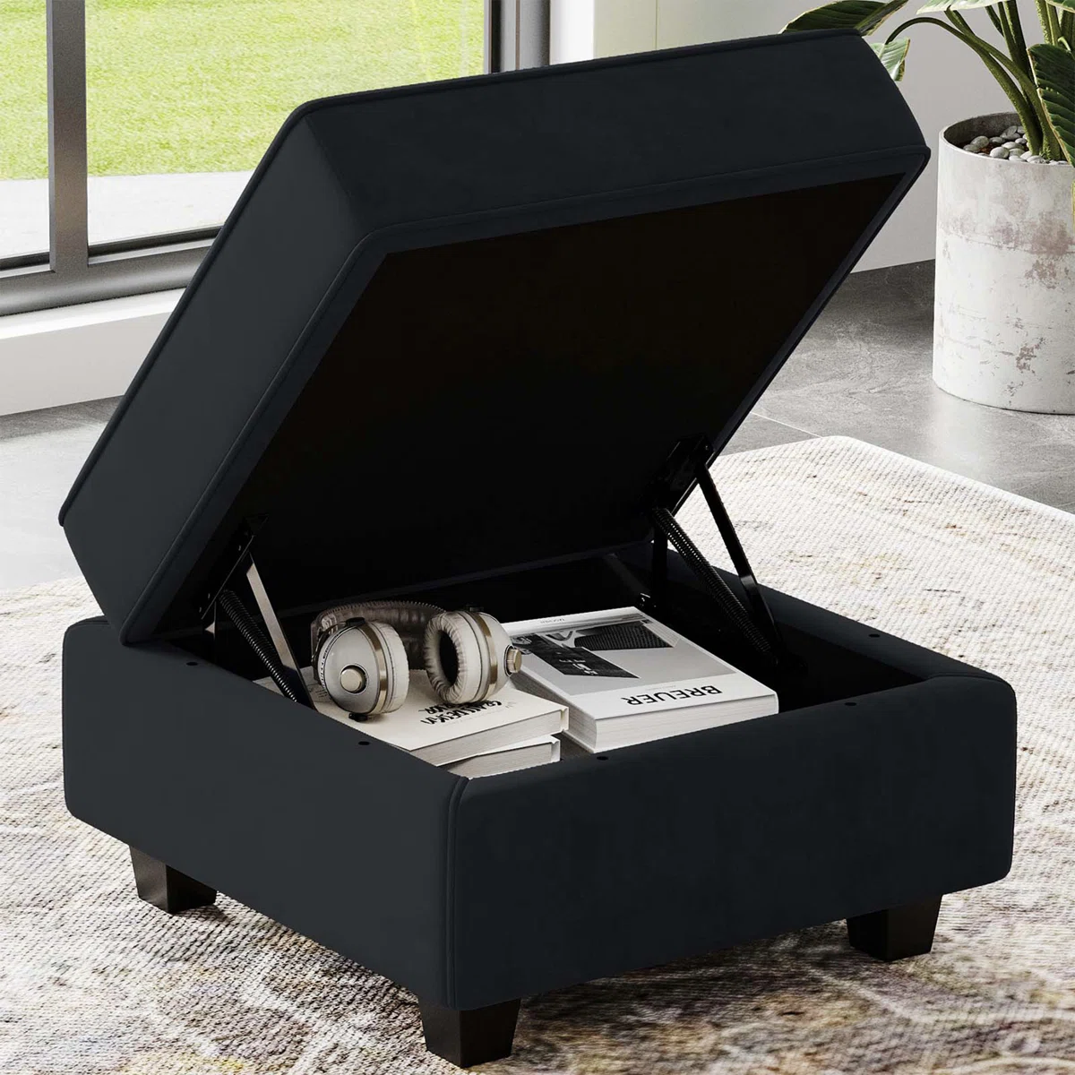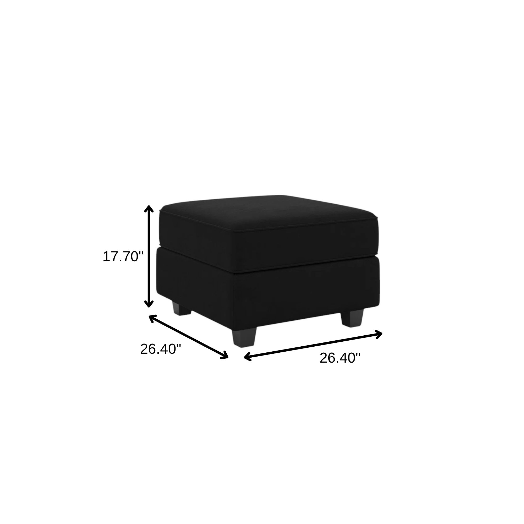 Practicality and fashion mix together with this handy 26-inch black microsuede storage ottoman. Designed to discretely add hidden storage to your room without sacrificing seating or foot rest space. A black coloration runs throughout this good looking ottoman. Expertly upholstered with padding in a soft solid color microsuede, this ottoman is as comfortable as it is good looking. Ottomans are multi-functional additions to your space that add fashion and practical value. 17.70-inch h x 26.40-inch w x 26.40-inch d.