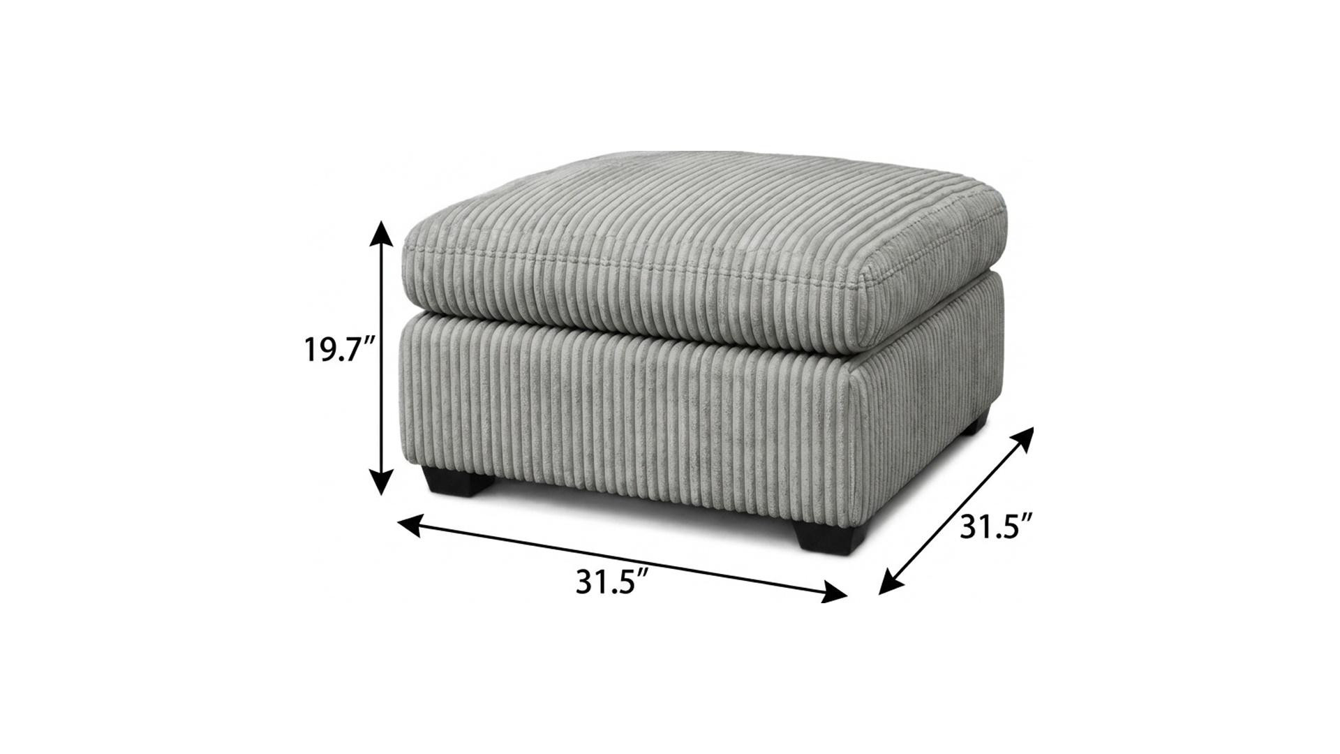 Practicality and fashion mix together with this handy 32-inch gray and black corduroy ottoman. Expertly upholstered with padding in a soft solid color corduroy, this ottoman is as comfortable as it is good looking. Easy to blend into most any room, a ottoman is a way to add a good looking accent to your space that can also be practical and useful. 19.70-inch h x 31.50-inch w x 31.50-inch d.