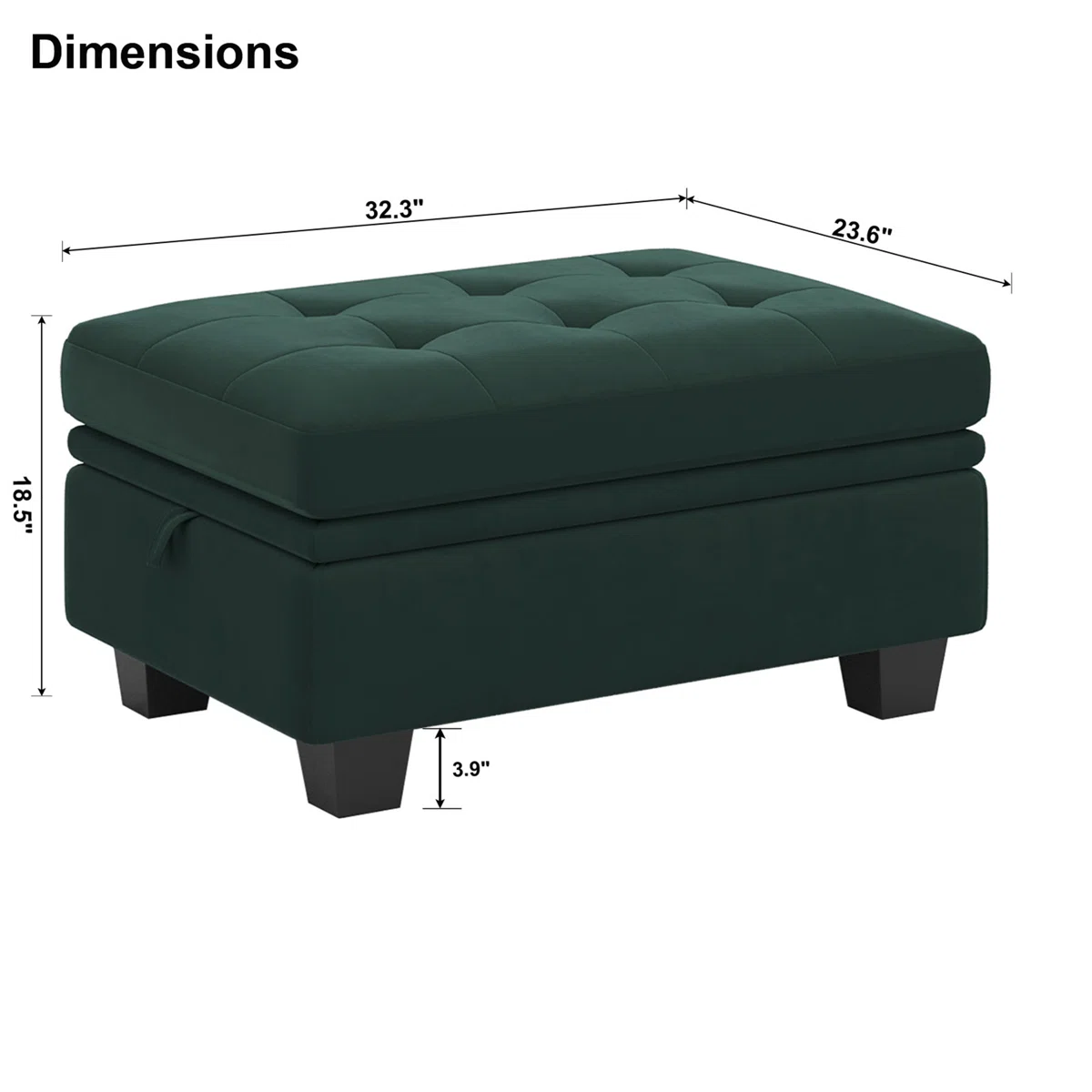 Optimize your space and add some charm to your room with the 32-inch green and black velvet tufted storage ottoman. Designed to discretely add hidden storage to your room without sacrificing seating or foot rest space. Expertly upholstered with padding in a soft solid color velvet, this ottoman is as comfortable as it is good looking. Easy to blend into most any room, a ottoman is a way to add a good looking accent to your space that can also be practical and useful. 18.50-inch h x 32.30-inch w x 23.60-inch d.