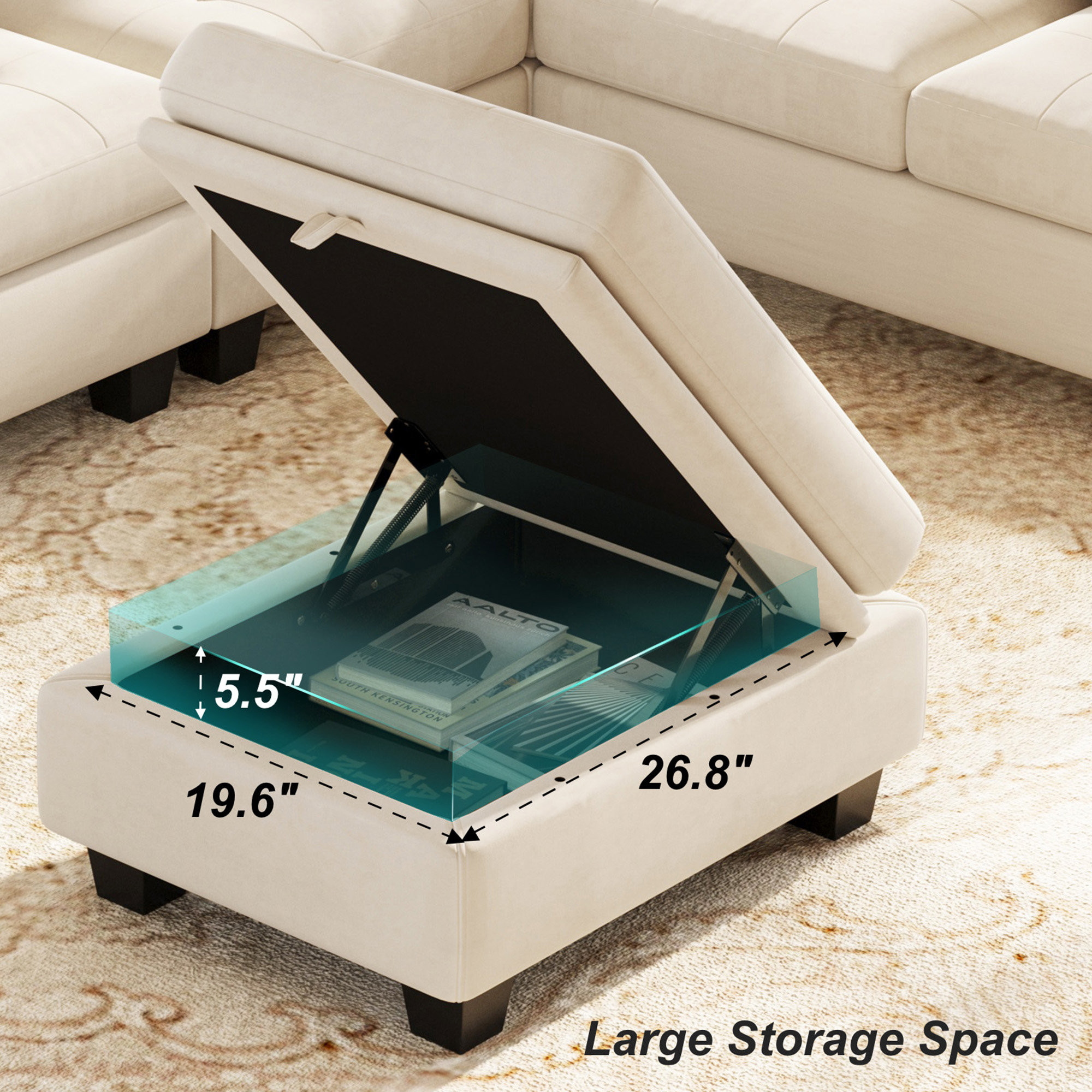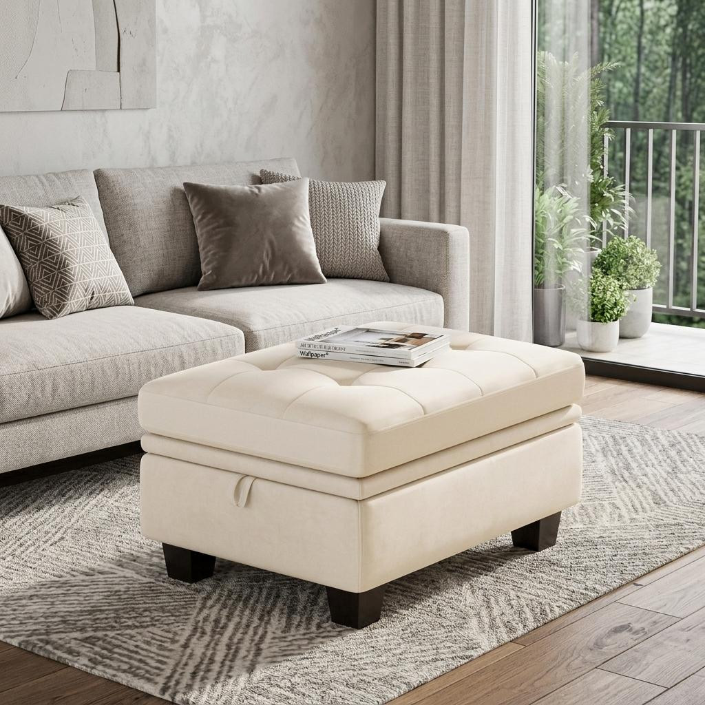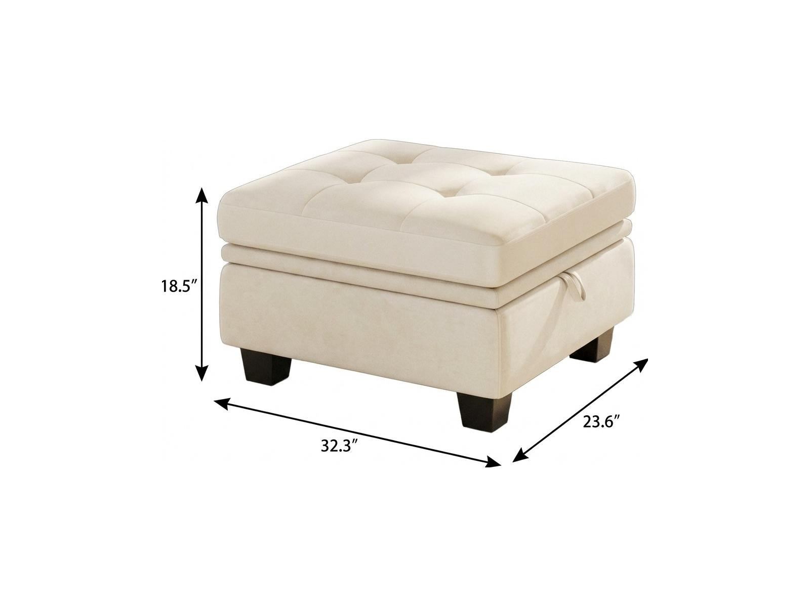 Get ready to relax with this 32-inch beige and black velvet tufted storage ottoman. Designed to discretely add hidden storage to your room without sacrificing seating or foot rest space. Expertly upholstered with padding in a soft solid color velvet, this ottoman is as comfortable as it is good looking. Easy to blend into most any room, a ottoman is a way to add a good looking accent to your space that can also be practical and useful. 18.50-inch h x 32.30-inch w x 23.60-inch d.
