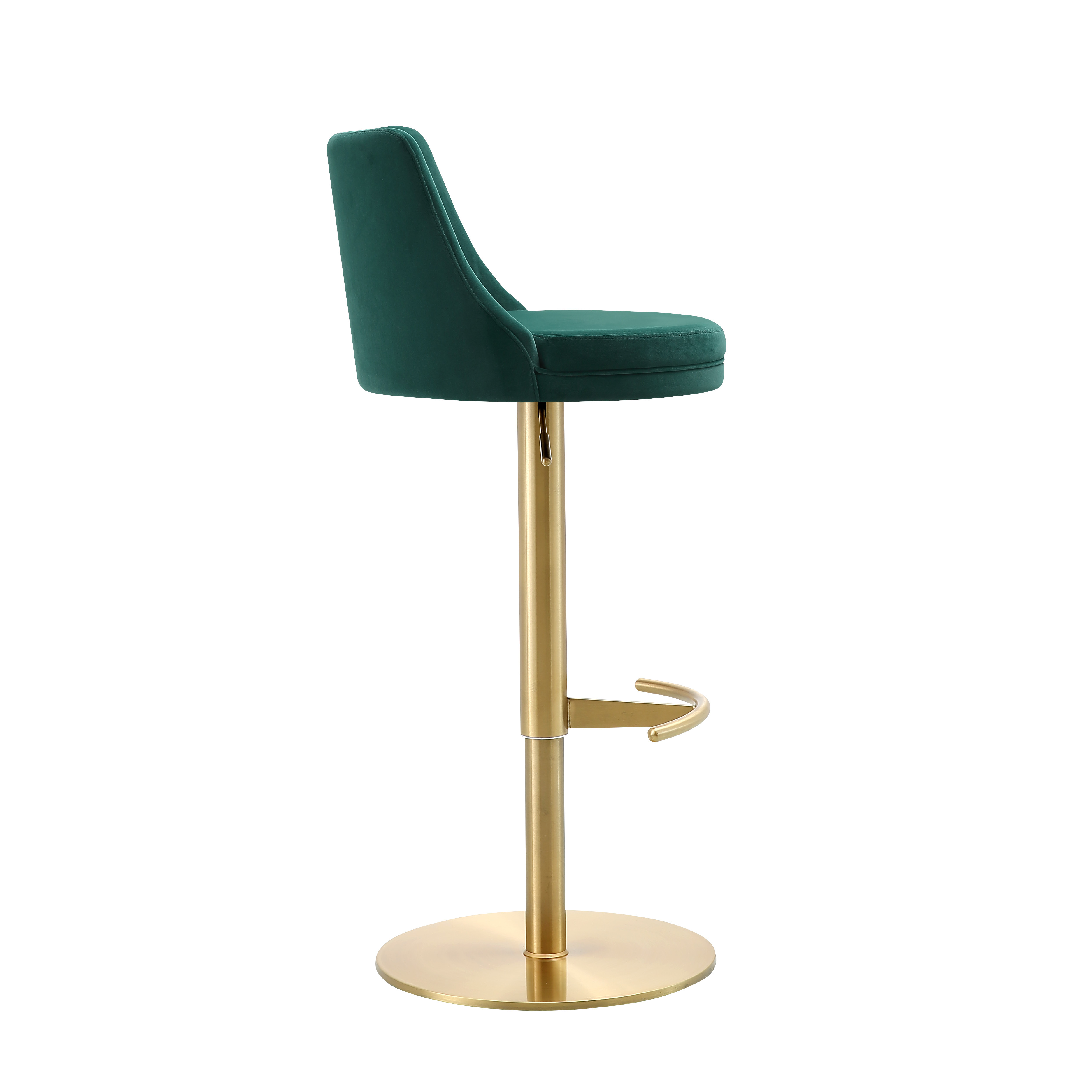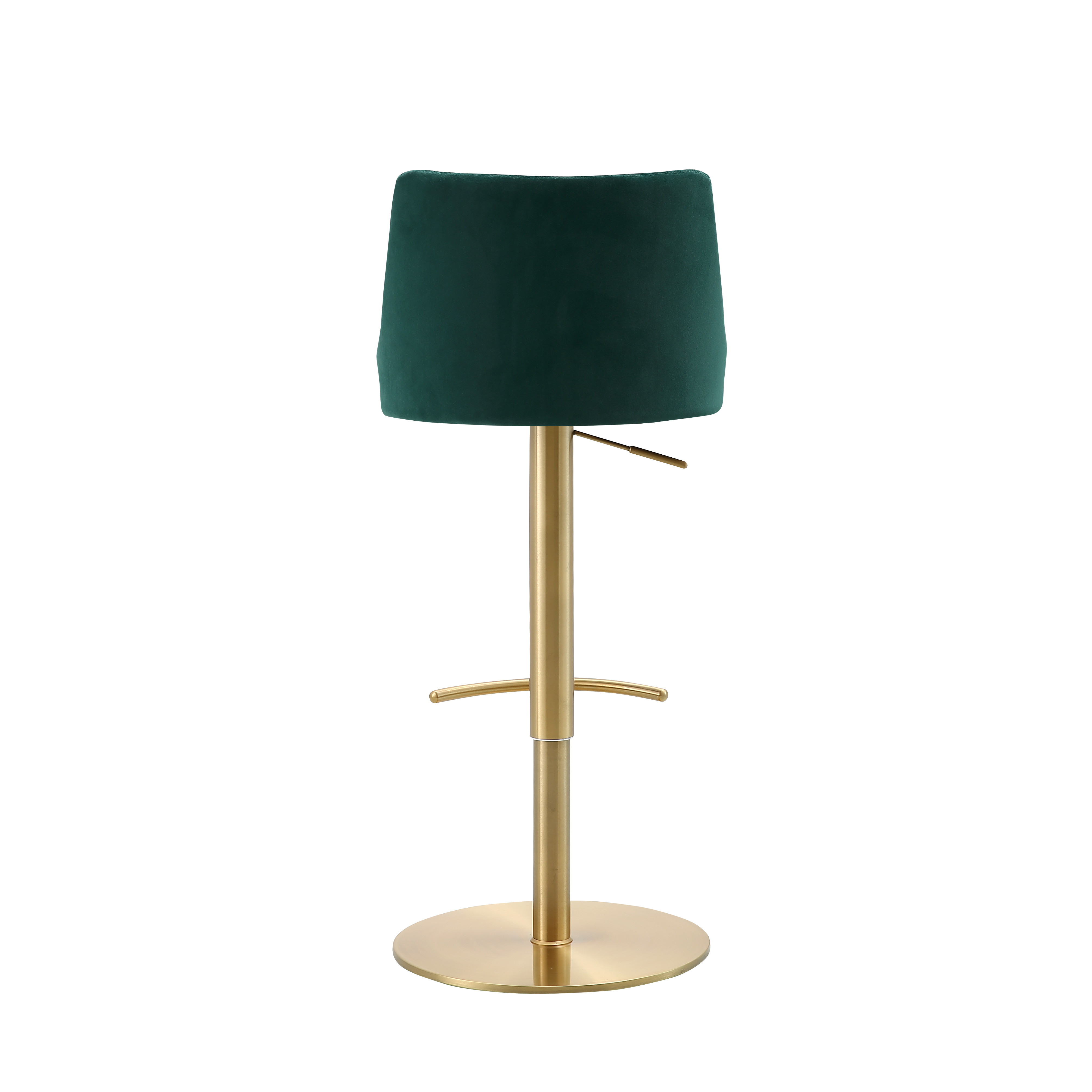 The perfect way to add some extra seating in your home, this green and gold velvet and steel low back adjustable height swivel bar chair will elevate the look and vibe of your room. Quality construction from gold stainless steel combines with green velvet to give this stool a fresh and updated look. The round shape of the seat combines with a low back to give this chair a comfortable and fashionable look. 41.00-inch h x 17.00-inch w x 18.00-inch d.