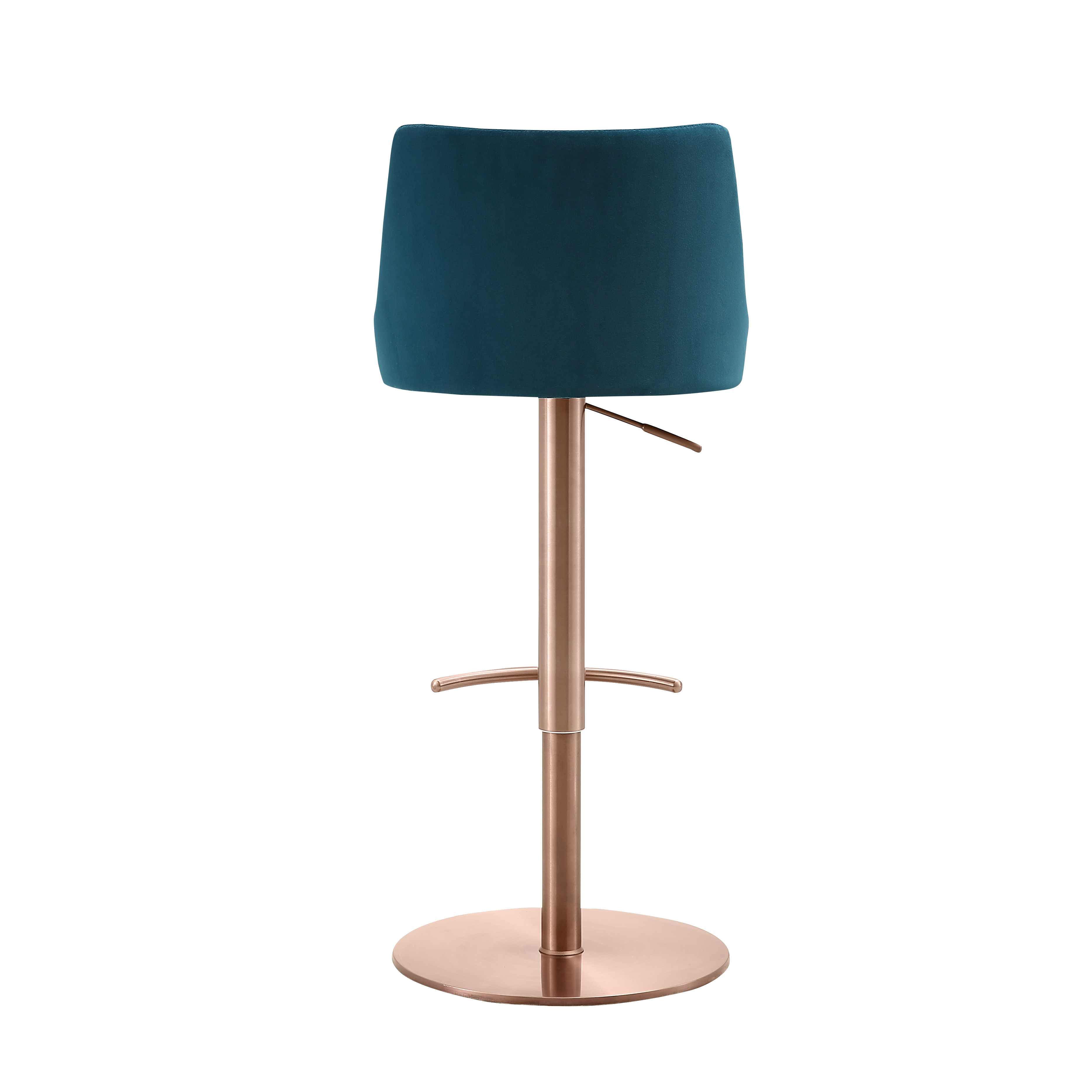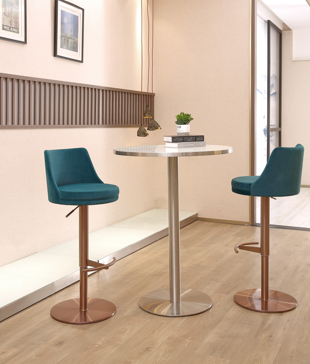 Bring a trendy bar vibe to your space, with this blue and rose gold velvet and steel low back adjustable height swivel bar chair. Quality construction from rose gold stainless steel combines with blue velvet to give this stool a fresh and updated look. The round shape of the seat combines with a low back to give this chair a comfortable and fashionable look. 41.00-inch h x 17.00-inch w x 18.00-inch d.