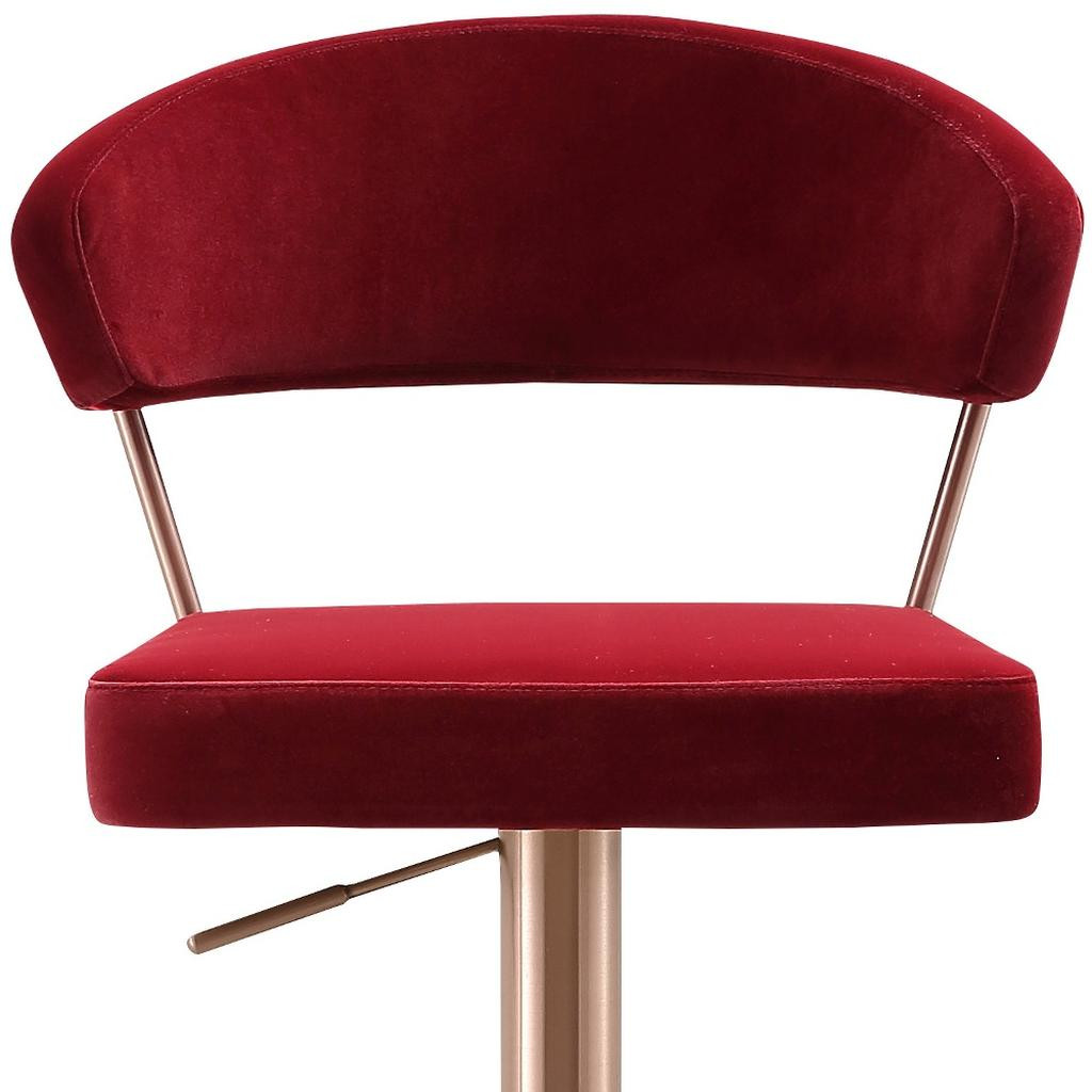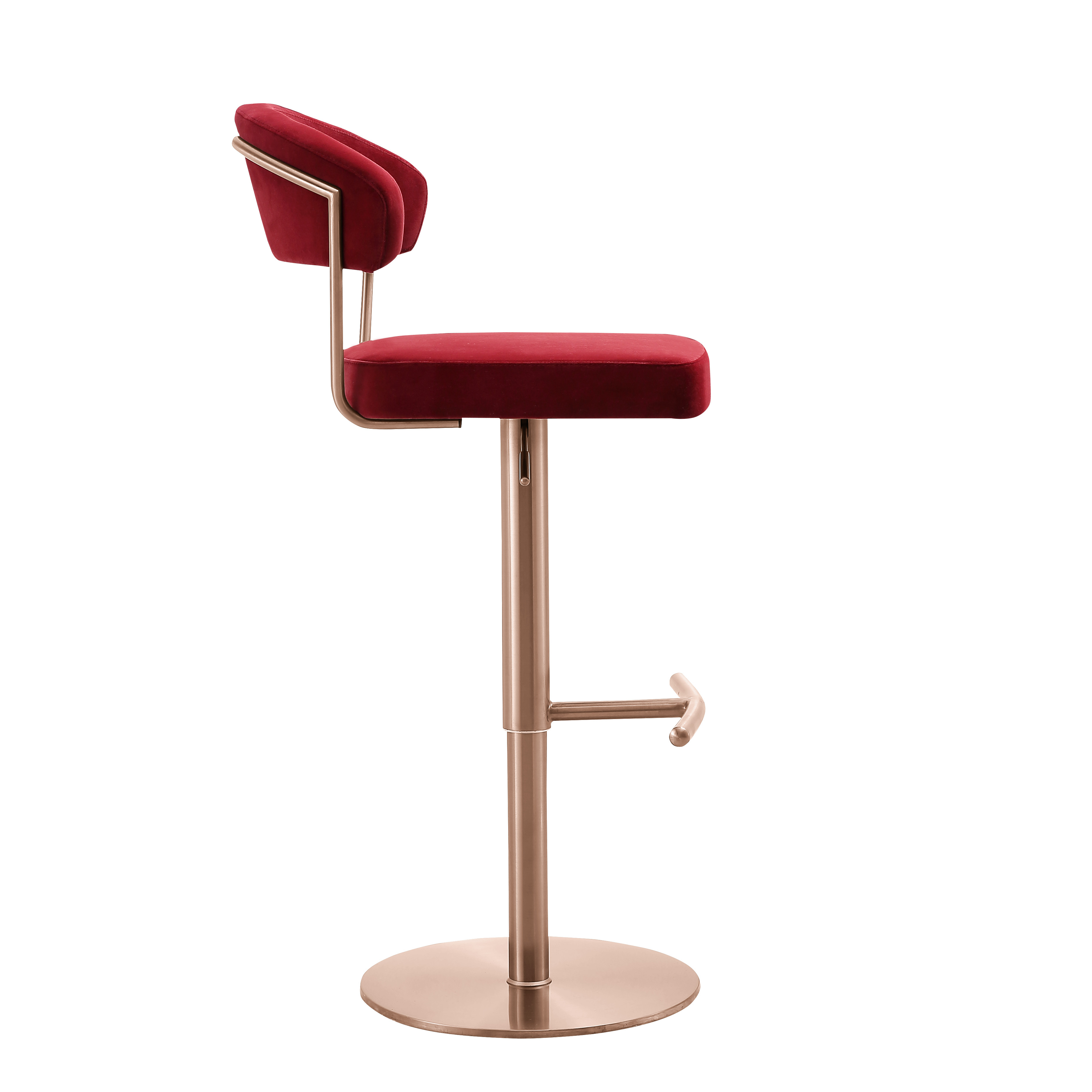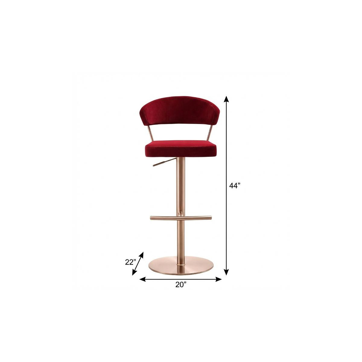 The perfect way to add some extra seating in your home, this red and rose gold velvet and steel low back adjustable height swivel bar chair will elevate the look and vibe of your room. A rose gold stainless steel frame is finished off with a red velvet seat that is the epitome of quality construction and design. Not only good looking and stylish, this chair features a round shaped seat and a low back for the ultimate in comfort and enjoyment. 44.00-inch h x 20.00-inch w x 22.00-inch d.