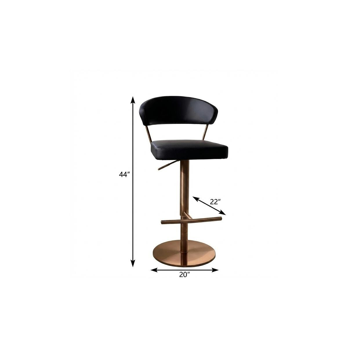 The perfect way to add some extra seating in your home, this black and rose gold faux leather and steel low back adjustable height swivel bar chair will elevate the look and vibe of your room. The rose gold coloration of the high quality stainless steel base marries nicely with the black faux leather seat. Not only good looking and stylish, this chair features a round shaped seat and a low back for the ultimate in comfort and enjoyment. 44.00-inch h x 20.00-inch w x 22.00-inch d.