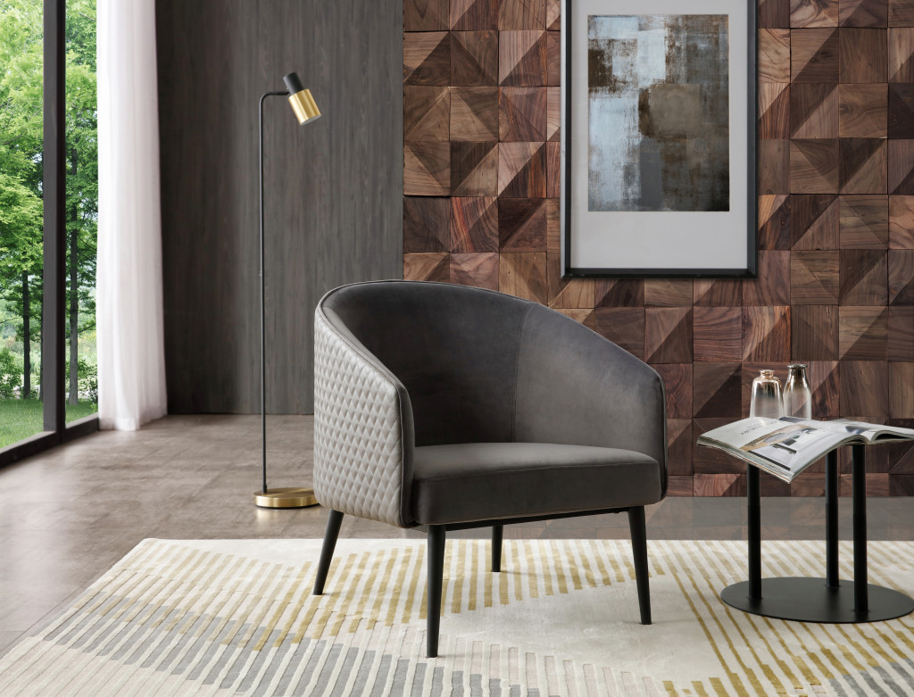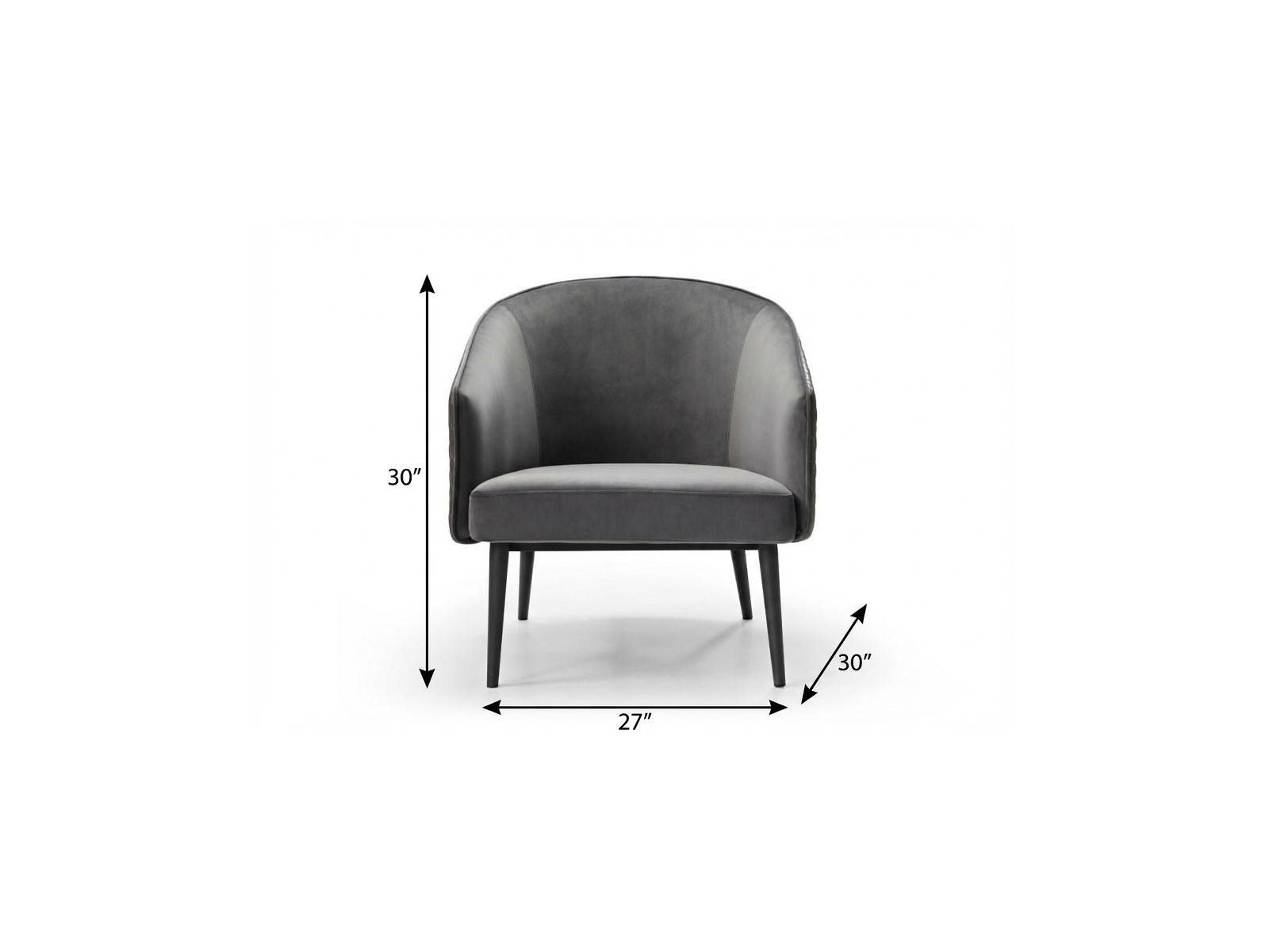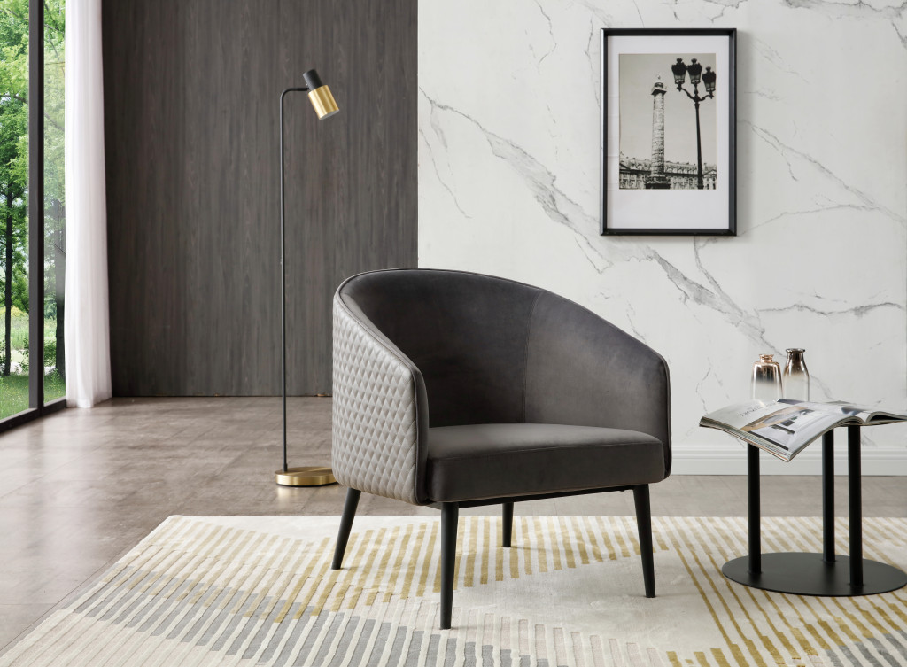 A mix of form and function, this 27-inch gray tufted velvet and faux leather and metal lounge chair will bring a good looking and usable accent to your space. Built to last this lounge chair is finished in solid gray velvet and faux leather to give your room a great update. Giving the chair stability and structure, the inner frame is constructed with high quality metal, includes comfy armrests, and features a tight back that comes complete with soft and comfortable cushioning. The tufted cushions add fine designer detailing. 30.00-inch h x 27.00-inch w x 30.00-inch d.