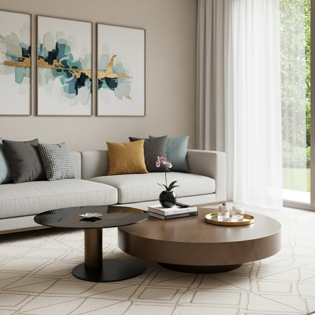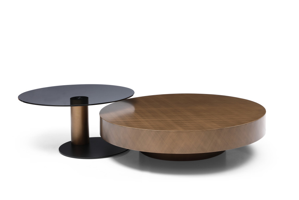 round pedestal nested coffee tables, pedestal nested coffee tables, nested coffee tables, steel round pedestal nested coffee, smoky black black copper glass |