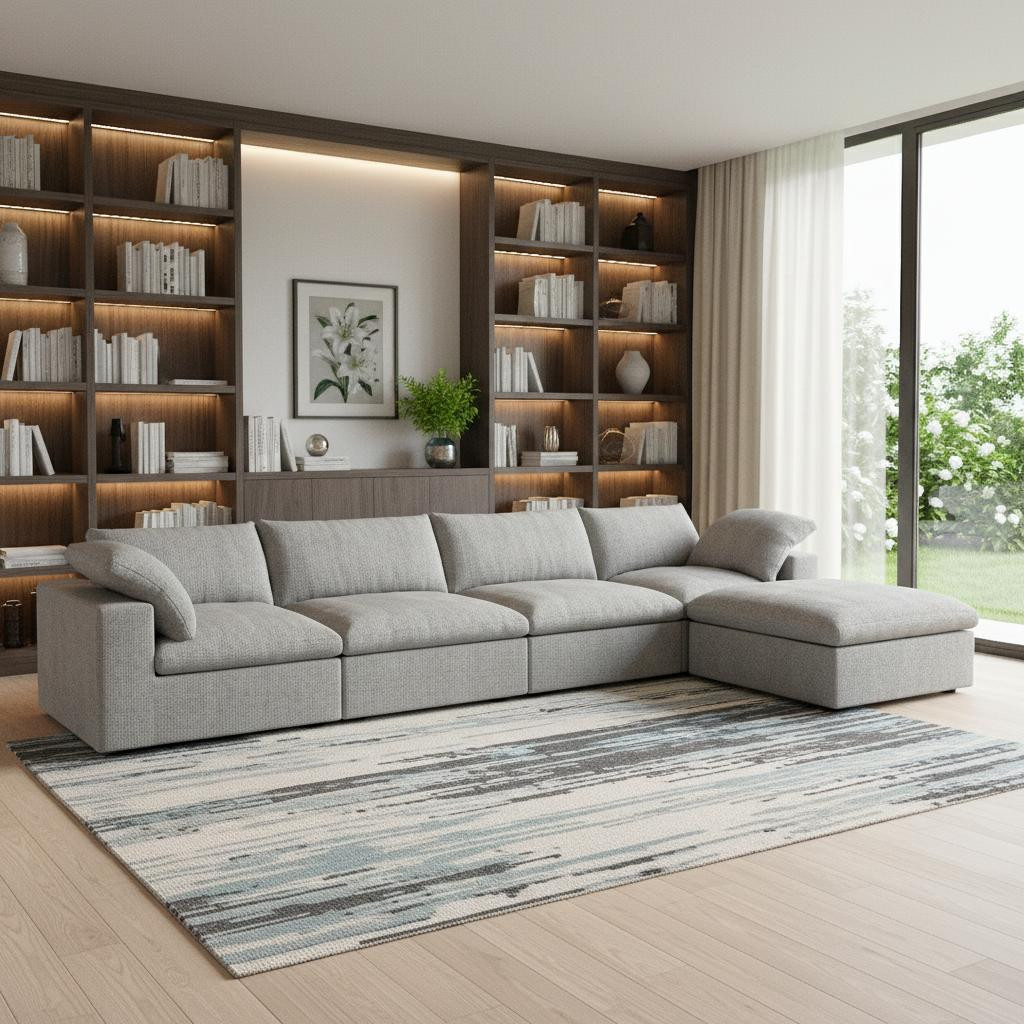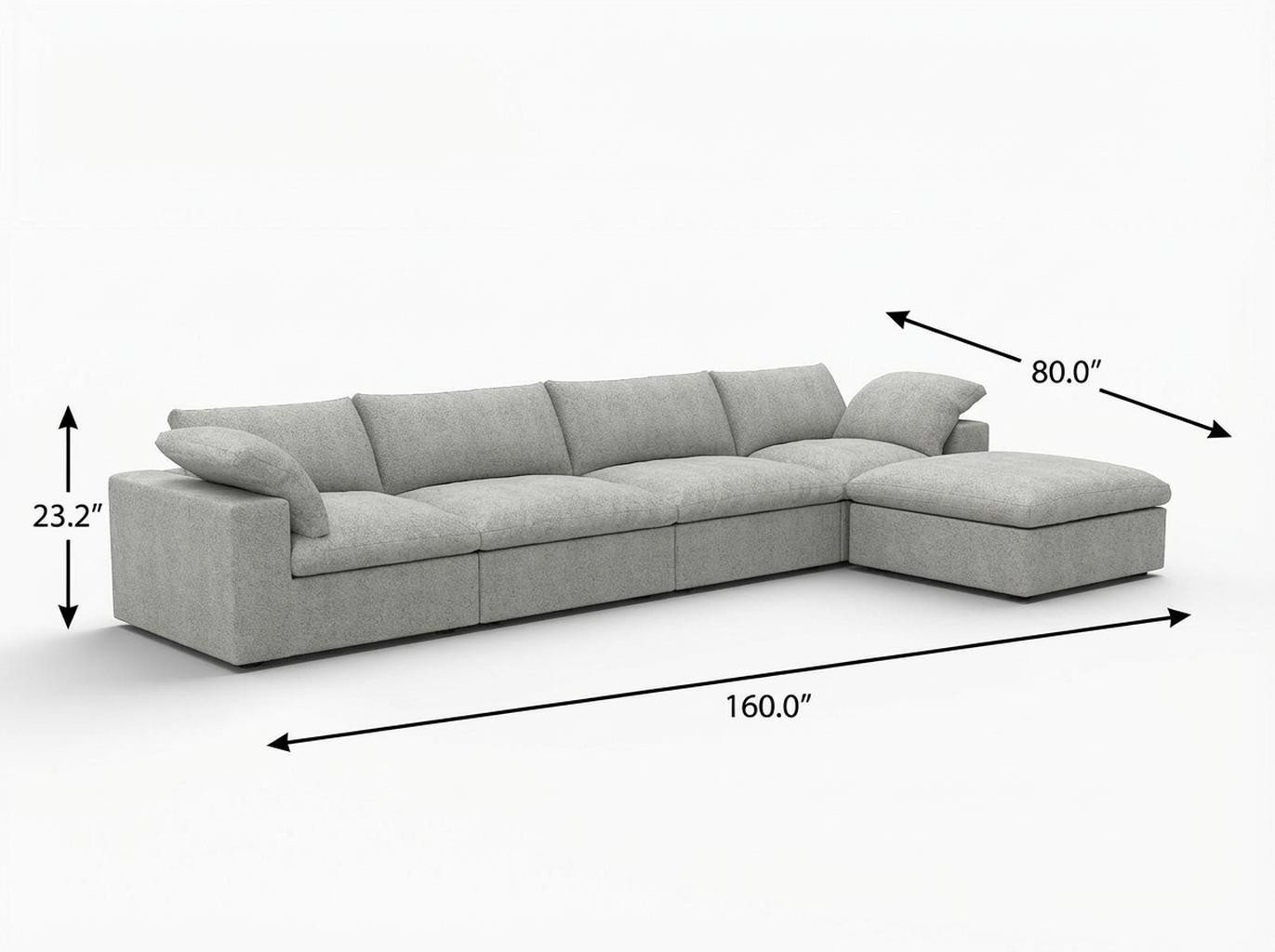 Transform your home's interior with this luxurious 160-inch light gray linen blend modular sofa with ottoman and storage. Solid colors give you lots of decorative options and are easy to work into your decor scheme. Removable back cushions make this sofa easy to manage. A comfy ottoman is included as part of the package. Great to rest your feet or provide extra seating in a pinch. Track arms offer a comfy place to rest. Black solid wood legs effortlessly elevate the room and add a touch of contemporary design. A great showpiece for your room, this sofa is a must have. 23.20-inch h x 160.00-inch w x 80.00-inch d.