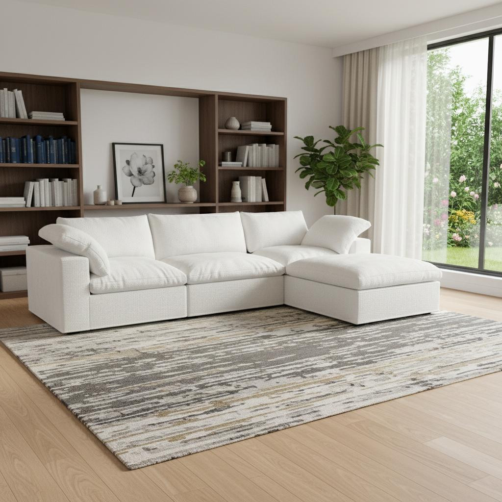 Transform your home's interior with this luxurious 120-inch white linen blend modular sofa with ottoman and storage. Solid colors give you lots of decorative options and are easy to work into your decor scheme. Removable back cushions make this sofa easy to manage. Comes complete with a coordinating ottoman to rest your feet. The ottoman can also be used as additional seating option if needed. Track arms offer a comfy place to rest. Black solid wood legs effortlessly elevate the room and add a touch of contemporary design. Built to last, this sofa will be a great centerpiece for your room. 23.20-inch h x 120.00-inch w x 80.00-inch d.