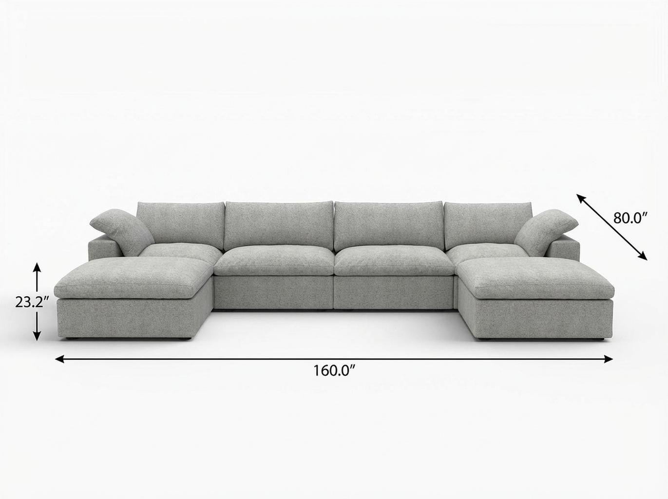 Transform your home's interior with this luxurious 160-inch light gray linen blend modular sofa with ottoman and storage. Solid colors give you lots of decorative options and are easy to work into your decor scheme. Removable back cushions make this sofa easy to manage. Comes complete with a coordinating ottoman to rest your feet. The ottoman can also be used as additional seating option if needed. Track arms offer a comfy place to rest. Black solid wood legs effortlessly elevate the room and add a touch of contemporary design. Built to last, this sofa will be a great centerpiece for your room. 23.20-inch h x 160.00-inch w x 80.00-inch d.