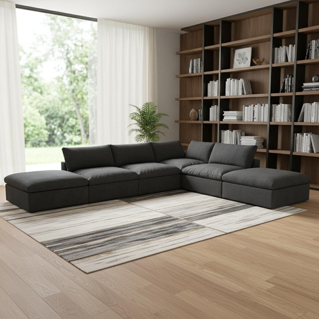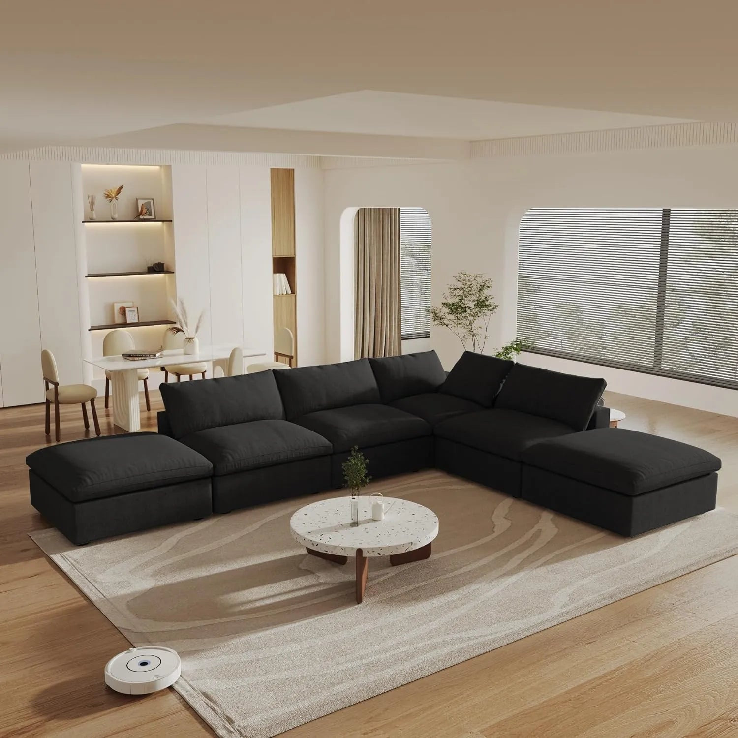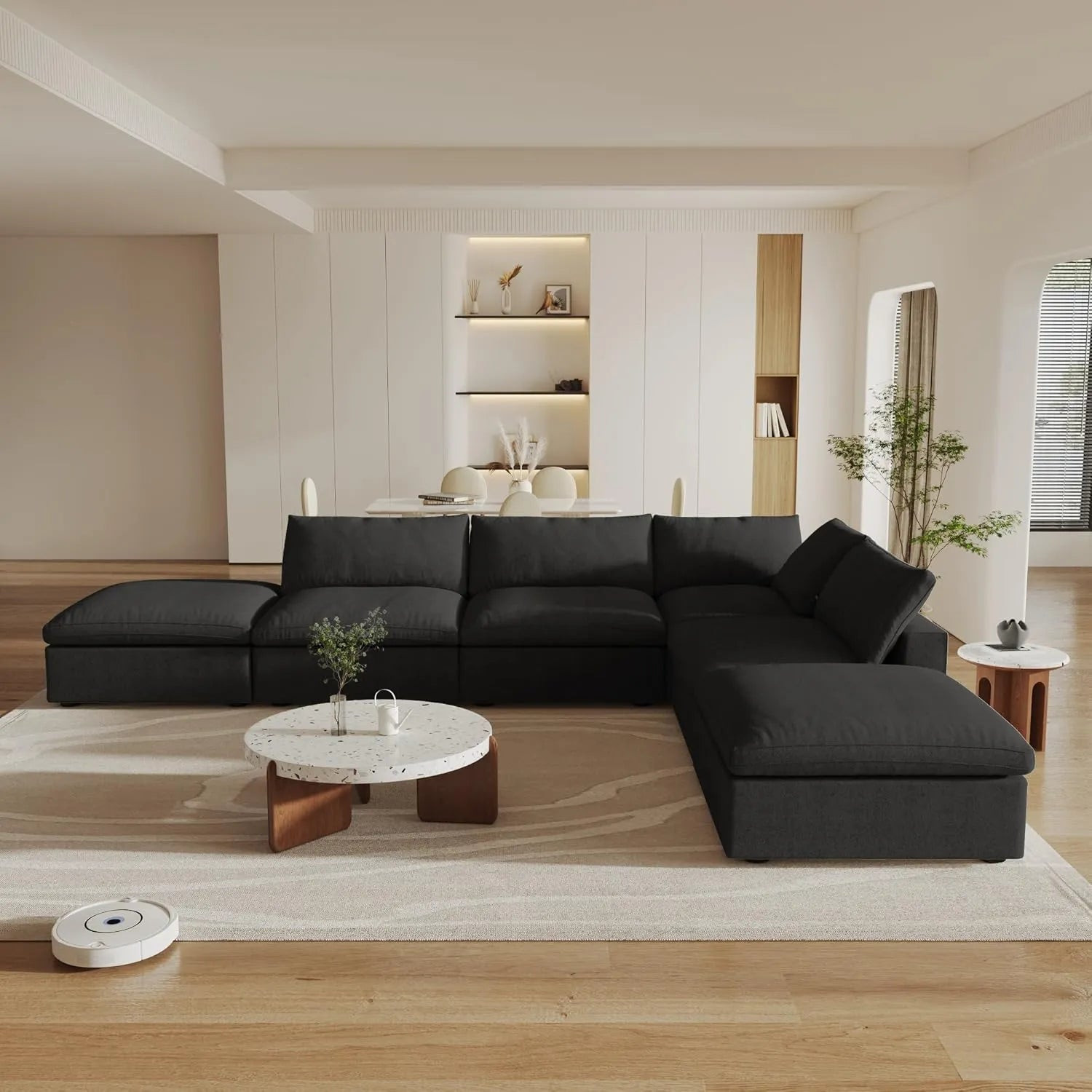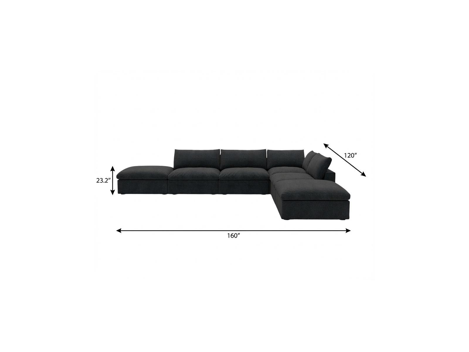 Designed for comfort and good looks, this black linen blend modular l shaped six piece corner sectional is a great option to anchor your space. Solid colors give you lots of decorative options and are easy to work into your decor scheme. Track arms offer a comfy place to rest. Black solid wood legs effortlessly elevate the room and add a touch of contemporary design. Great for everyday lounging and for entertaining, sectionals are an ideal way to seat multiple people. 23.20-inch h x 160.00-inch w x 120.00-inch d.