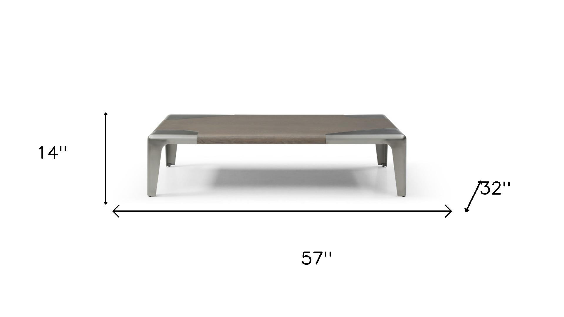 Make your living room or family room really stand out with this 57-inch light gray and silver wood and stainless steel coffee table. The silver coloration of the high quality stainless steel base marries nicely with the light gray manufactured wood top surface. This rectangular table is an classic yet updated way to accent your room. If you're looking for something that can fit into a living area, bedroom, or office, this coffee table is for you. 14.00-inch h x 57.00-inch w x 32.00-inch d.
