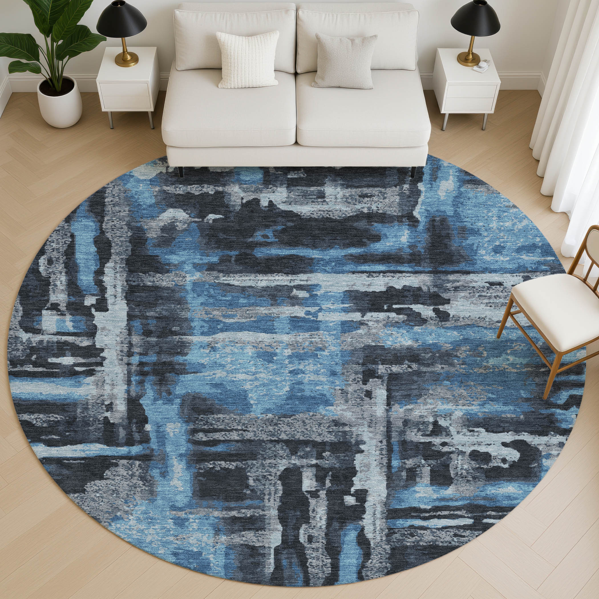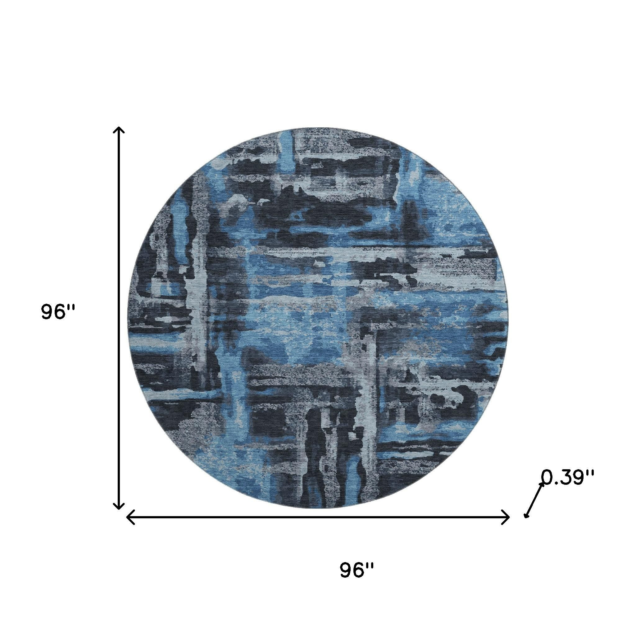 This 8-foot black and blue abstract washable round rug with uv protection, is a great way to add warmth to a room. Ideal for spaces with kids and pets, this rug is stain resistant to help repel dirt and spilled liquids. Built to last, this rug crafted from polyester fibers is known for its durability and long lasting appeal. Rugs are a great way to showcase your style, hide imperfections, warm your home and reduce noise. This larger sized, transitional styled rug is ready to create a focal point or statement piece in your room. 96.00-inch h x 96.00-inch w x 0.39-inch d.