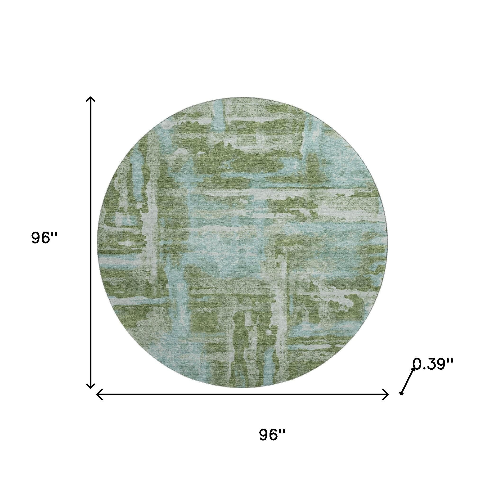 Add great coloration and comfortable texture to your space with this 8-foot fern green and sky blue abstract washable round rug with uv protection. Ideal for spaces with kids and pets, this rug is stain resistant to help repel dirt and spilled liquids. Built to last, this rug crafted from polyester fibers is known for its durability and long lasting appeal. Rugs are a great way to showcase your style, hide imperfections, warm your home and reduce noise. This larger sized, transitional styled rug is ready to create a focal point or statement piece in your room. 96.00-inch h x 96.00-inch w x 0.39-inch d.