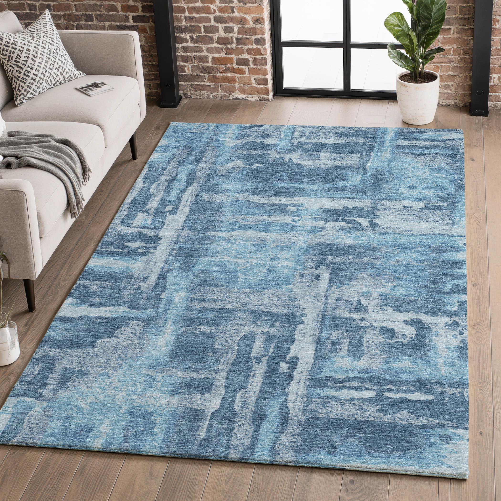 This 3-foot x 5-foot denim blue and sky blue abstract washable area rug with uv protection, is a great way to add warmth to a room. Ideal for spaces with kids and pets, this rug is stain resistant to help repel dirt and spilled liquids. Built to last, this rug crafted from polyester fibers is known for its durability and long lasting appeal. Rugs are a great way to showcase your style, hide imperfections, warm your home and reduce noise. This smaller sized, transitional styled rug is just what you need for your walkway, bedside, in front of door, cabinet, refrigerator, or chair. 36.00-inch h x 60.00-inch w x 0.39-inch d.