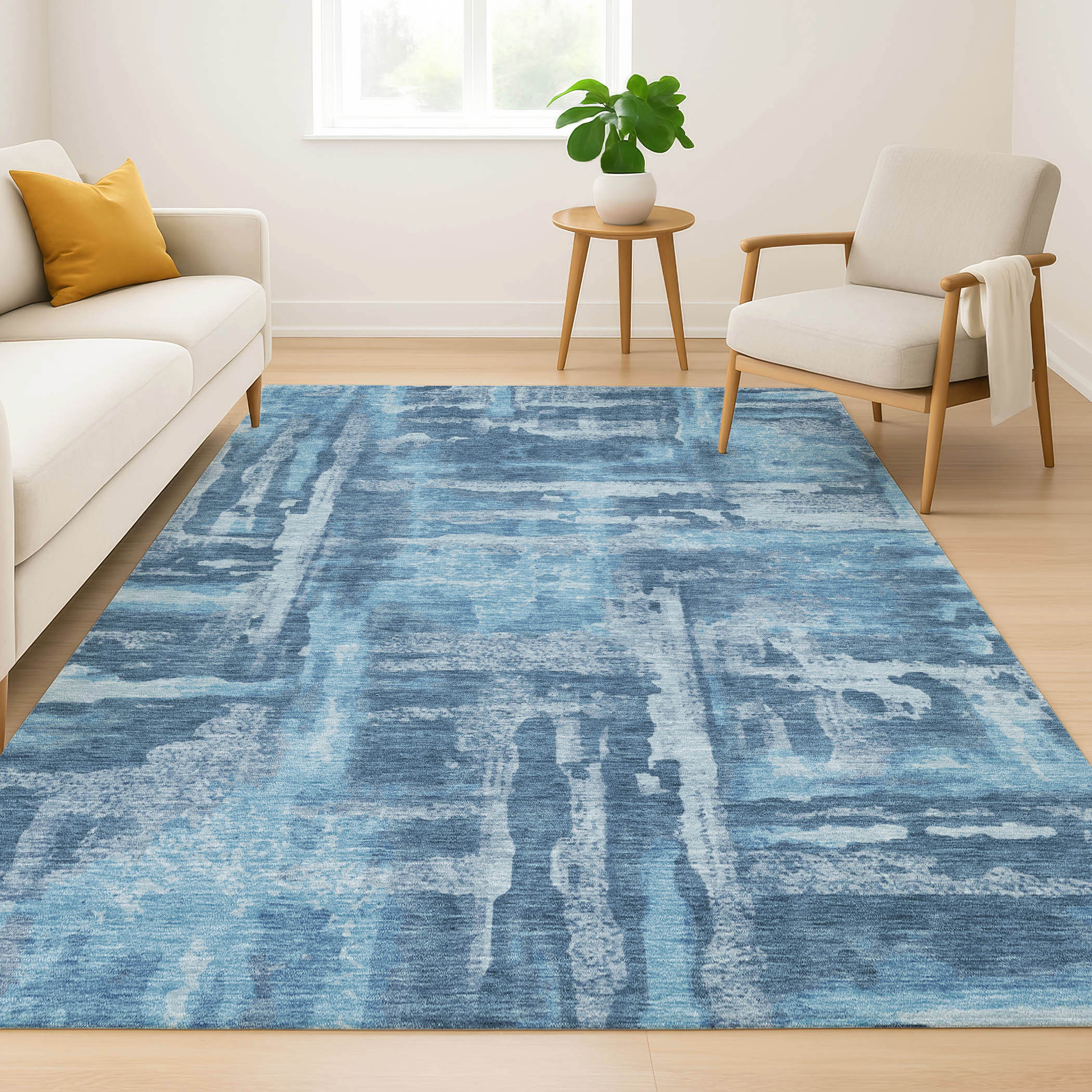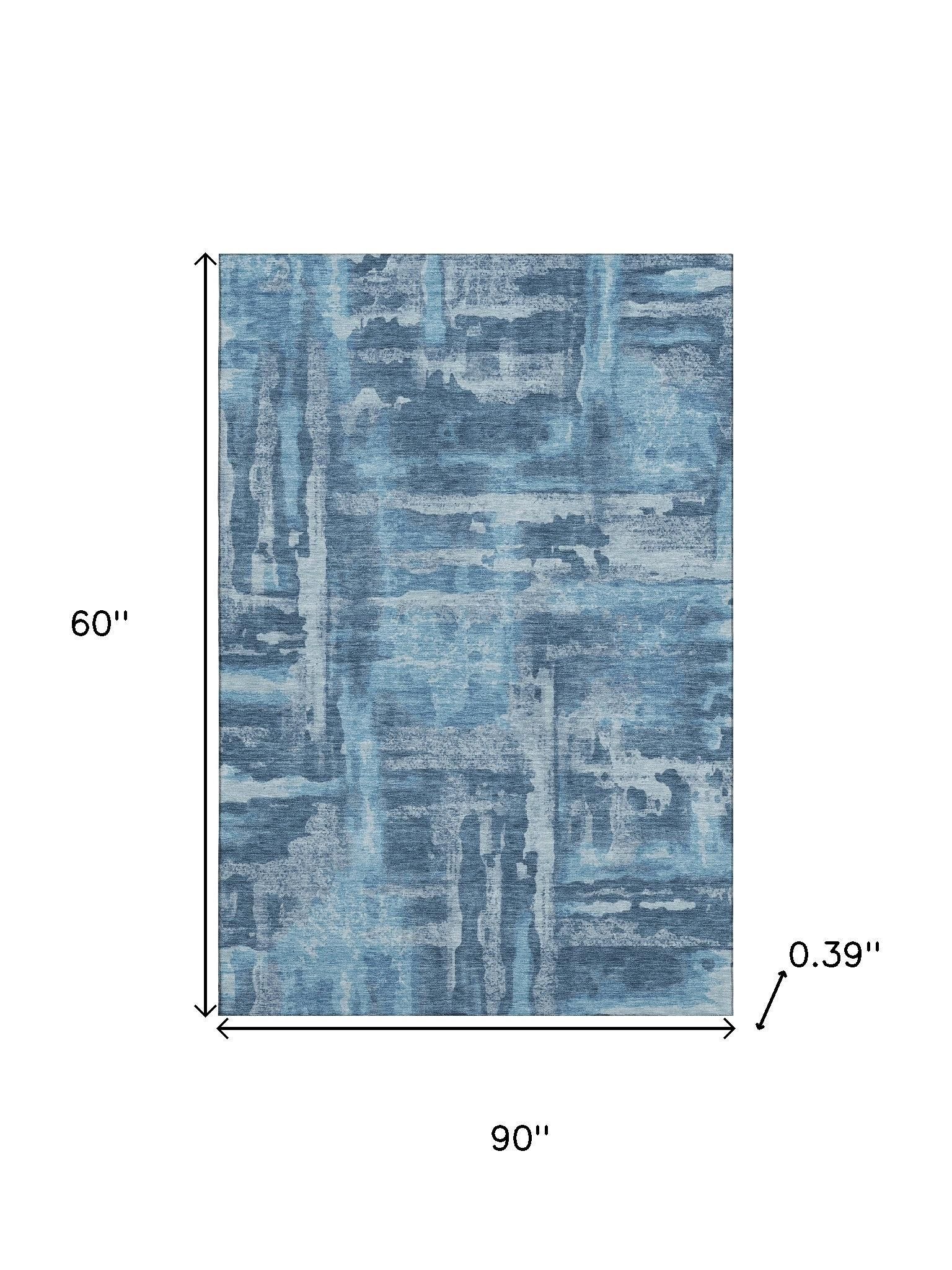 This 5-foot x 8-foot denim blue and sky blue abstract washable area rug with uv protection, is a great way to add warmth to a room. Ideal for spaces with kids and pets, this rug is stain resistant to help repel dirt and spilled liquids. Built to last, this rug crafted from polyester fibers is known for its durability and long lasting appeal. Rugs are a great way to showcase your style, hide imperfections, warm your home and reduce noise. This larger sized, transitional styled rug is ready to create a focal point or statement piece in your room. 60.00-inch h x 90.00-inch w x 0.39-inch d.