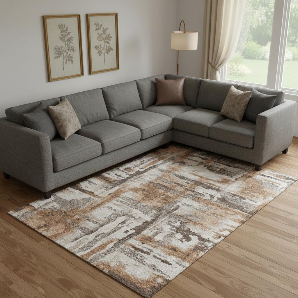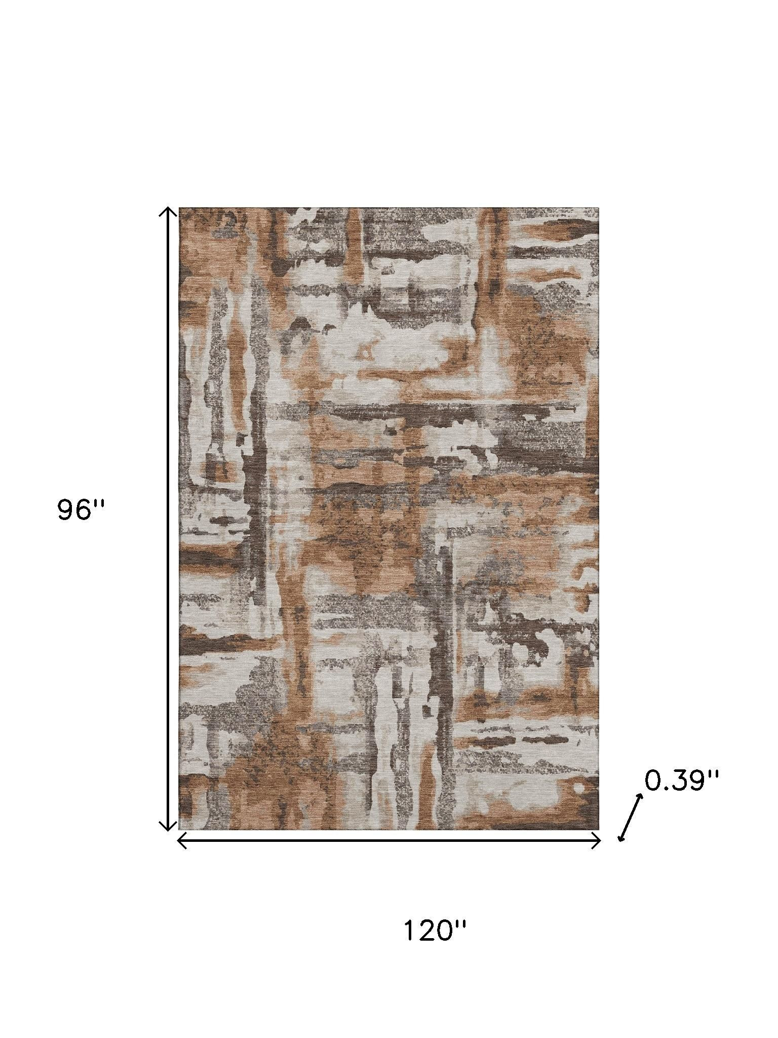 This 8-foot x 10-foot rust and brown abstract washable area rug with uv protection, is a great way to add warmth to a room. Ideal for spaces with kids and pets, this rug is stain resistant to help repel dirt and spilled liquids. Built to last, this rug crafted from polyester fibers is known for its durability and long lasting appeal. Rugs are a great way to showcase your style, hide imperfections, warm your home and reduce noise. This larger sized, transitional styled rug is ready to create a focal point or statement piece in your room. 96.00-inch h x 120.00-inch w x 0.39-inch d.