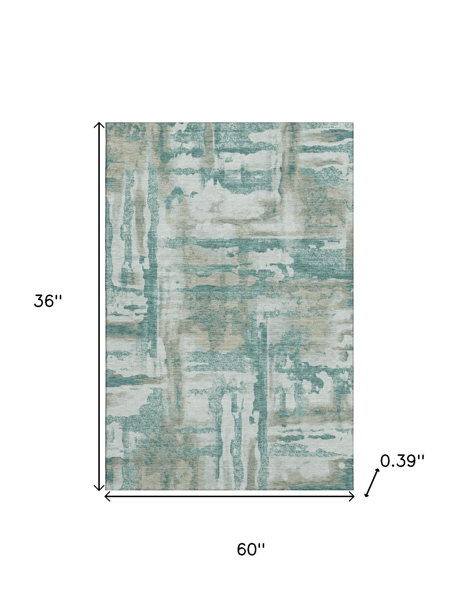 Set an inviting tone in your space with this 3-foot x 5-foot teal and taupe abstract washable area rug with uv protection. Ideal for spaces with kids and pets, this rug is stain resistant to help repel dirt and spilled liquids. Built to last, this rug crafted from polyester fibers is known for its durability and long lasting appeal. Rugs are a great way to showcase your style, hide imperfections, warm your home and reduce noise. This smaller sized, transitional styled rug is just what you need for your walkway, bedside, in front of door, cabinet, refrigerator, or chair. 36.00-inch h x 60.00-inch w x 0.39-inch d.