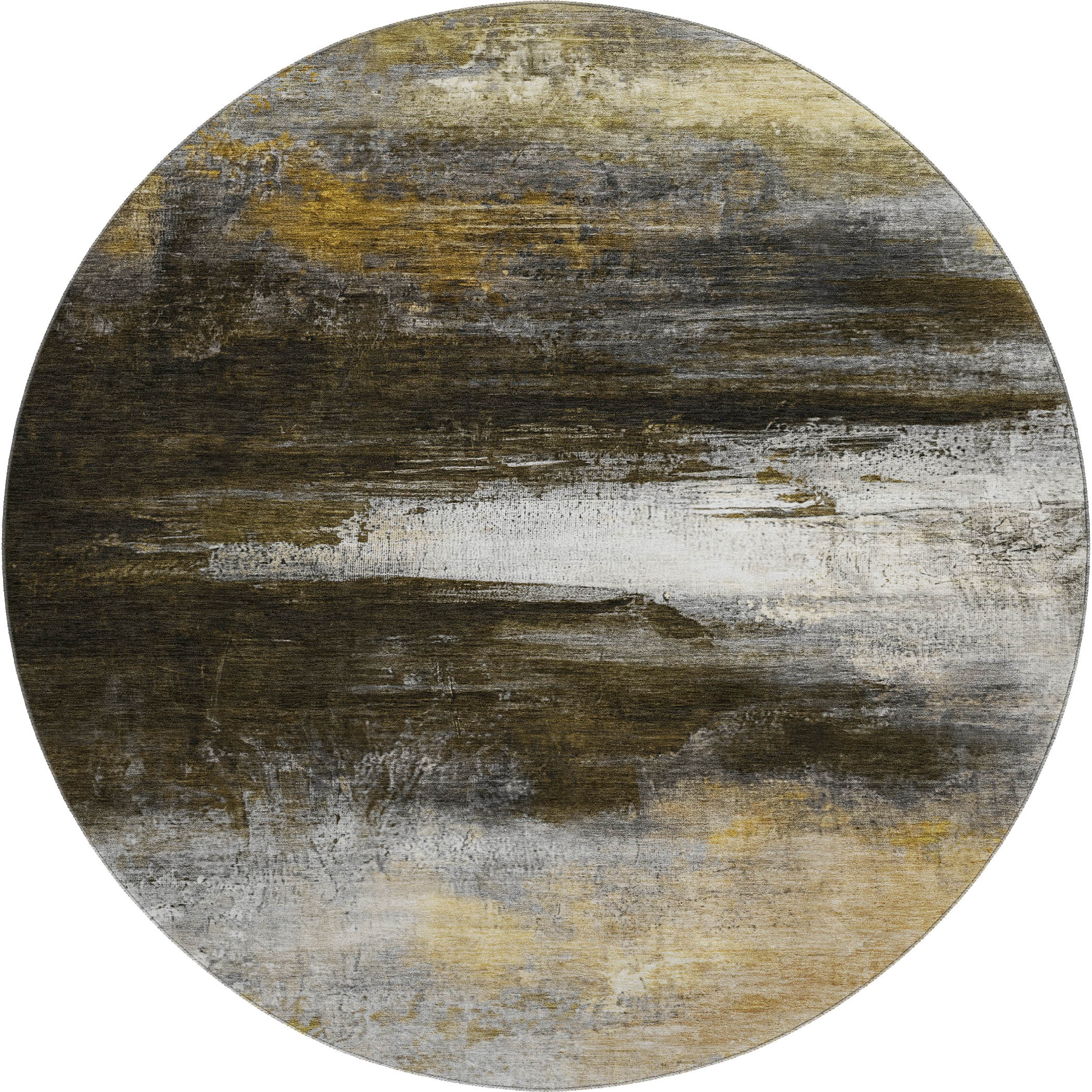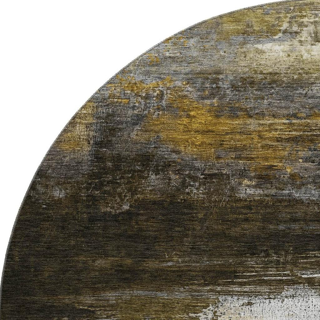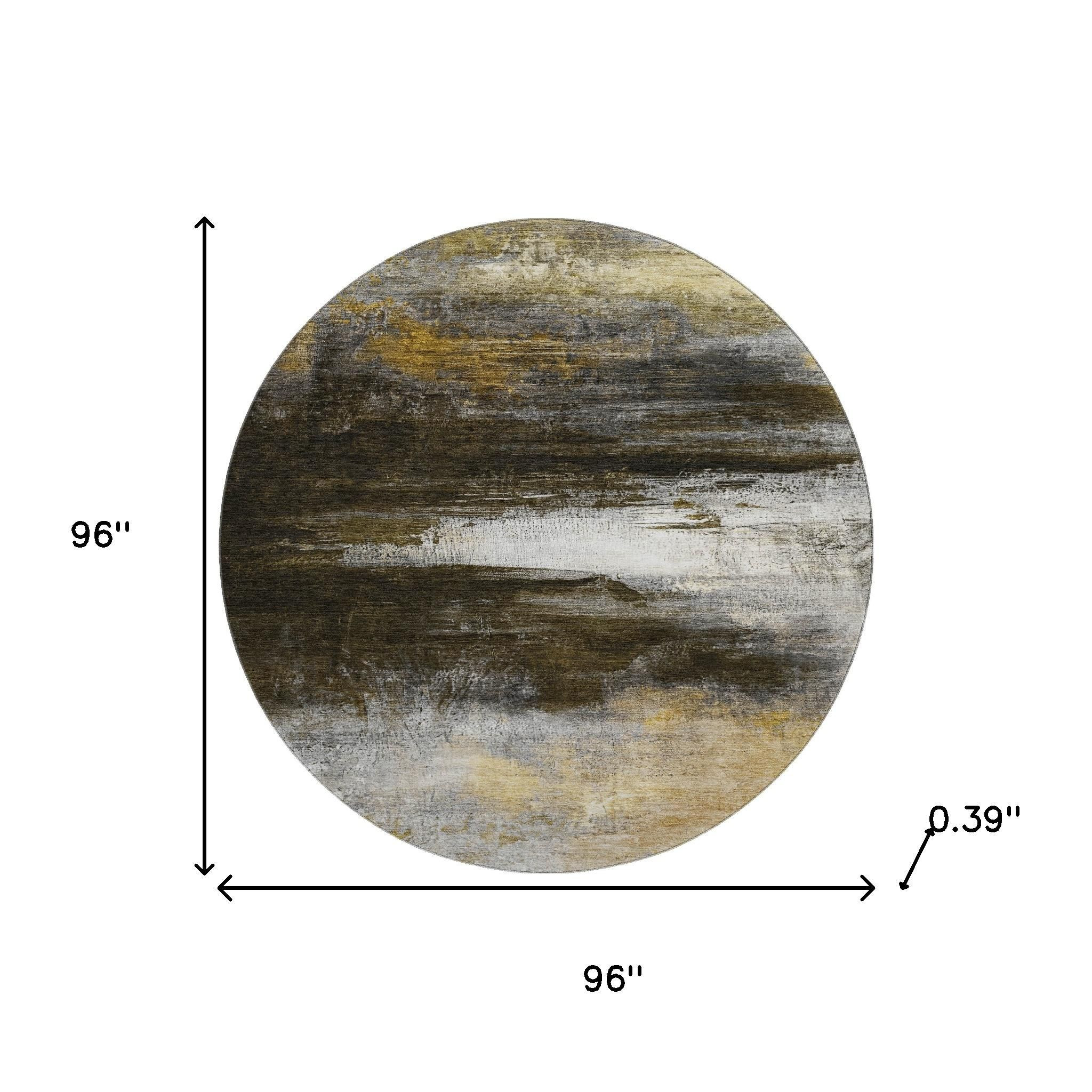 Add some artistry to your room with this 8-foot chocolate and gold abstract washable round rug with uv protection. Ideal for spaces with kids and pets, this rug is stain resistant to help repel dirt and spilled liquids. Built to last, this rug crafted from polyester fibers is known for its durability and long lasting appeal. Rugs are a great way to showcase your style, hide imperfections, warm your home and reduce noise. This larger sized, transitional styled rug is ready to create a focal point or statement piece in your room. 96.00-inch h x 96.00-inch w x 0.39-inch d.