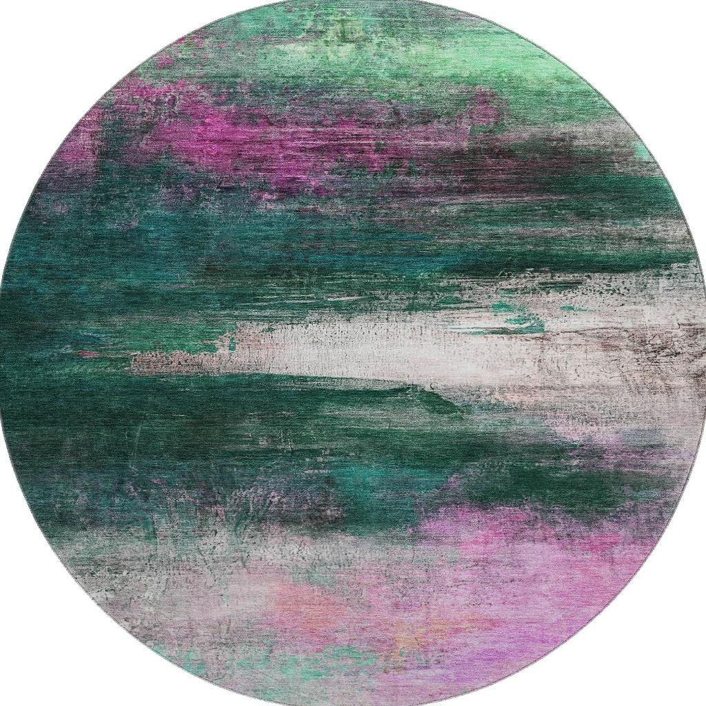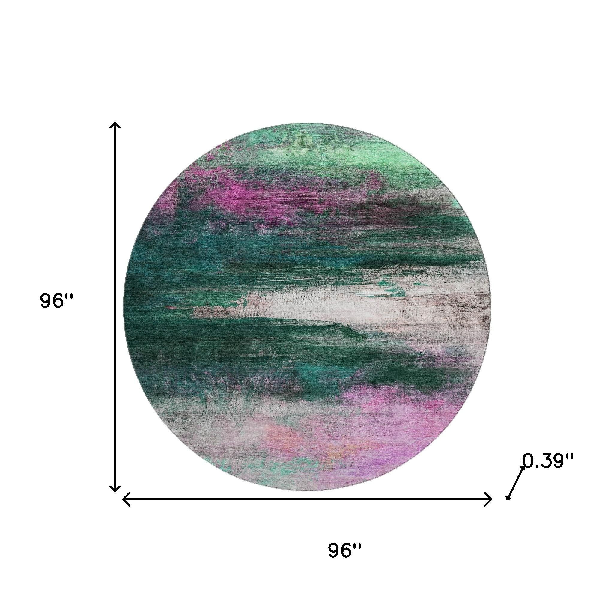 Add some artistry to your room with this 8-foot green and mauve abstract washable round rug with uv protection. Ideal for spaces with kids and pets, this rug is stain resistant to help repel dirt and spilled liquids. Built to last, this rug crafted from polyester fibers is known for its durability and long lasting appeal. Rugs are a great way to showcase your style, hide imperfections, warm your home and reduce noise. This larger sized, transitional styled rug is ready to create a focal point or statement piece in your room. 96.00-inch h x 96.00-inch w x 0.39-inch d.