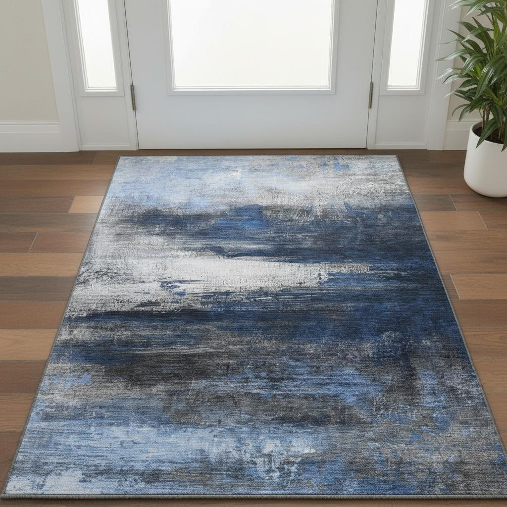 Add great coloration and comfortable texture to your space with this 3-foot x 5-foot navy blue and ivory abstract washable area rug with uv protection. Ideal for spaces with kids and pets, this rug is stain resistant to help repel dirt and spilled liquids. Built to last, this rug crafted from polyester fibers is known for its durability and long lasting appeal. Rugs are a great way to showcase your style, hide imperfections, warm your home and reduce noise. This smaller sized, transitional styled rug is just what you need for your walkway, bedside, in front of door, cabinet, refrigerator, or chair. 36.00-inch h x 60.00-inch w x 0.39-inch d.