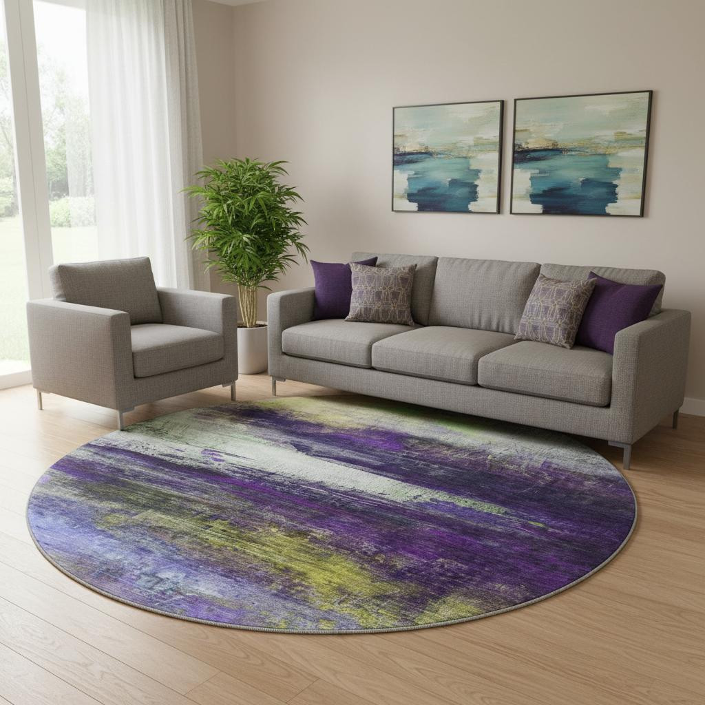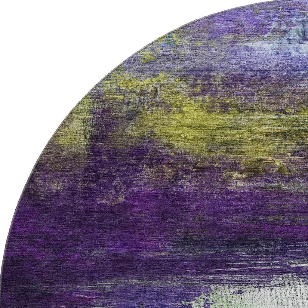 Set an inviting tone in your space with this 8-foot purple and lime green abstract washable round rug with uv protection. Ideal for spaces with kids and pets, this rug is stain resistant to help repel dirt and spilled liquids. Built to last, this rug crafted from polyester fibers is known for its durability and long lasting appeal. Rugs are a great way to showcase your style, hide imperfections, warm your home and reduce noise. This larger sized, transitional styled rug is ready to create a focal point or statement piece in your room. 96.00-inch h x 96.00-inch w x 0.39-inch d.
