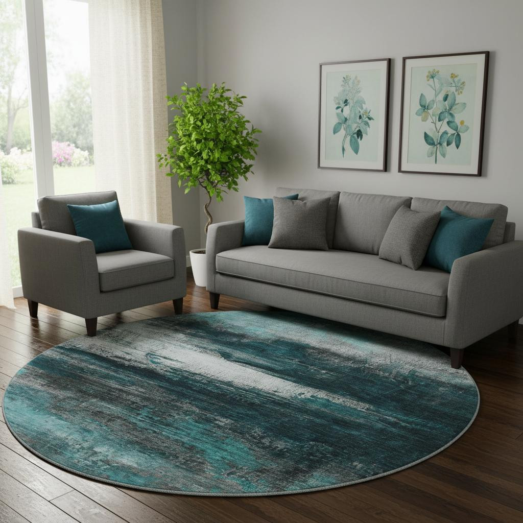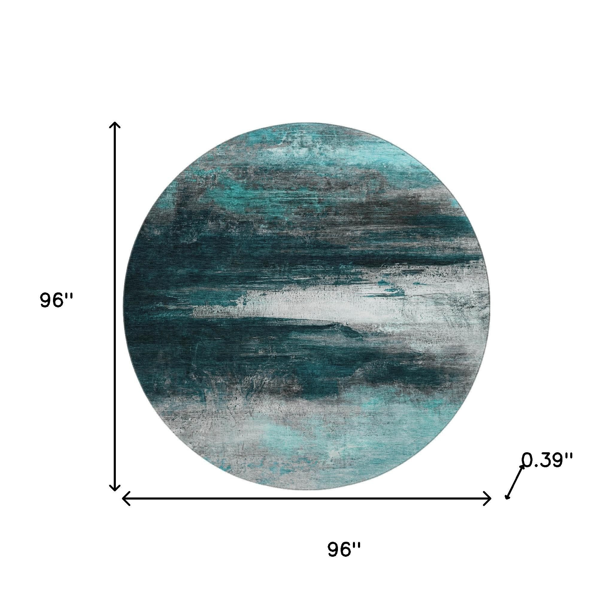 Add some artistry to your room with this 8-foot teal and gray abstract washable round rug with uv protection. Ideal for spaces with kids and pets, this rug is stain resistant to help repel dirt and spilled liquids. Built to last, this rug crafted from polyester fibers is known for its durability and long lasting appeal. Rugs are a great way to showcase your style, hide imperfections, warm your home and reduce noise. This larger sized, transitional styled rug is ready to create a focal point or statement piece in your room. 96.00-inch h x 96.00-inch w x 0.39-inch d.