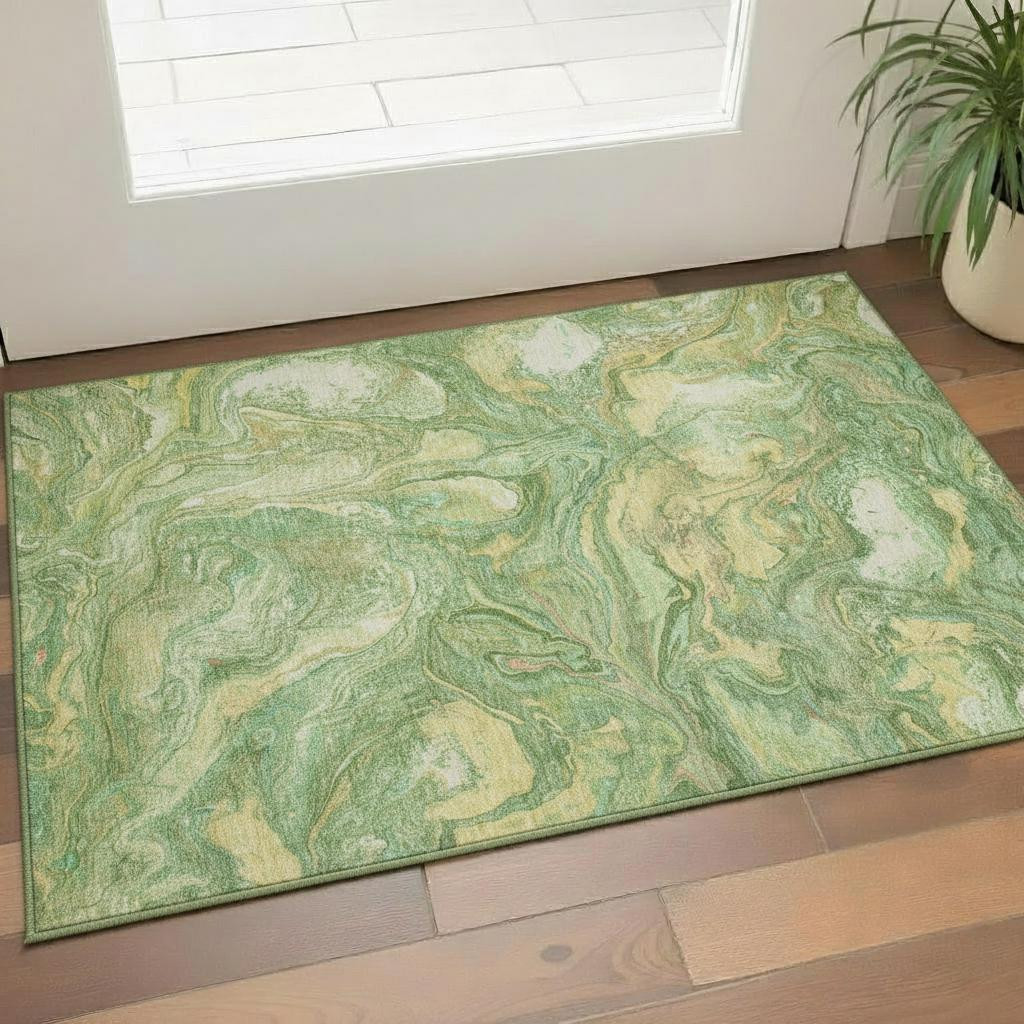 This 3-foot x 5-foot green and gold abstract washable area rug with uv protection, is a great way to add warmth to a room. Ideal for spaces with kids and pets, this rug is stain resistant to help repel dirt and spilled liquids. Built to last, this rug crafted from polyester fibers is known for its durability and long lasting appeal. Rugs are a great way to showcase your style, hide imperfections, warm your home and reduce noise. This smaller sized, transitional styled rug is just what you need for your walkway, bedside, in front of door, cabinet, refrigerator, or chair. 36.00-inch h x 60.00-inch w x 0.39-inch d.