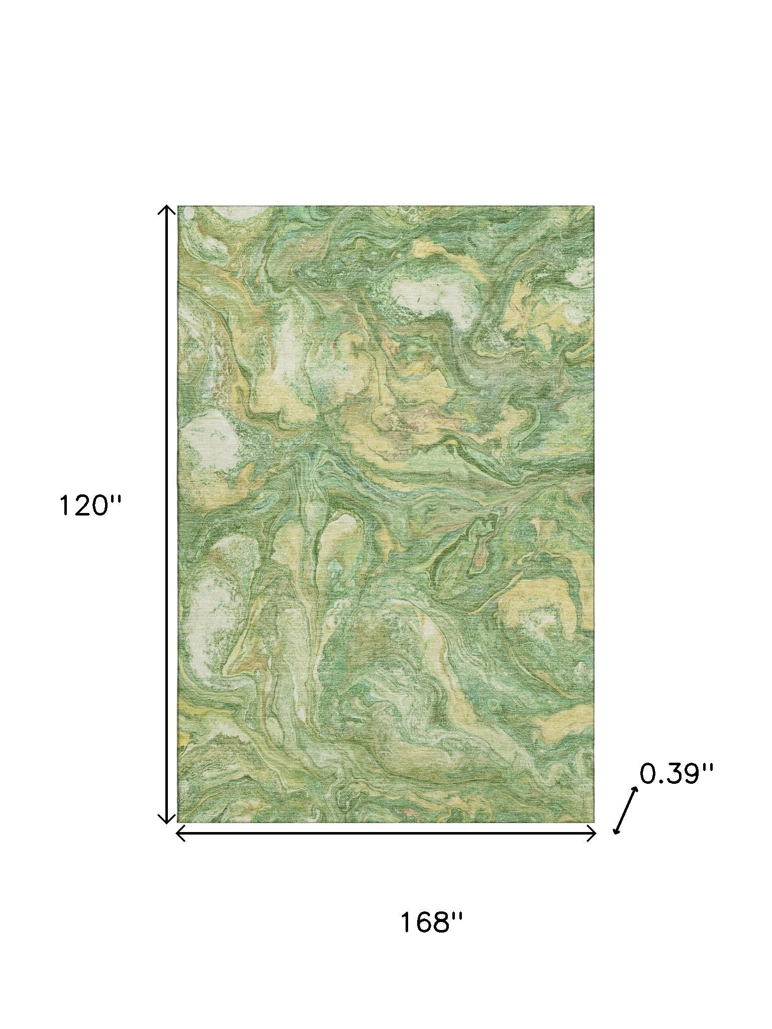 Set an inviting tone in your space with this 10-foot x 14-foot green and gold abstract washable area rug with uv protection. Ideal for spaces with kids and pets, this rug is stain resistant to help repel dirt and spilled liquids. Built to last, this rug crafted from polyester fibers is known for its durability and long lasting appeal. Rugs are a great way to showcase your style, hide imperfections, warm your home and reduce noise. This larger sized, transitional styled rug is ready to create a focal point or statement piece in your room. 120.00-inch h x 168.00-inch w x 0.39-inch d.