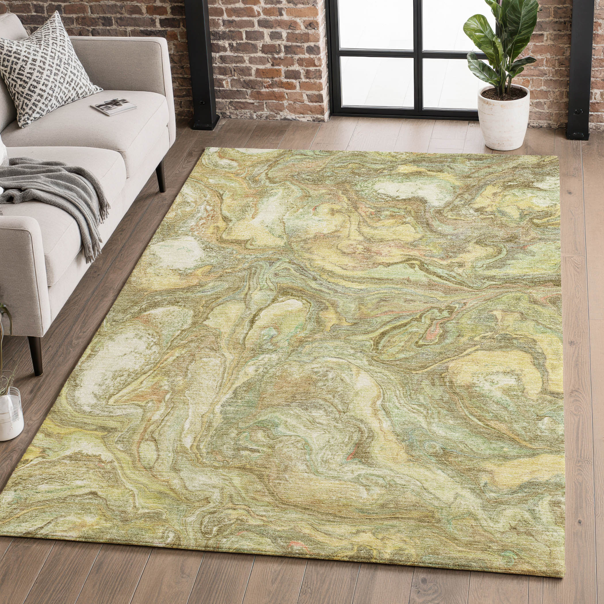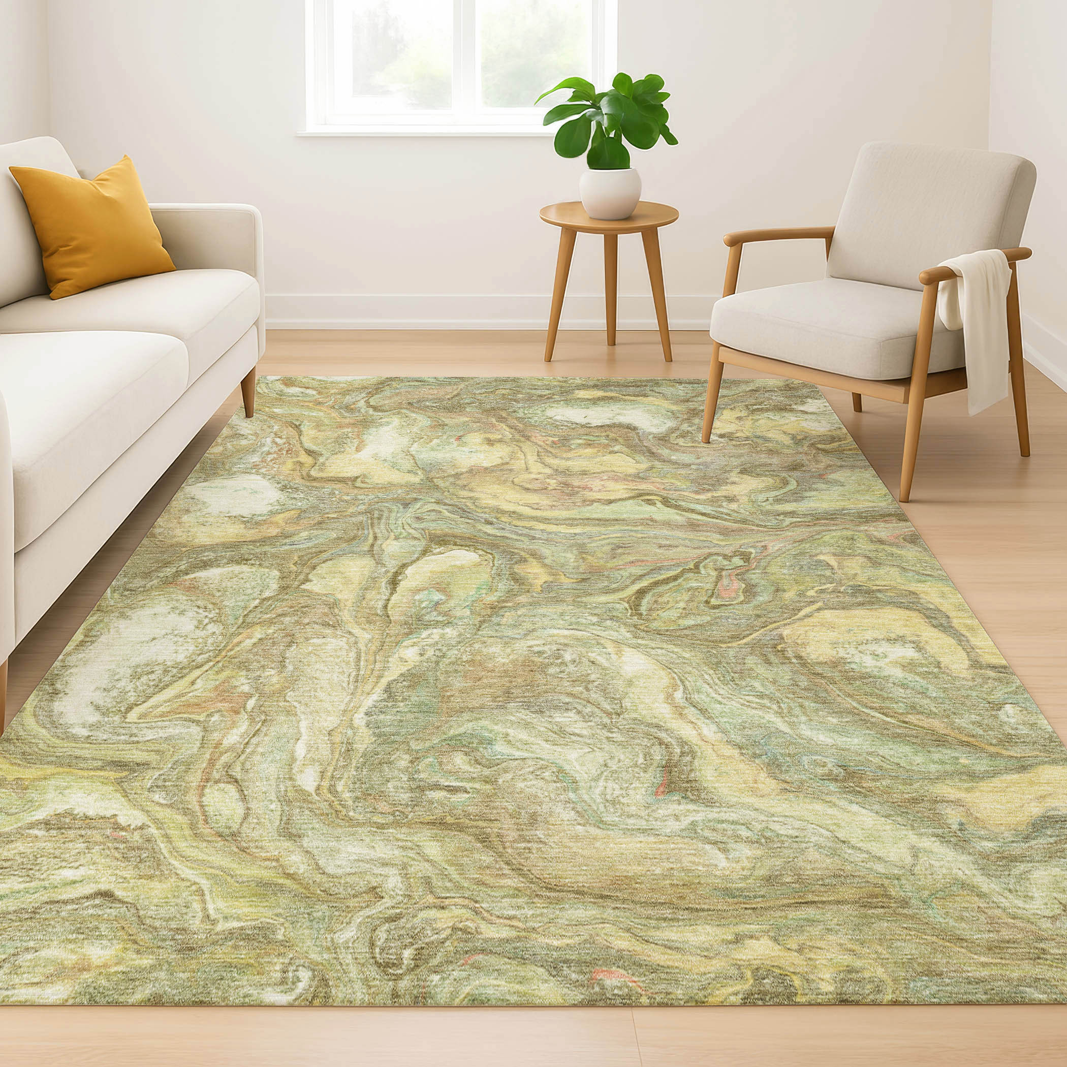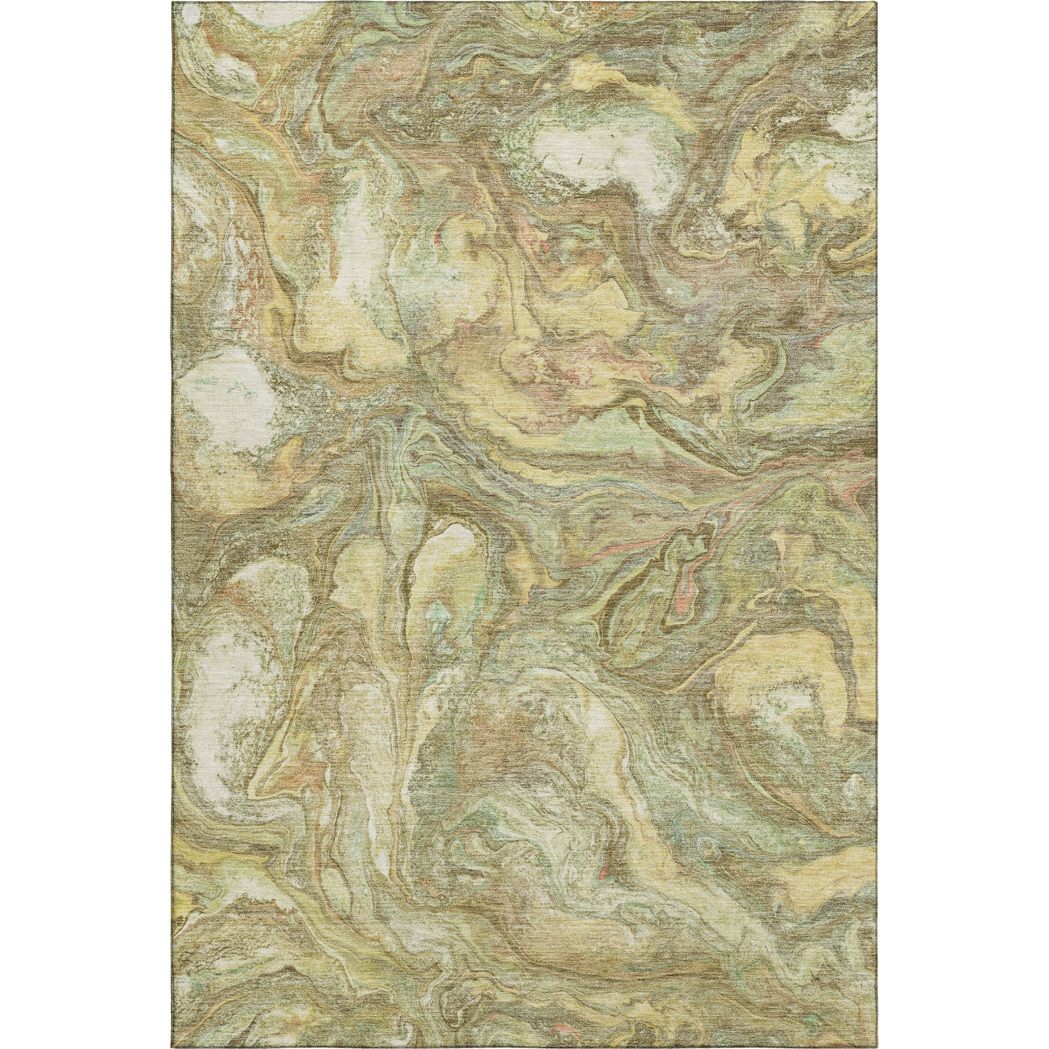 This 5-foot x 8-foot gold and beige abstract washable area rug with uv protection, is a great way to add warmth to a room. Ideal for spaces with kids and pets, this rug is stain resistant to help repel dirt and spilled liquids. Built to last, this rug crafted from polyester fibers is known for its durability and long lasting appeal. Rugs are a great way to showcase your style, hide imperfections, warm your home and reduce noise. This larger sized, transitional styled rug is ready to create a focal point or statement piece in your room. 60.00-inch h x 90.00-inch w x 0.39-inch d.