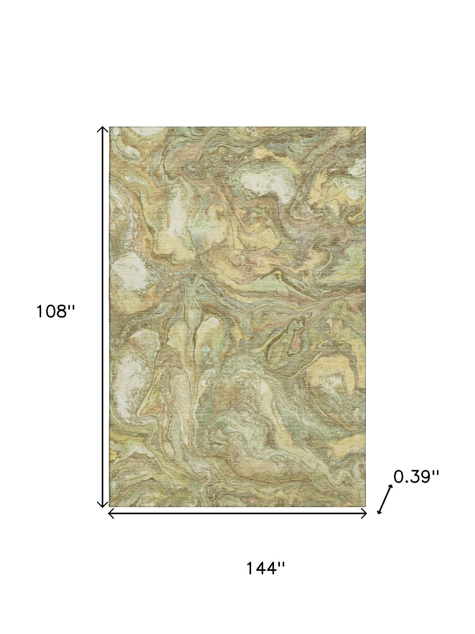 Add some artistry to your room with this 9-foot x 12-foot gold and beige abstract washable area rug with uv protection. Ideal for spaces with kids and pets, this rug is stain resistant to help repel dirt and spilled liquids. Built to last, this rug crafted from polyester fibers is known for its durability and long lasting appeal. Rugs are a great way to showcase your style, hide imperfections, warm your home and reduce noise. This larger sized, transitional styled rug is ready to create a focal point or statement piece in your room. 108.00-inch h x 144.00-inch w x 0.39-inch d.