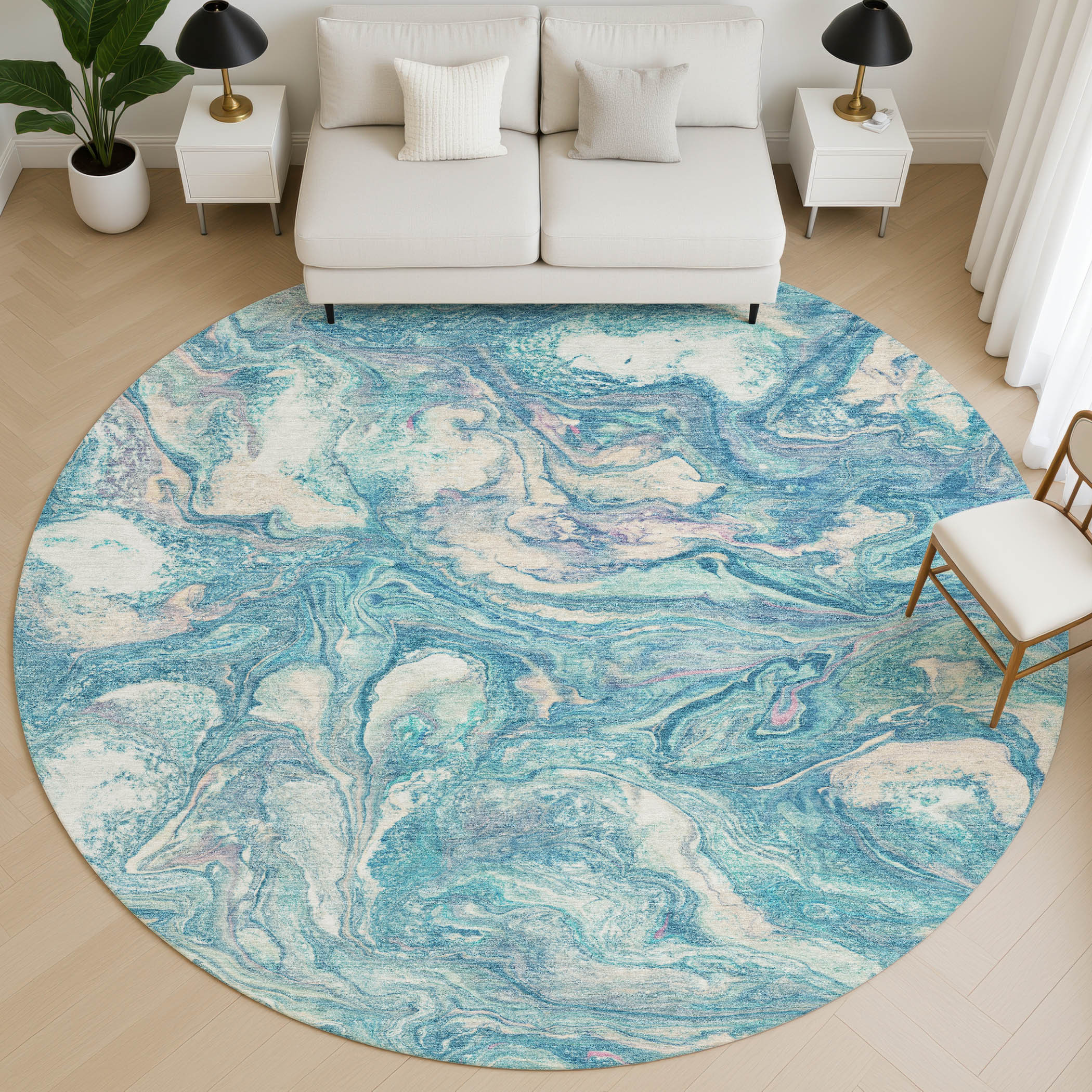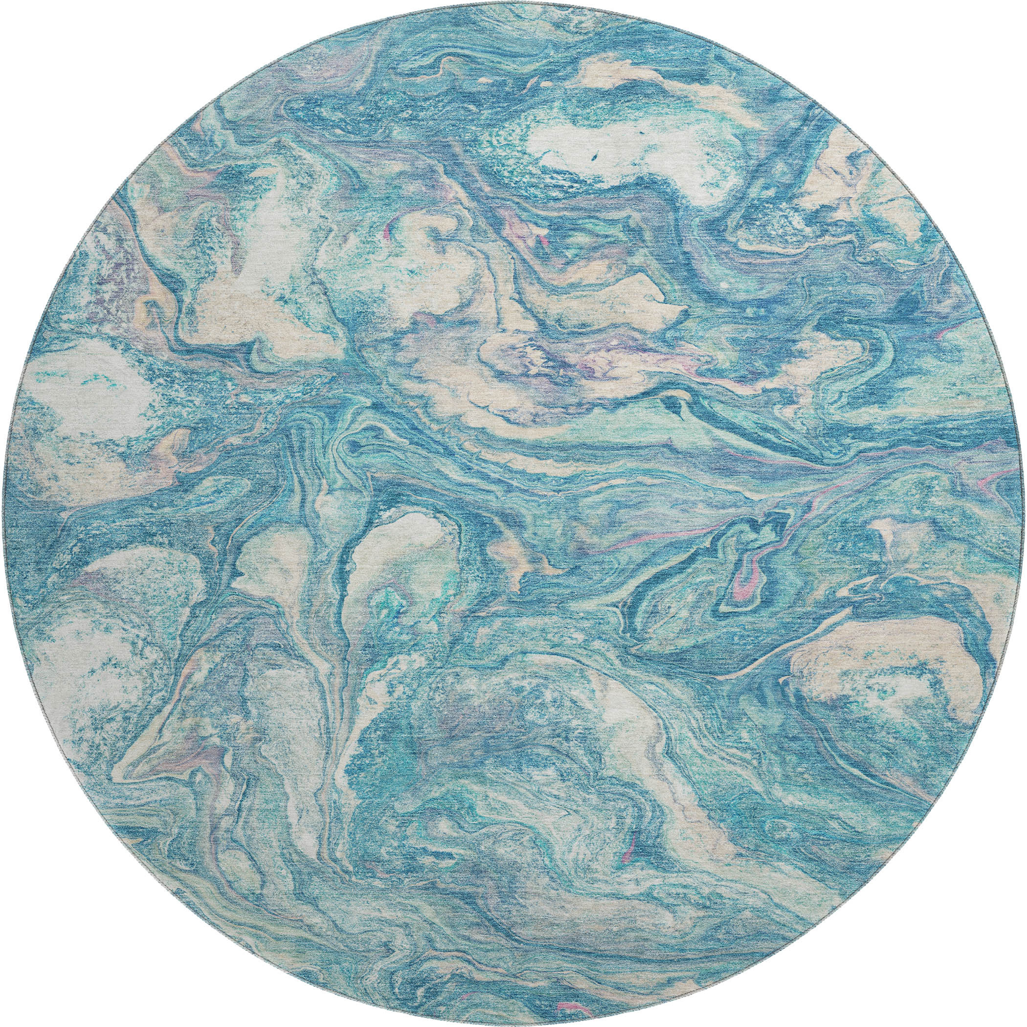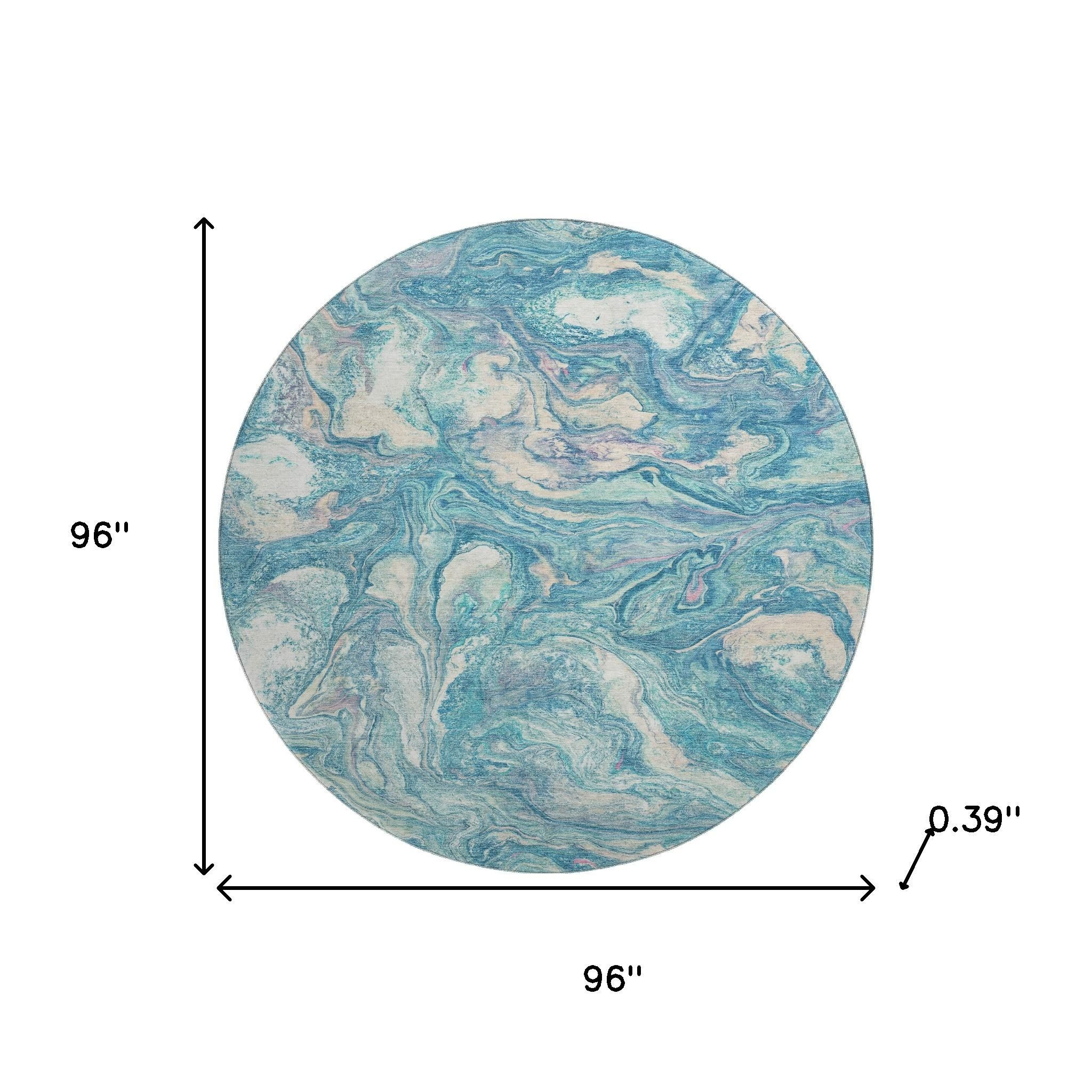 This 8-foot teal and ivory abstract washable round rug with uv protection, is a great way to add warmth to a room. Ideal for spaces with kids and pets, this rug is stain resistant to help repel dirt and spilled liquids. Built to last, this rug crafted from polyester fibers is known for its durability and long lasting appeal. Rugs are a great way to showcase your style, hide imperfections, warm your home and reduce noise. This larger sized, transitional styled rug is ready to create a focal point or statement piece in your room. 96.00-inch h x 96.00-inch w x 0.39-inch d.