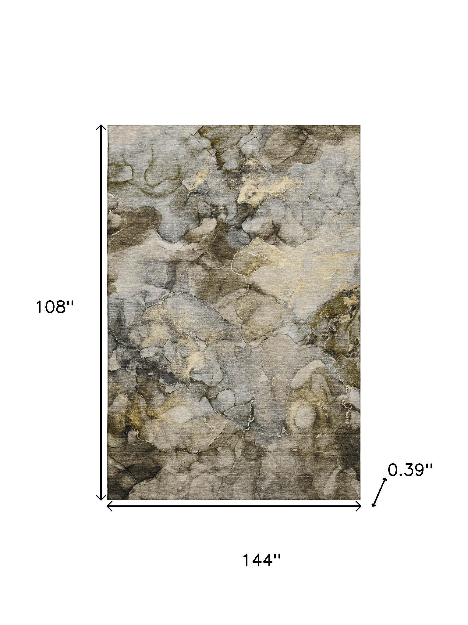 Add some artistry to your room with this 9-foot x 12-foot pewter and gold abstract washable area rug with uv protection. Ideal for spaces with kids and pets, this rug is stain resistant to help repel dirt and spilled liquids. Built to last, this rug crafted from polyester fibers is known for its durability and long lasting appeal. Rugs are a great way to showcase your style, hide imperfections, warm your home and reduce noise. This larger sized, transitional styled rug is ready to create a focal point or statement piece in your room. 108.00-inch h x 144.00-inch w x 0.39-inch d.