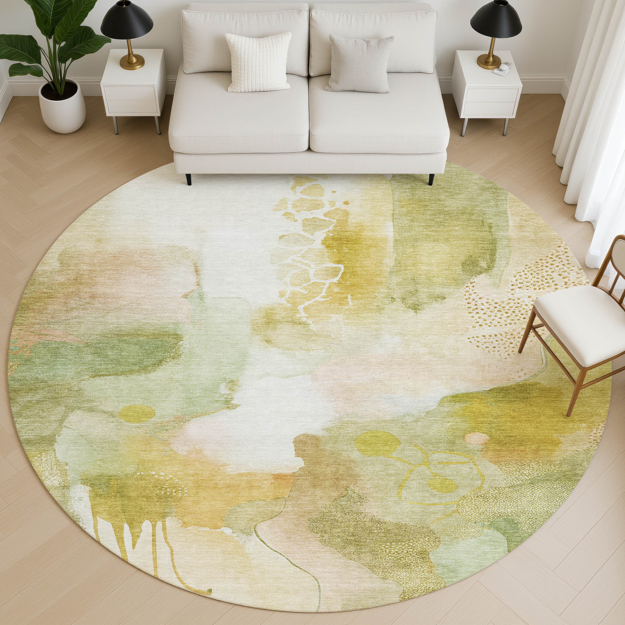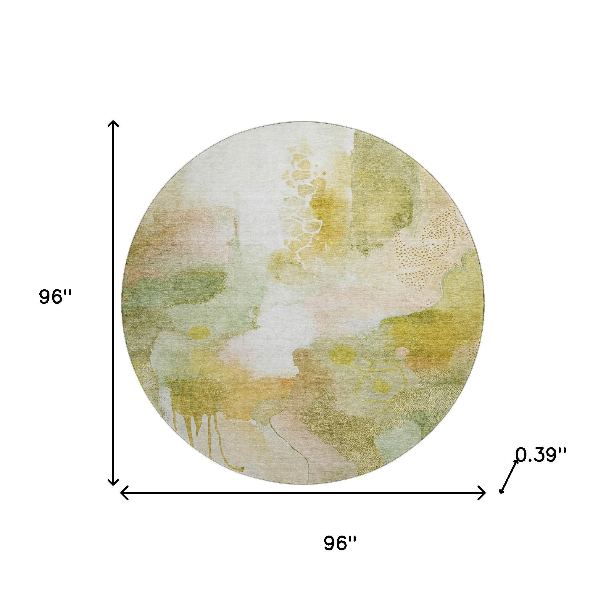 Set an inviting tone in your space with this 8-foot fern green and ivory abstract washable round rug with uv protection. Ideal for spaces with kids and pets, this rug is stain resistant to help repel dirt and spilled liquids. Built to last, this rug crafted from polyester fibers is known for its durability and long lasting appeal. Rugs are a great way to showcase your style, hide imperfections, warm your home and reduce noise. This larger sized, transitional styled rug is ready to create a focal point or statement piece in your room. 96.00-inch h x 96.00-inch w x 0.39-inch d.