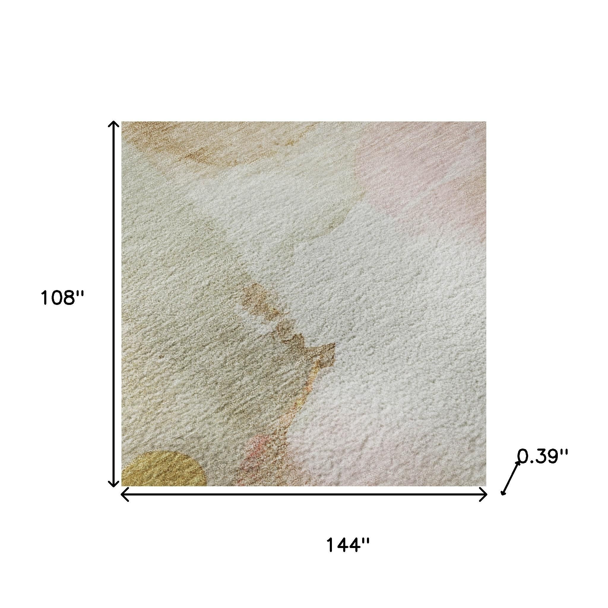 Add some artistry to your room with this 9-foot x 12-foot mauve and copper abstract washable area rug with uv protection. Ideal for spaces with kids and pets, this rug is stain resistant to help repel dirt and spilled liquids. Built to last, this rug crafted from polyester fibers is known for its durability and long lasting appeal. Rugs are a great way to showcase your style, hide imperfections, warm your home and reduce noise. This larger sized, transitional styled rug is ready to create a focal point or statement piece in your room. 108.00-inch h x 144.00-inch w x 0.39-inch d.