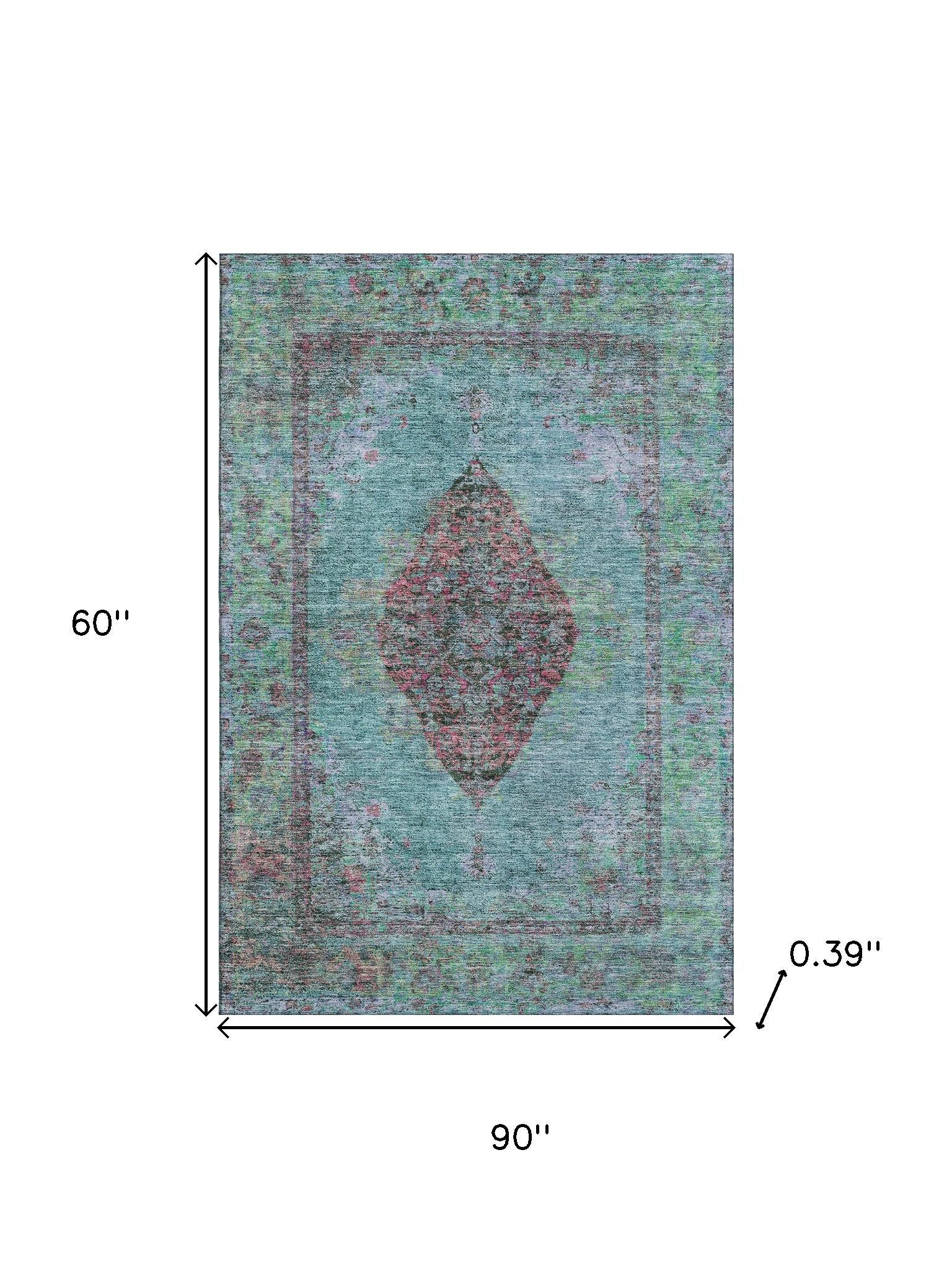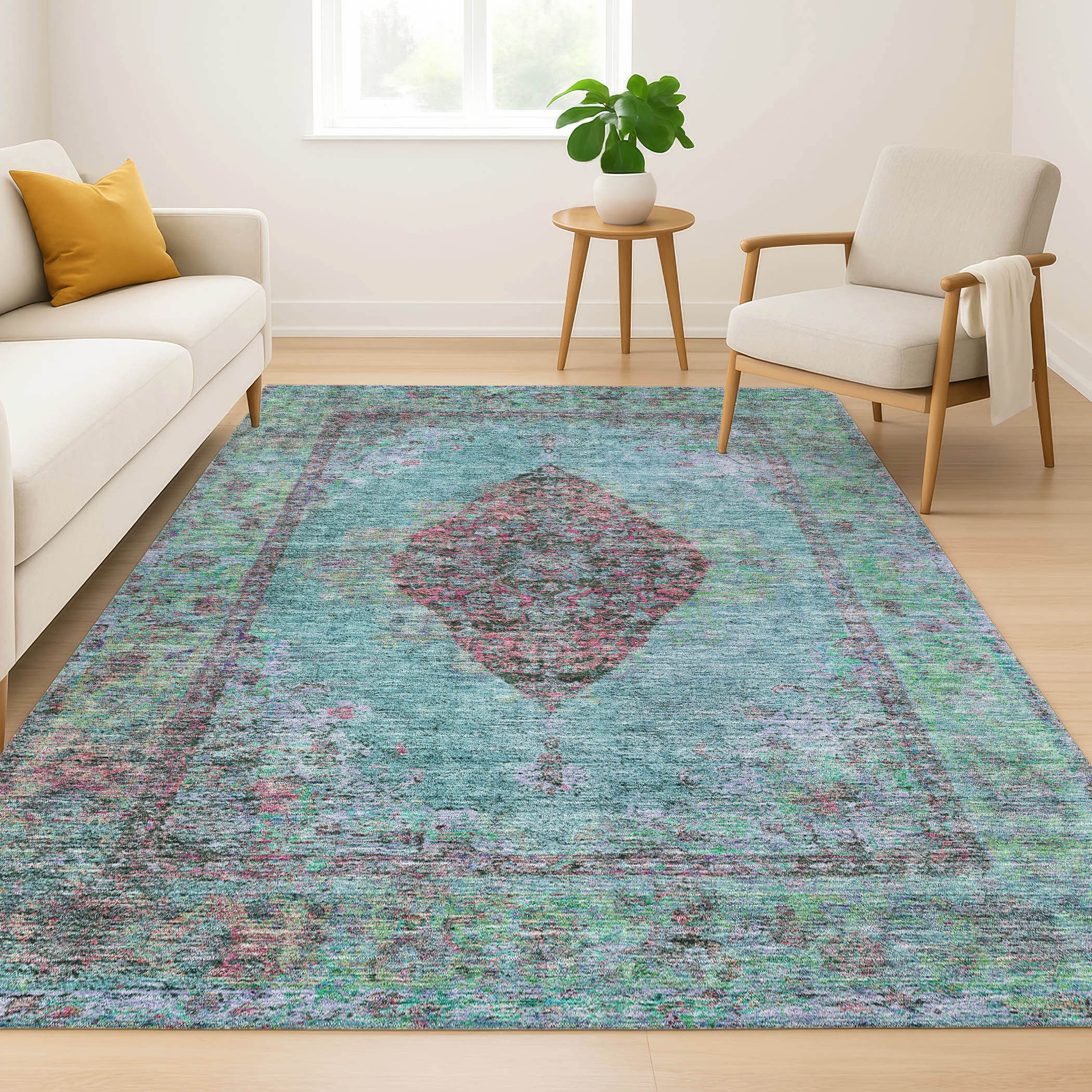 Add some artistry to your room with this 5-foot x 8-foot aqua and purple medallion washable area rug with uv protection. Ideal for spaces with kids and pets, this rug is stain resistant to help repel dirt and spilled liquids. Built to last, this rug crafted from polyester fibers is known for its durability and long lasting appeal. Rugs are a great way to showcase your style, hide imperfections, warm your home and reduce noise. This larger sized, traditional styled rug is ready to create a focal point or statement piece in your room. 60.00-inch h x 90.00-inch w x 0.39-inch d.