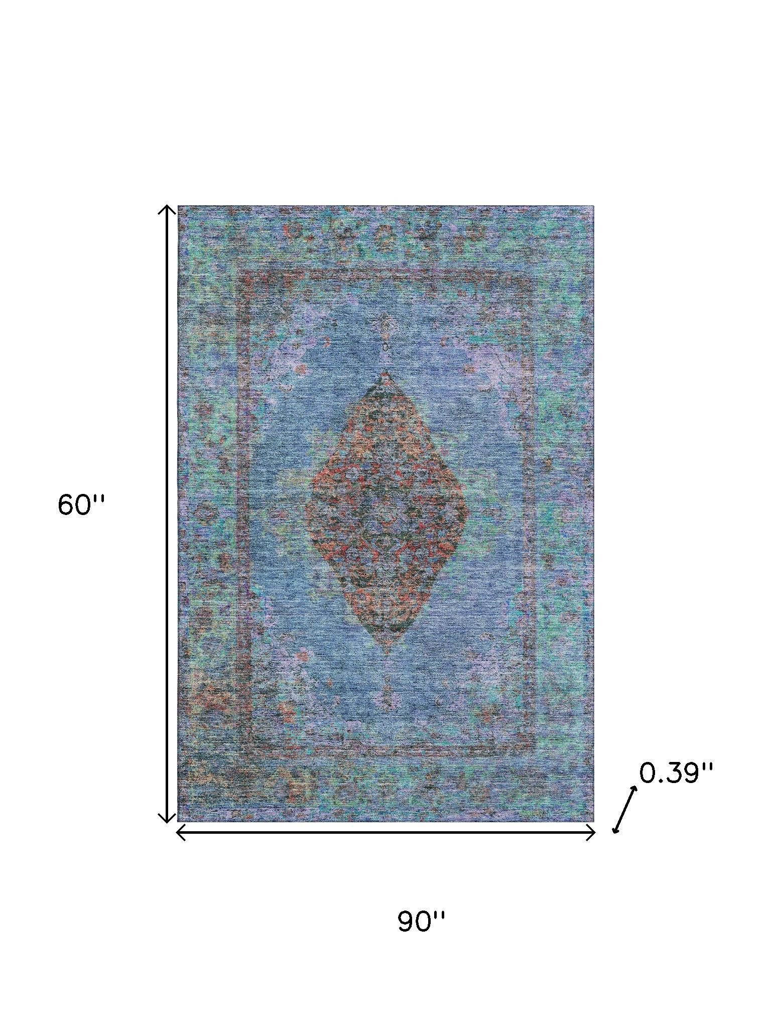 Set an inviting tone in your space with this 5-foot x 8-foot blue and rust medallion washable area rug with uv protection. Ideal for spaces with kids and pets, this rug is stain resistant to help repel dirt and spilled liquids. Built to last, this rug crafted from polyester fibers is known for its durability and long lasting appeal. Rugs are a great way to showcase your style, hide imperfections, warm your home and reduce noise. This larger sized, traditional styled rug is ready to create a focal point or statement piece in your room. 60.00-inch h x 90.00-inch w x 0.39-inch d.