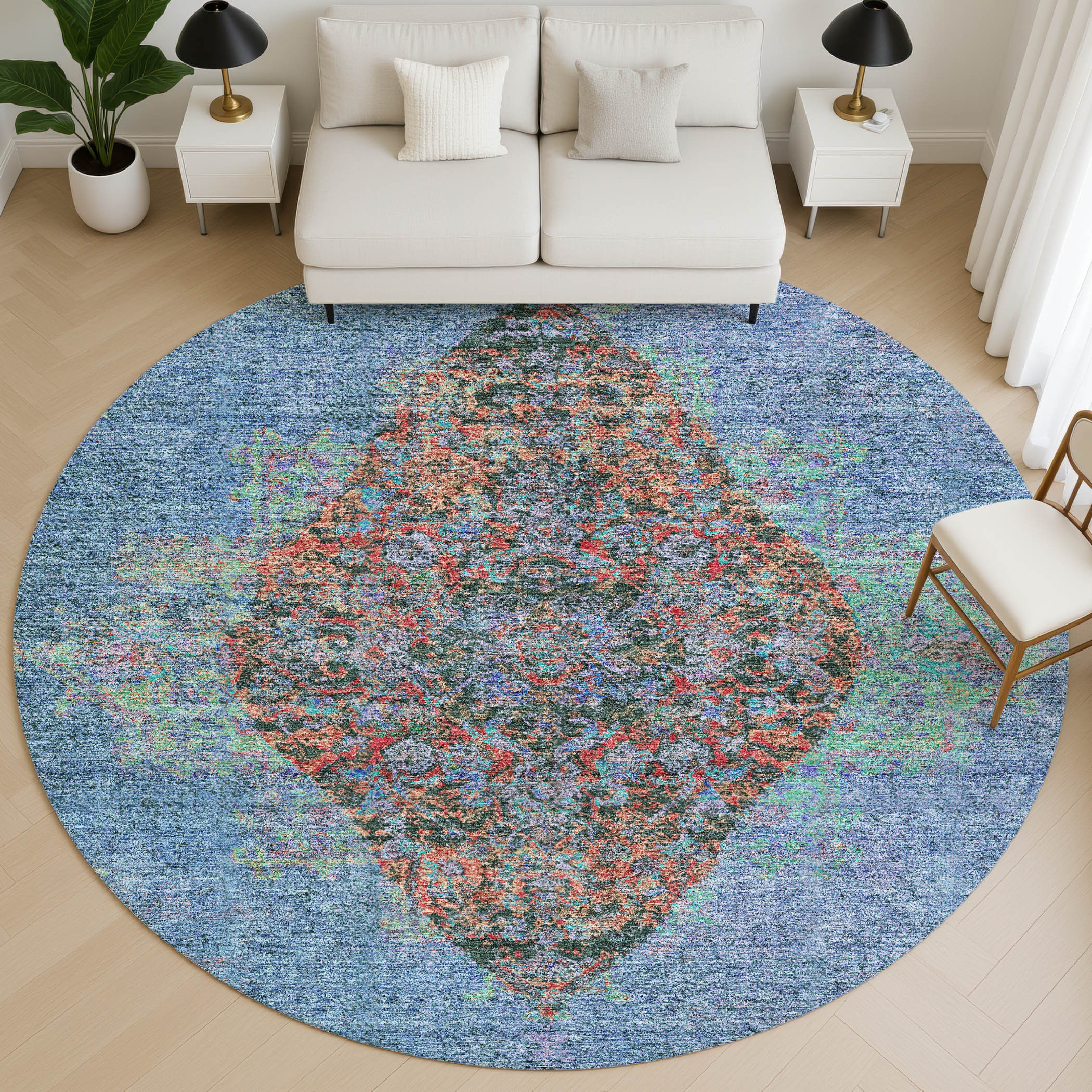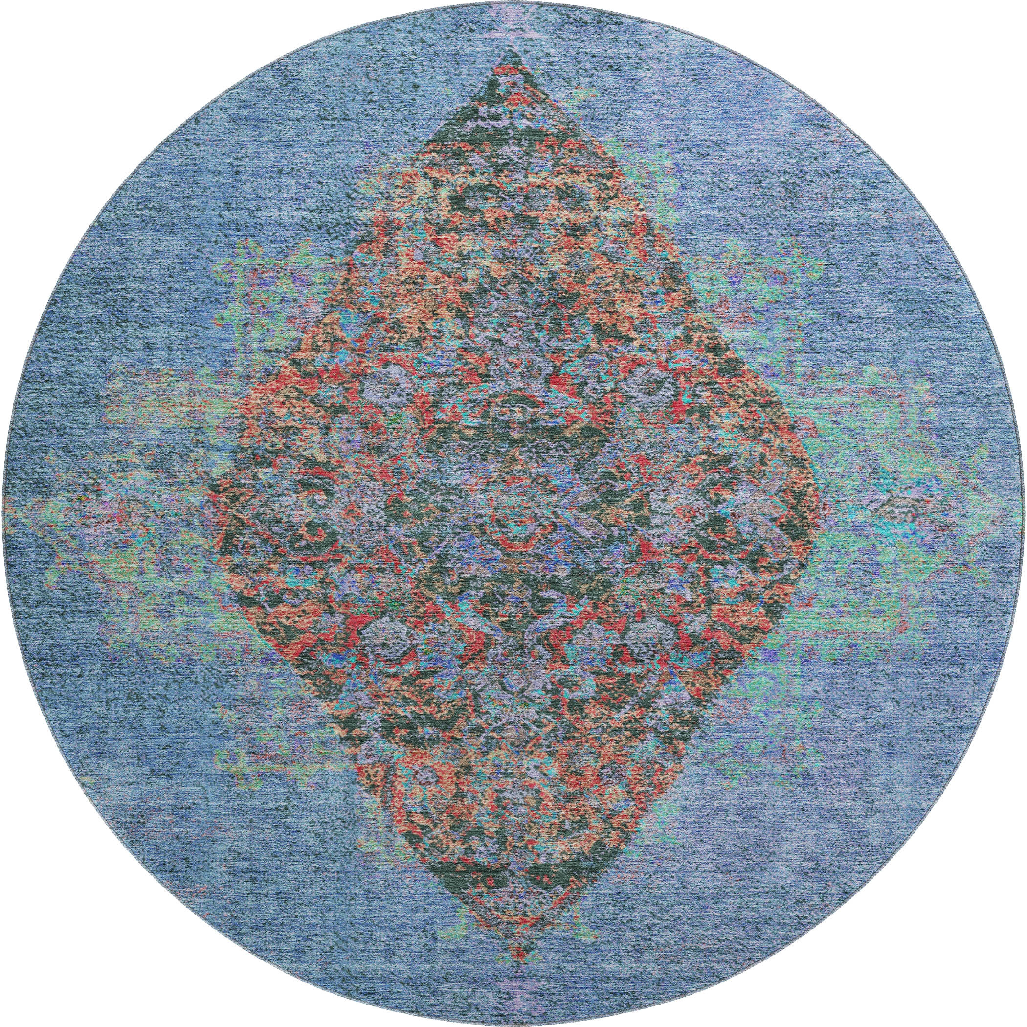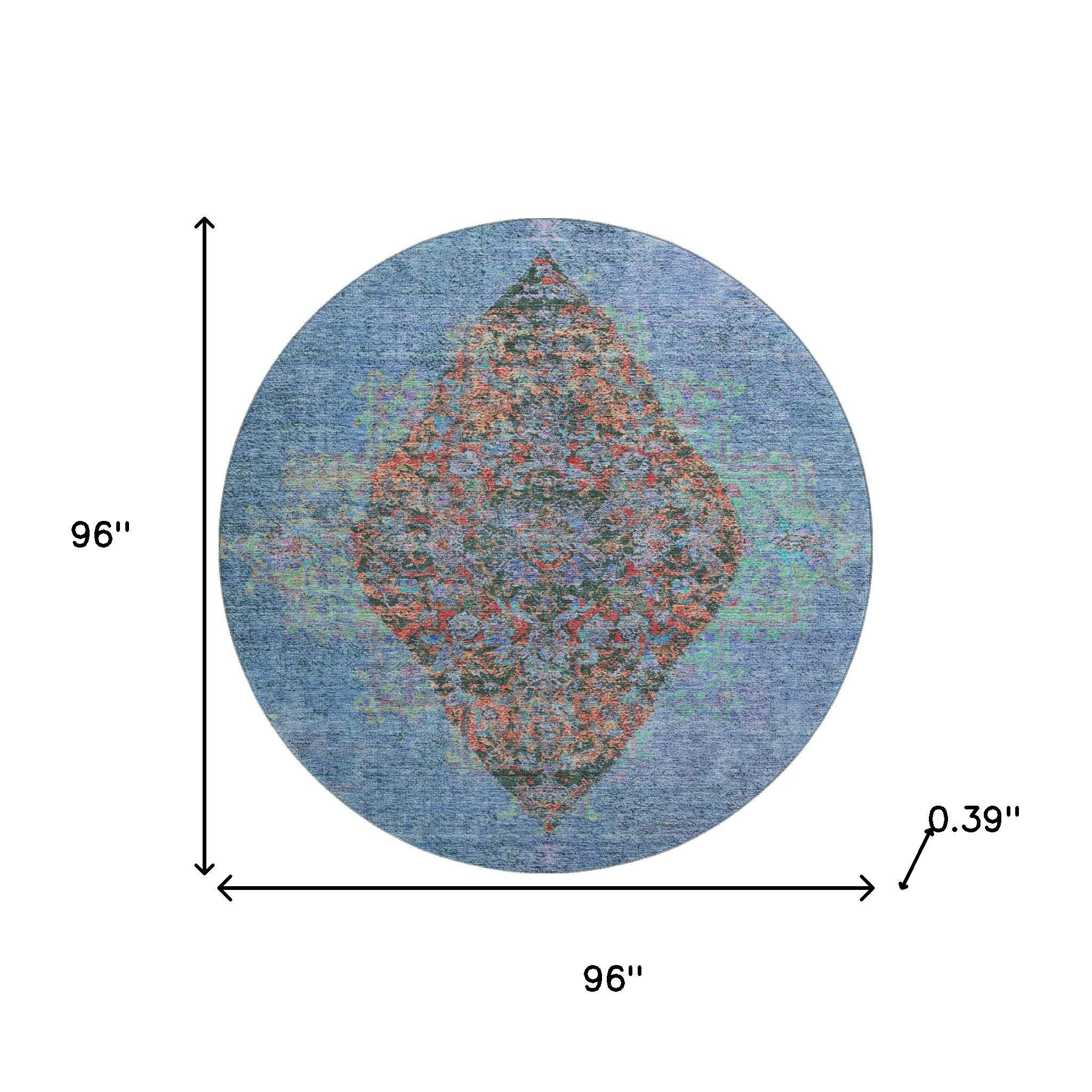 This 8-foot blue and rust medallion washable round rug with uv protection, is a great way to add warmth to a room. Ideal for spaces with kids and pets, this rug is stain resistant to help repel dirt and spilled liquids. Built to last, this rug crafted from polyester fibers is known for its durability and long lasting appeal. Rugs are a great way to showcase your style, hide imperfections, warm your home and reduce noise. This larger sized, traditional styled rug is ready to create a focal point or statement piece in your room. 96.00-inch h x 96.00-inch w x 0.39-inch d.