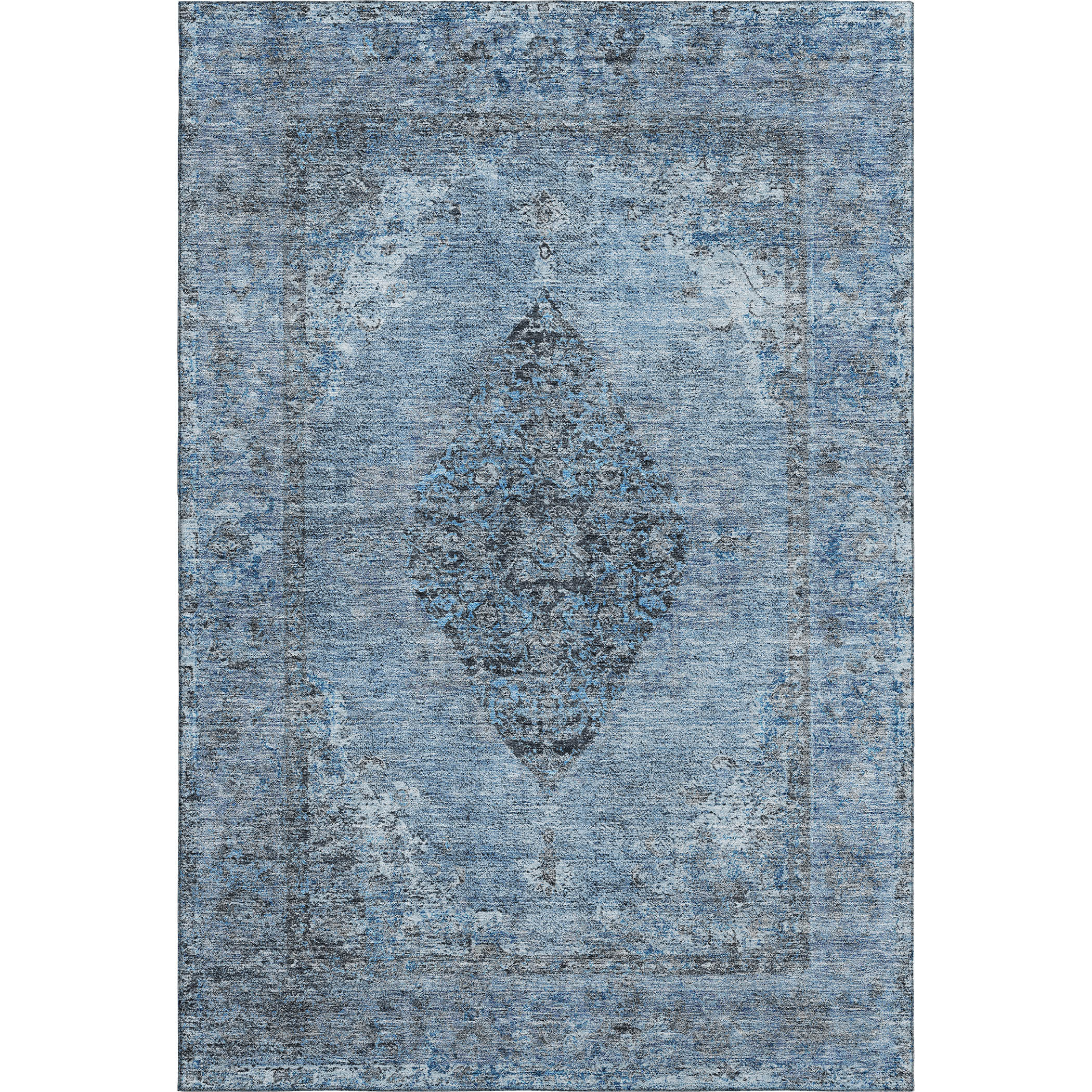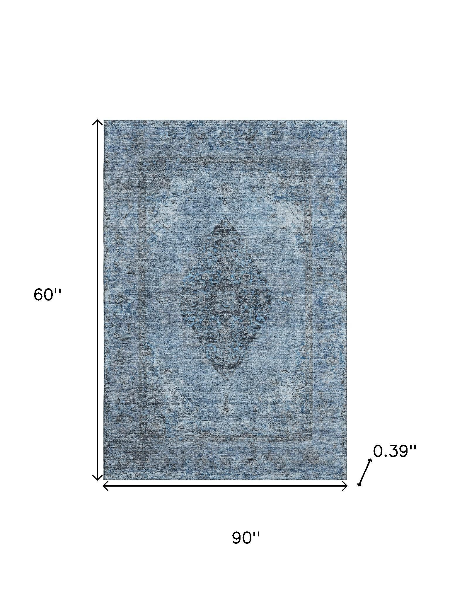 Add some artistry to your room with this 5-foot x 8-foot denim blue and gray medallion washable area rug with uv protection. Ideal for spaces with kids and pets, this rug is stain resistant to help repel dirt and spilled liquids. Built to last, this rug crafted from polyester fibers is known for its durability and long lasting appeal. Rugs are a great way to showcase your style, hide imperfections, warm your home and reduce noise. This larger sized, traditional styled rug is ready to create a focal point or statement piece in your room. 60.00-inch h x 90.00-inch w x 0.39-inch d.
