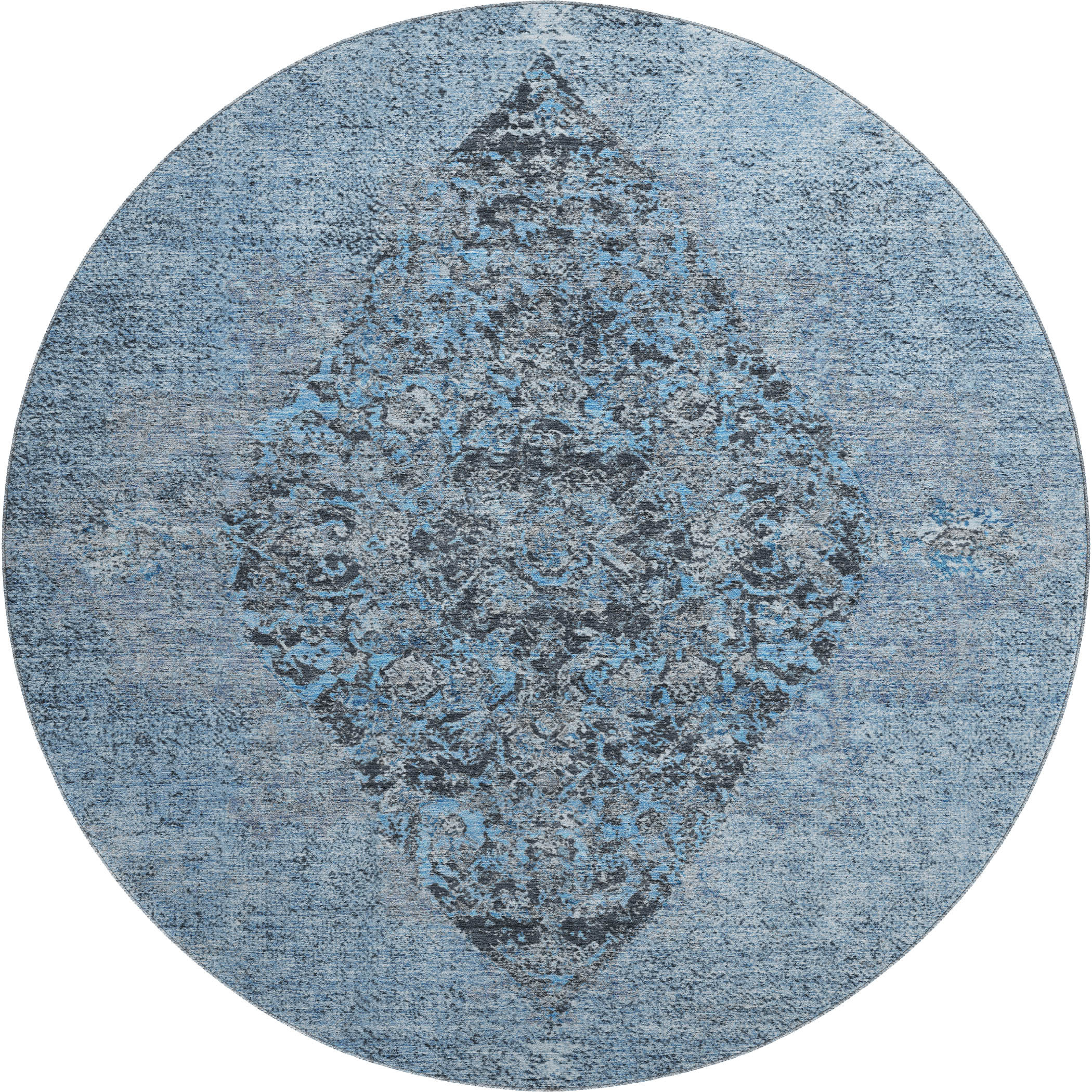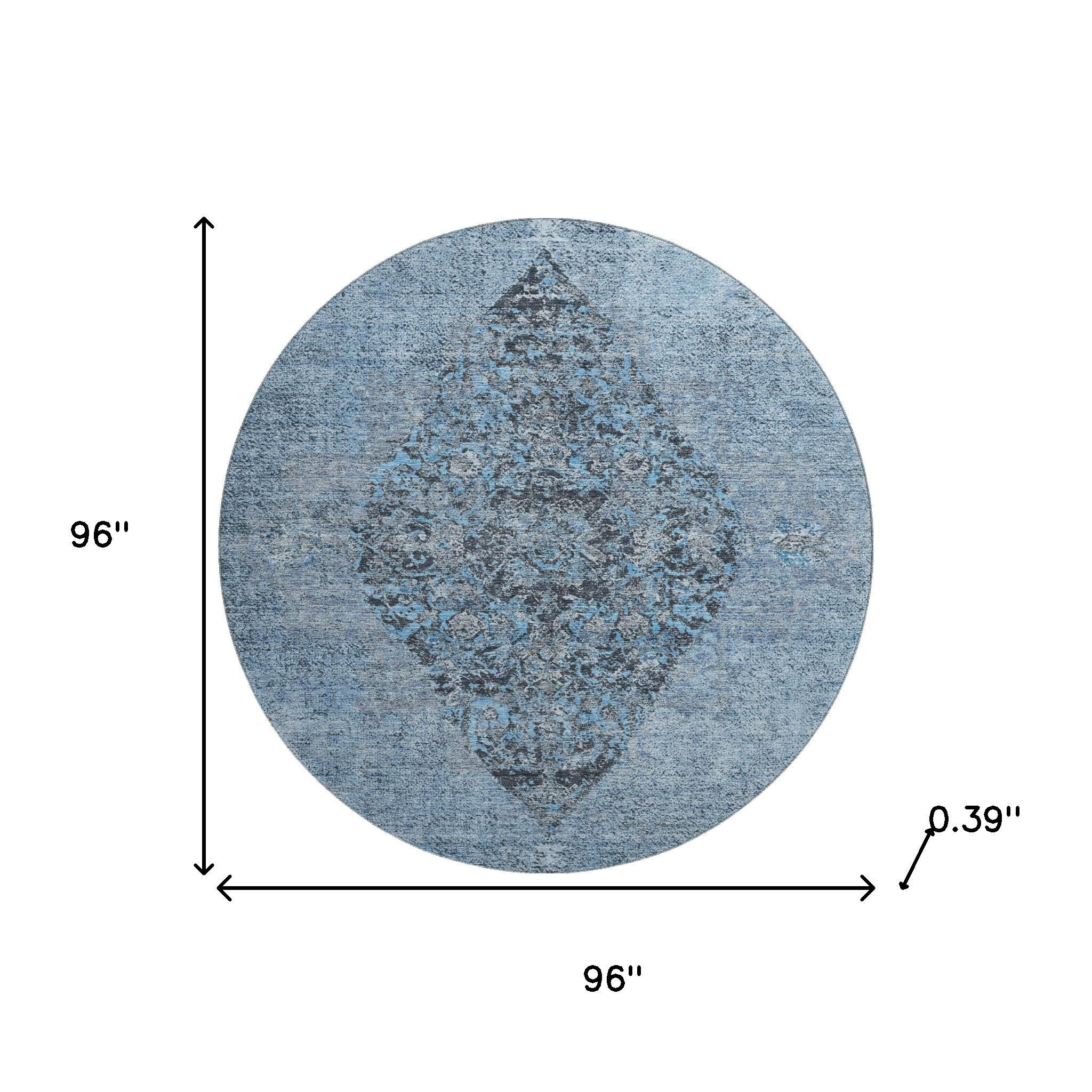 Add great coloration and comfortable texture to your space with this 8-foot denim blue and gray medallion washable round rug with uv protection. Ideal for spaces with kids and pets, this rug is stain resistant to help repel dirt and spilled liquids. Built to last, this rug crafted from polyester fibers is known for its durability and long lasting appeal. Rugs are a great way to showcase your style, hide imperfections, warm your home and reduce noise. This larger sized, traditional styled rug is ready to create a focal point or statement piece in your room. 96.00-inch h x 96.00-inch w x 0.39-inch d.